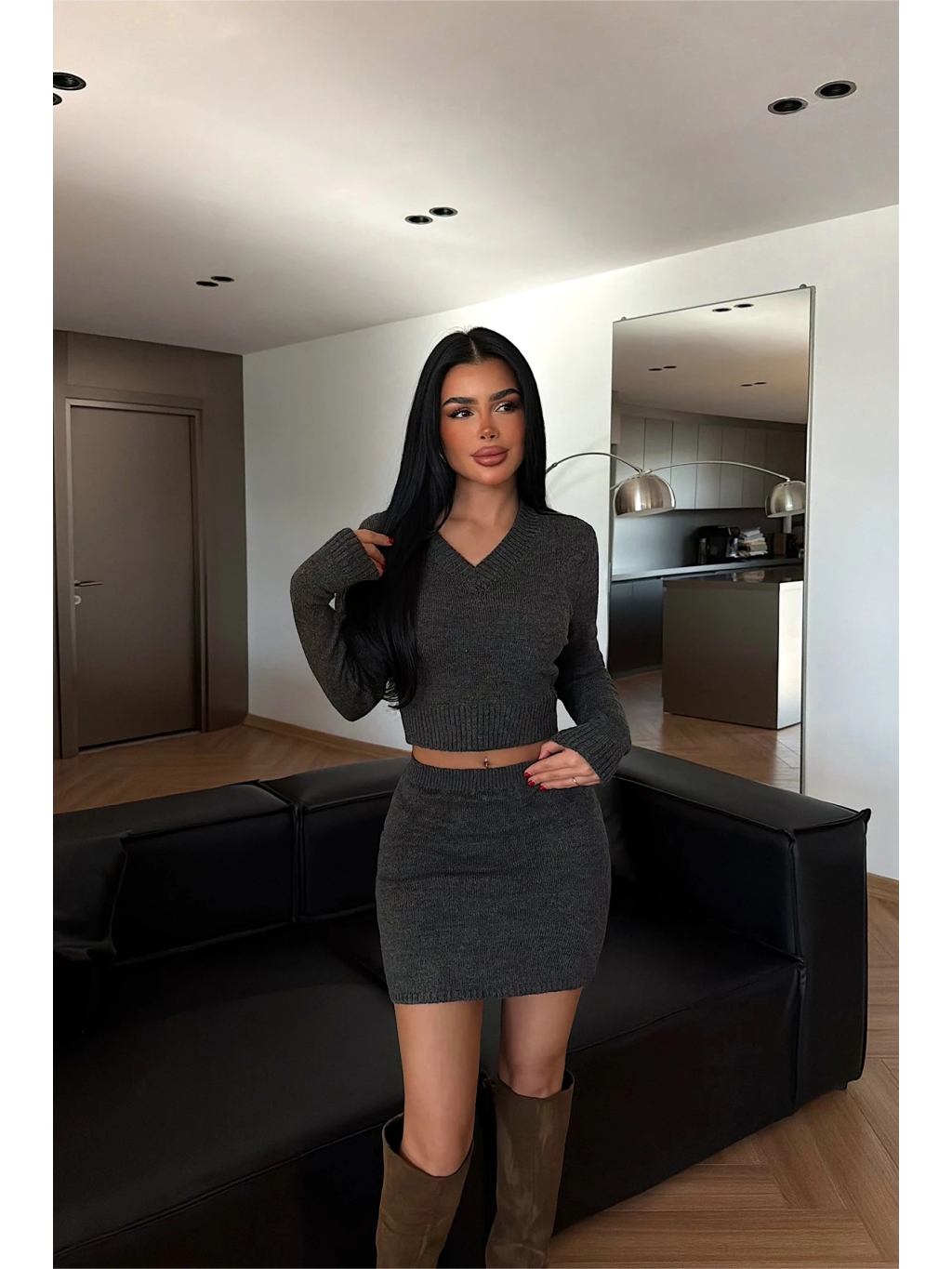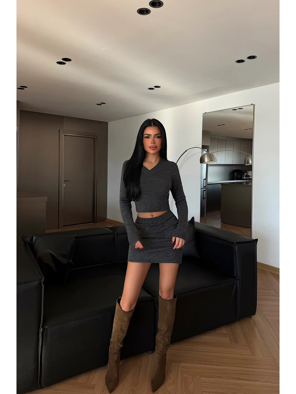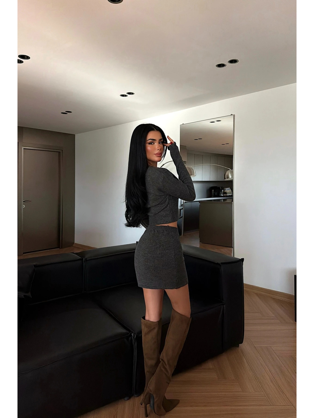 Tento antracitový pletený set se sukní je ideální volbou pro ženy, které milují čisté linie a nadčasový styl. Set se skládá z krátkého pleteného topu s dlouhým rukávem a přiléhavé sukně, která krásně kopíruje postavu a vytváří vyvážený, ženský look.