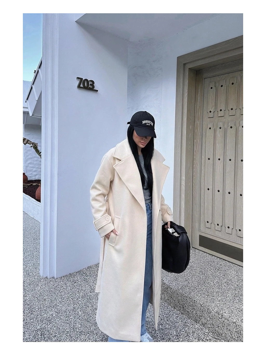 Elegantní béžový dlouhý kabát s čistými liniemi a nadčasovým střihem pro každodenní i městský outfit.