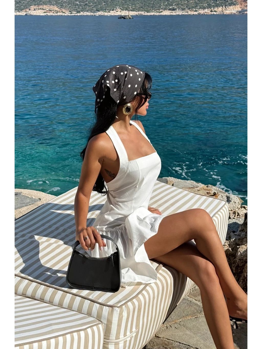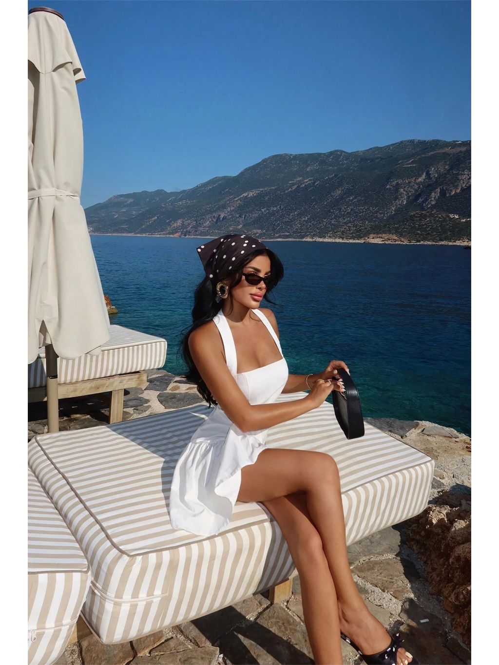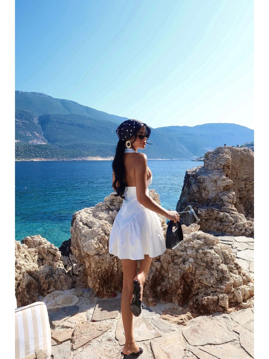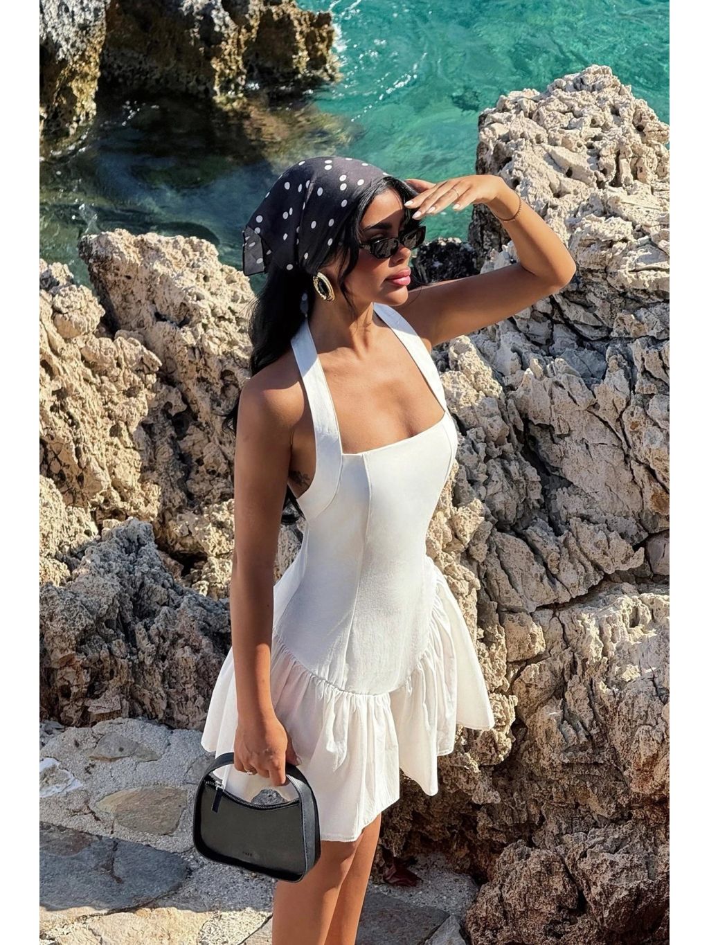 Bílé mini šaty s áčkovou sukní a výrazným halter střihem pro svěží letní look.