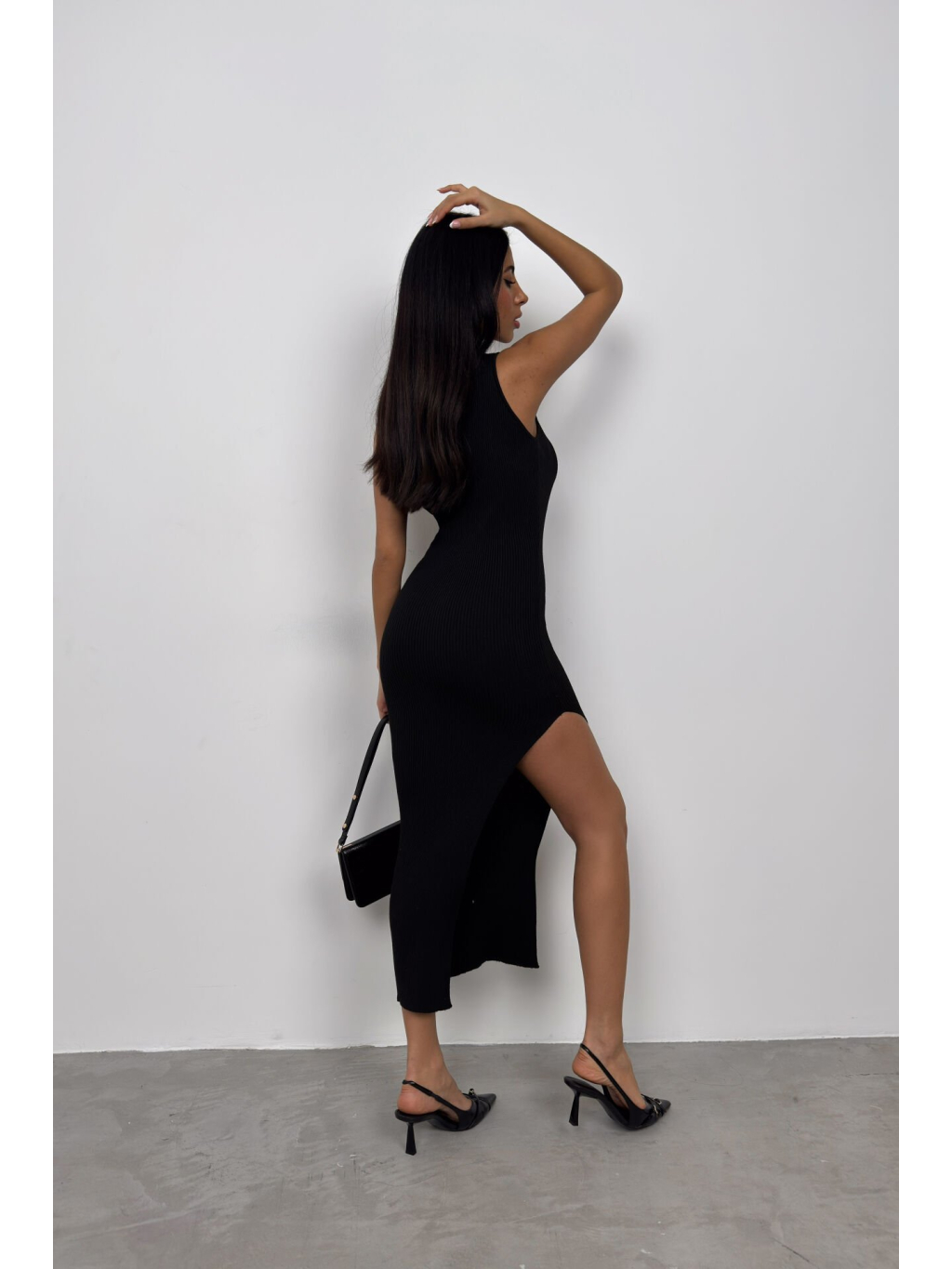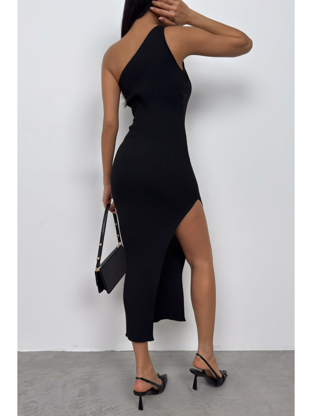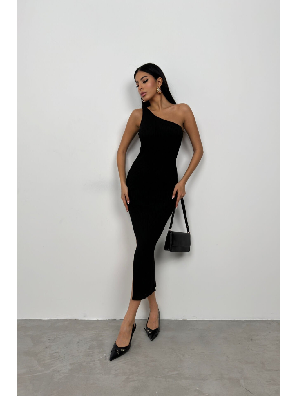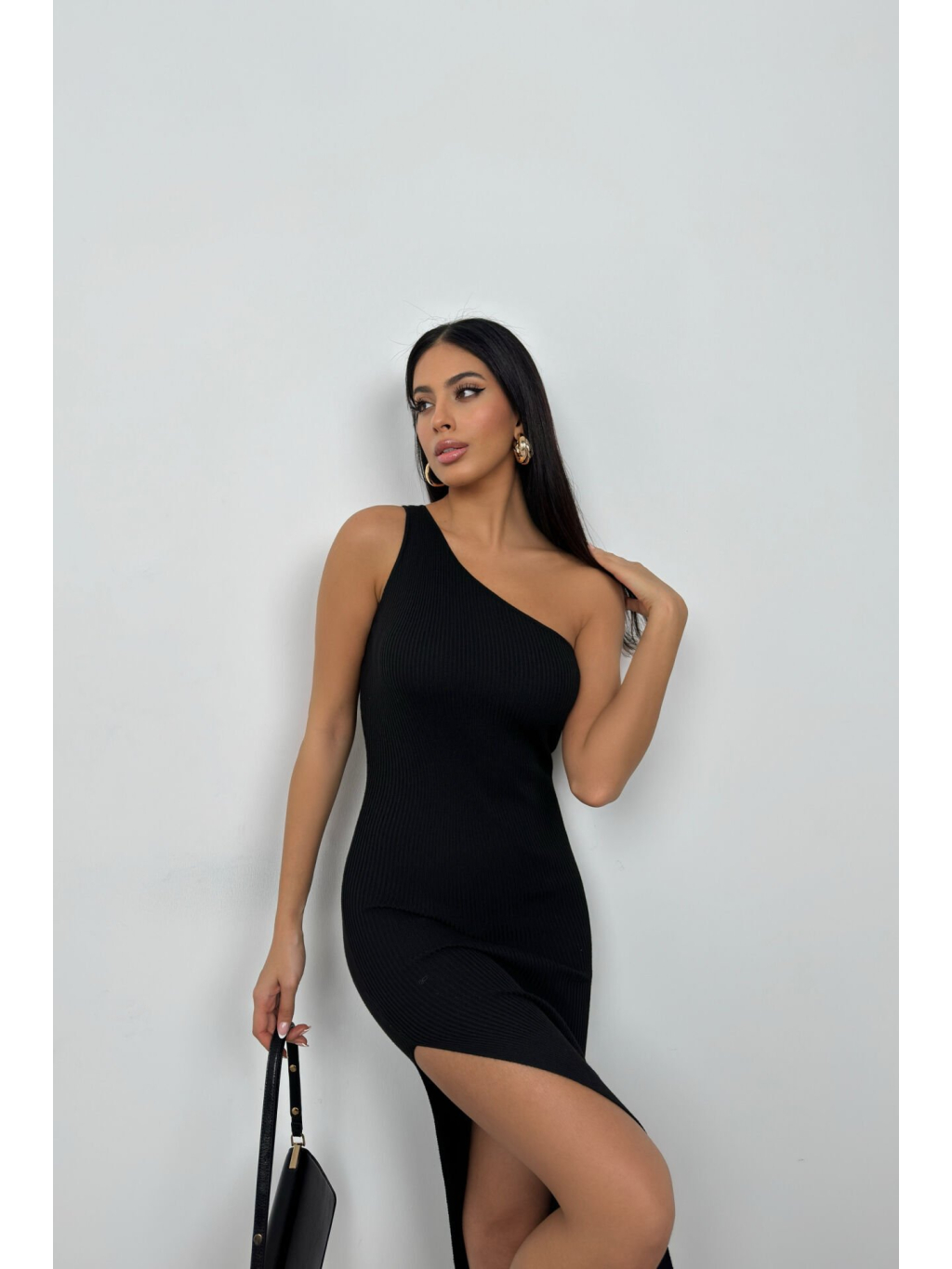 Tyto asymetrické maxi šaty v černé barvě působí mimořádně žensky a zároveň moderně. Střih na jedno rameno dodává outfitu šmrnc a zvýrazňuje linii ramen, zatímco vysoký boční rozparek dodává šatům svůdnost a prodlužuje siluetu. Materiál s jemným žebrováním se krásně přizpůsobí postavě a podtrhne její křivky, aniž by byl nepohodlný.