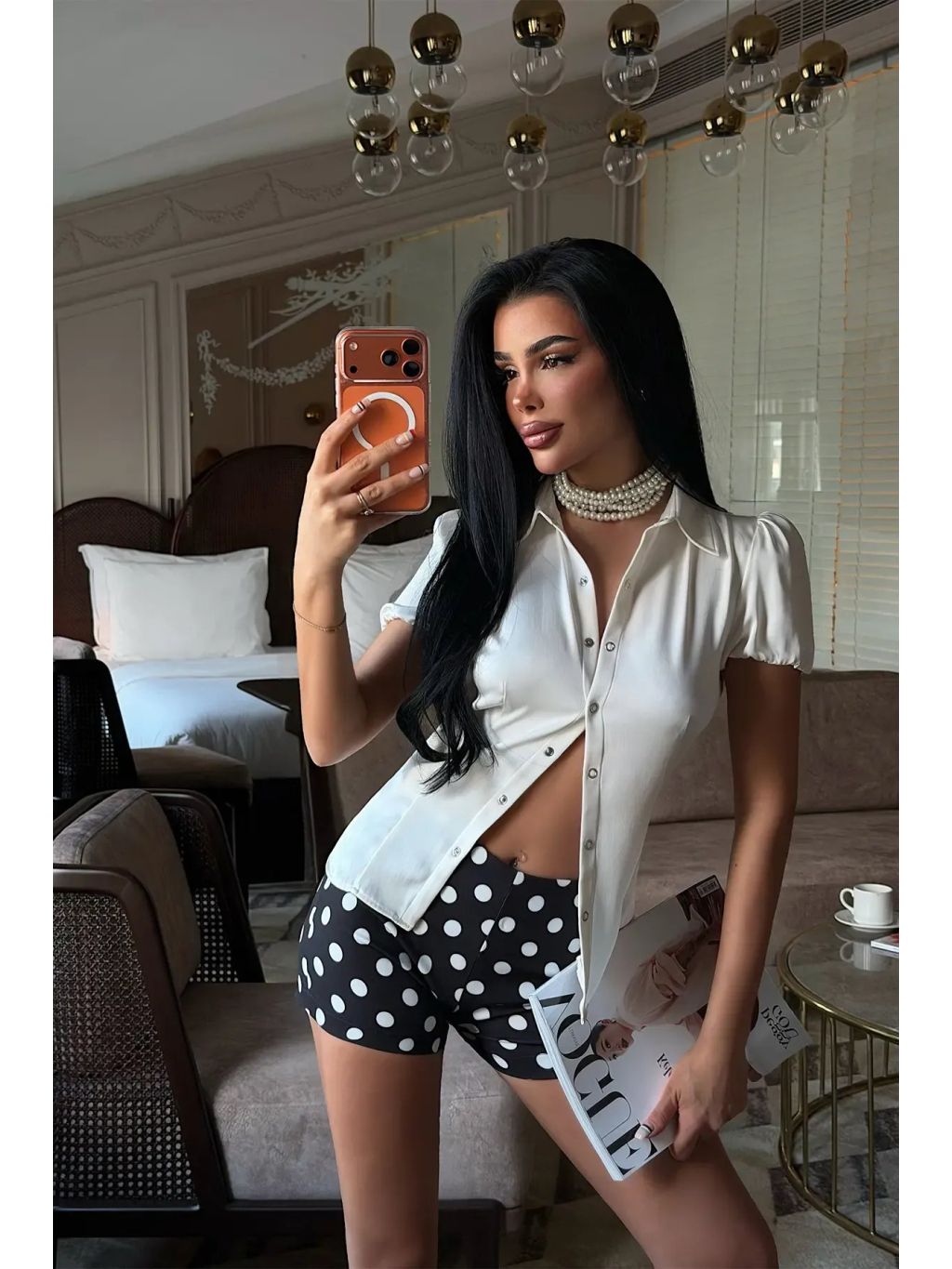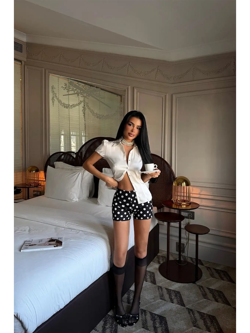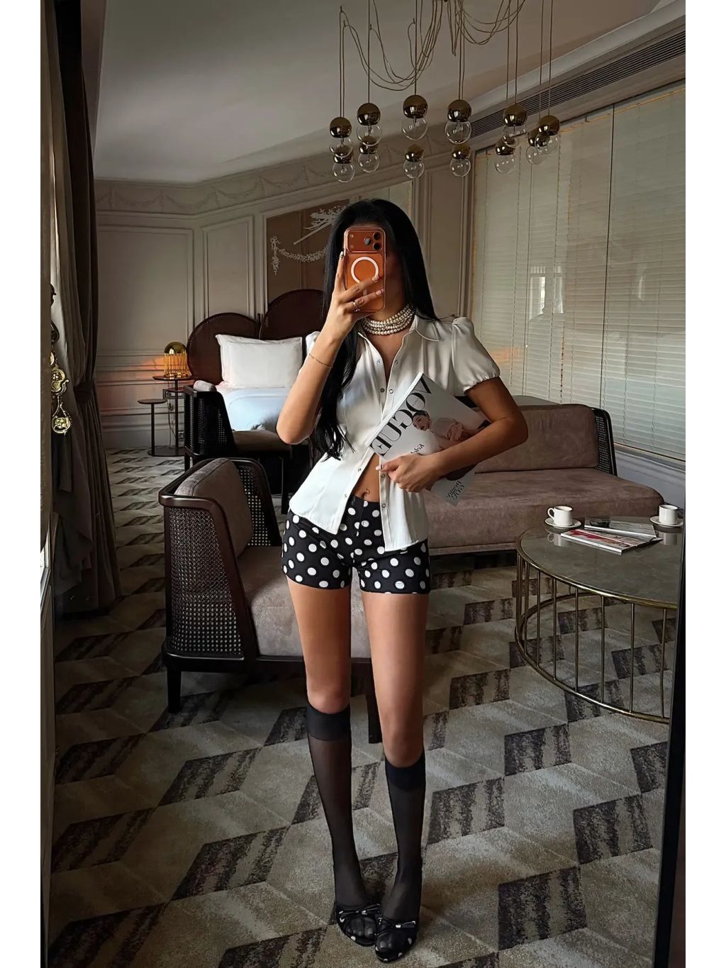 Tyto černé puntíkované kraťasy jsou perfektní kombinací elegance a hravosti. Kontrastní bílé puntíky dodávají outfitu stylový retro nádech, který nikdy nevyjde z módy.