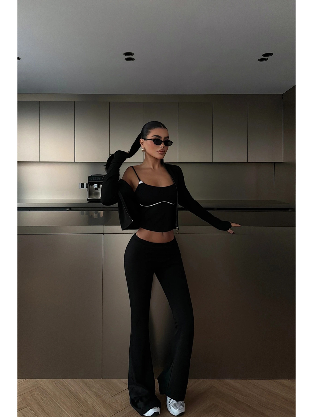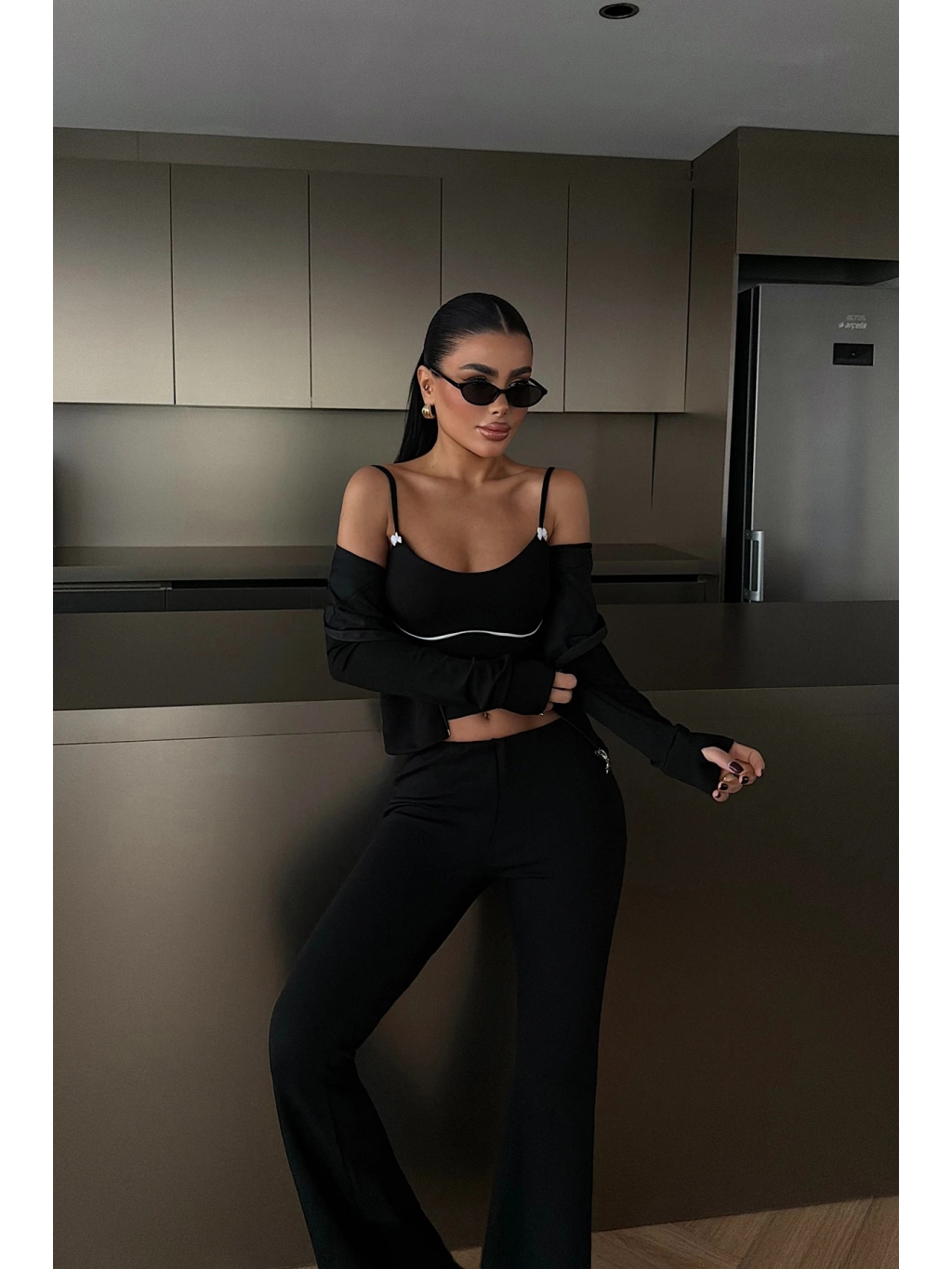 Tento černý set je ideální volbou pro ženy, které chtějí spojit minimalismus, pohodlí a současný fashion look. Set se skládá ze tří dílů – krátkého crop topu s jemně tvarovaným střihem, lehkého rozepínacího topu s dlouhým rukávem a dlouhých kalhot s rovnou nohavicí, které opticky prodlužují postavu.