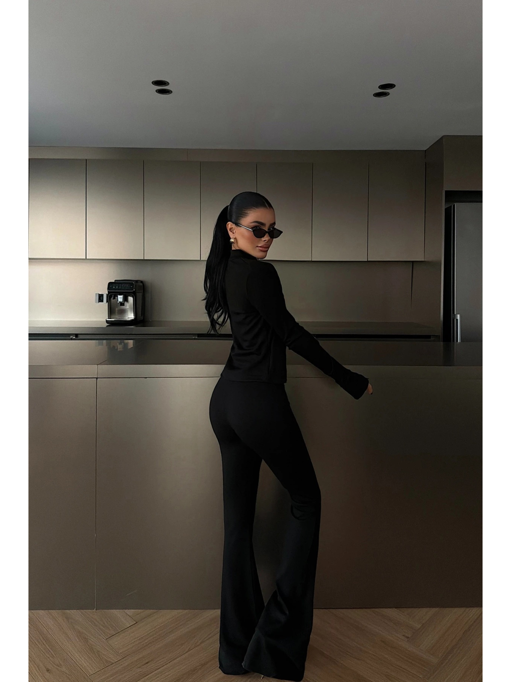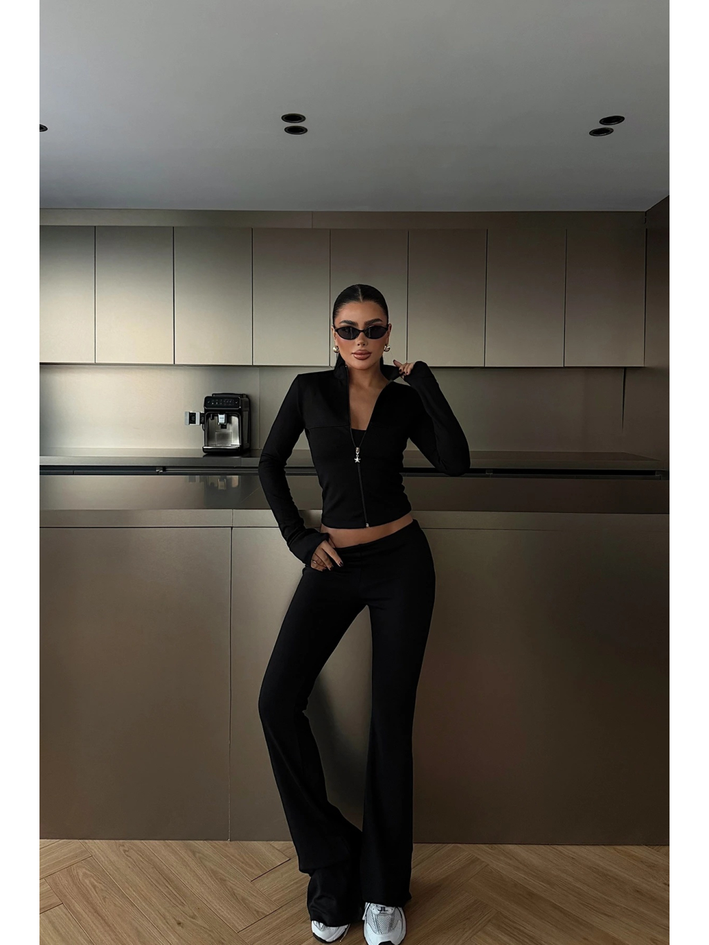 Elegantní černý set s crop topem, rozepínacím topem a dlouhými kalhotami – moderní silueta pro každodenní i stylový outfit.