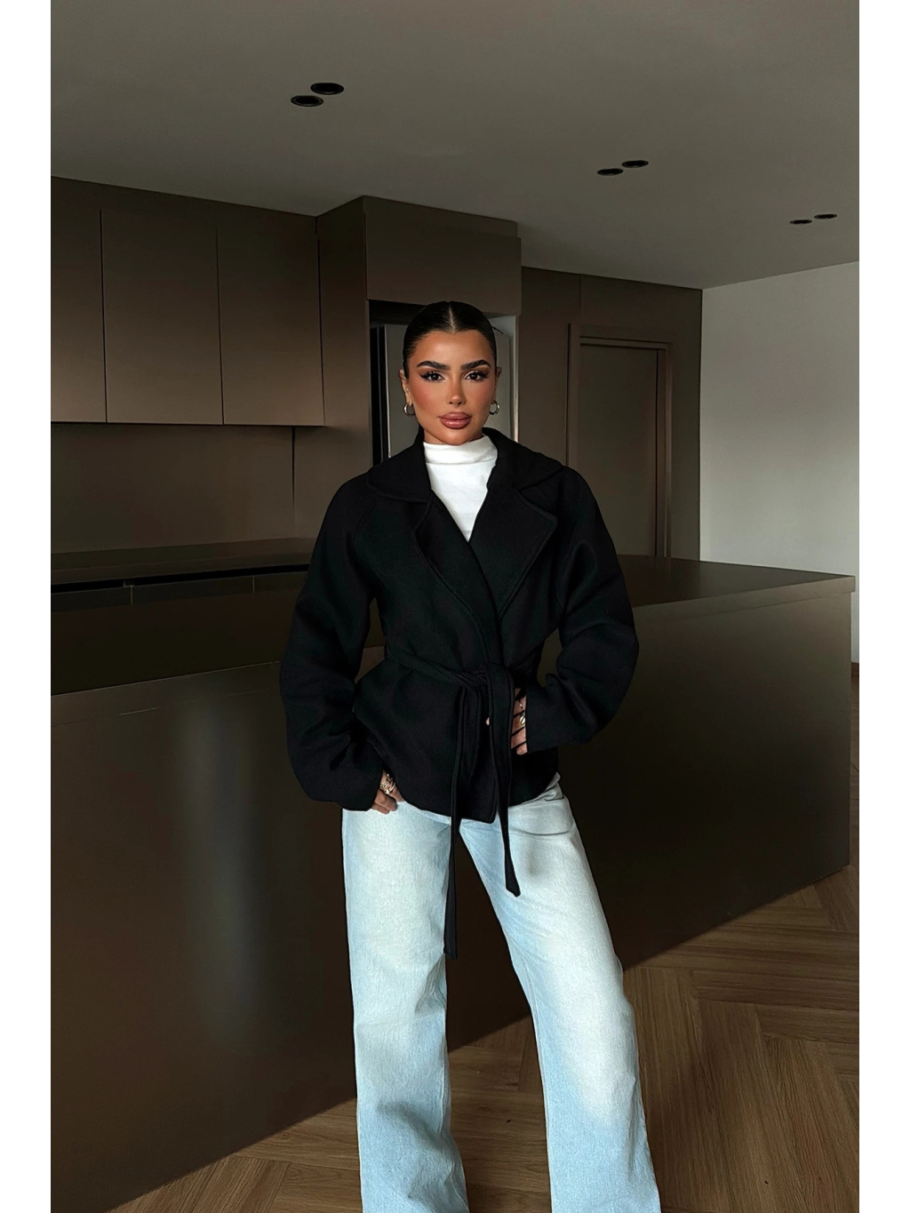 Krátký kabát Tenoris v černé barvě je nadčasový základ šatníku, který se snadno kombinuje a nikdy nevyjde z módy. Zavinovací střih s páskem zvýrazňuje siluetu a dodává outfitu elegantní, uhlazený vzhled.