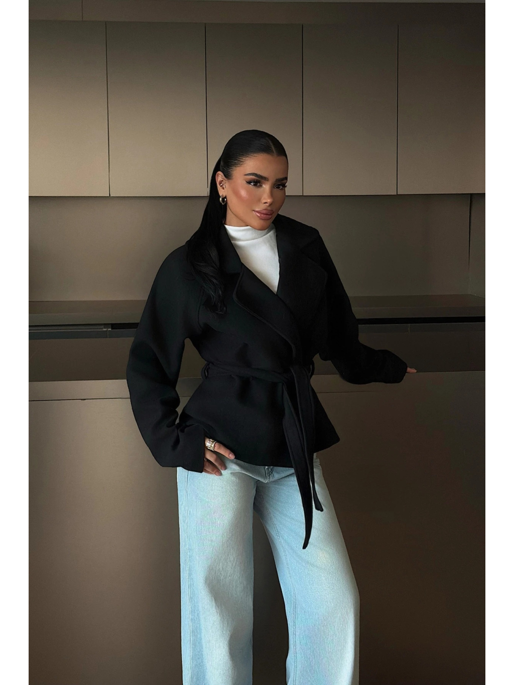 Elegantní černý krátký kabát s páskem v pase, nadčasový kousek pro čistý a sofistikovaný outfit.
