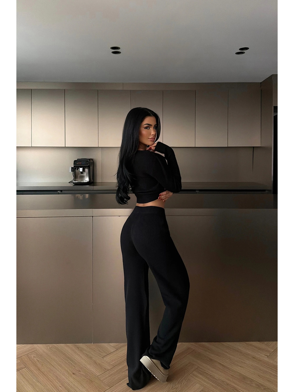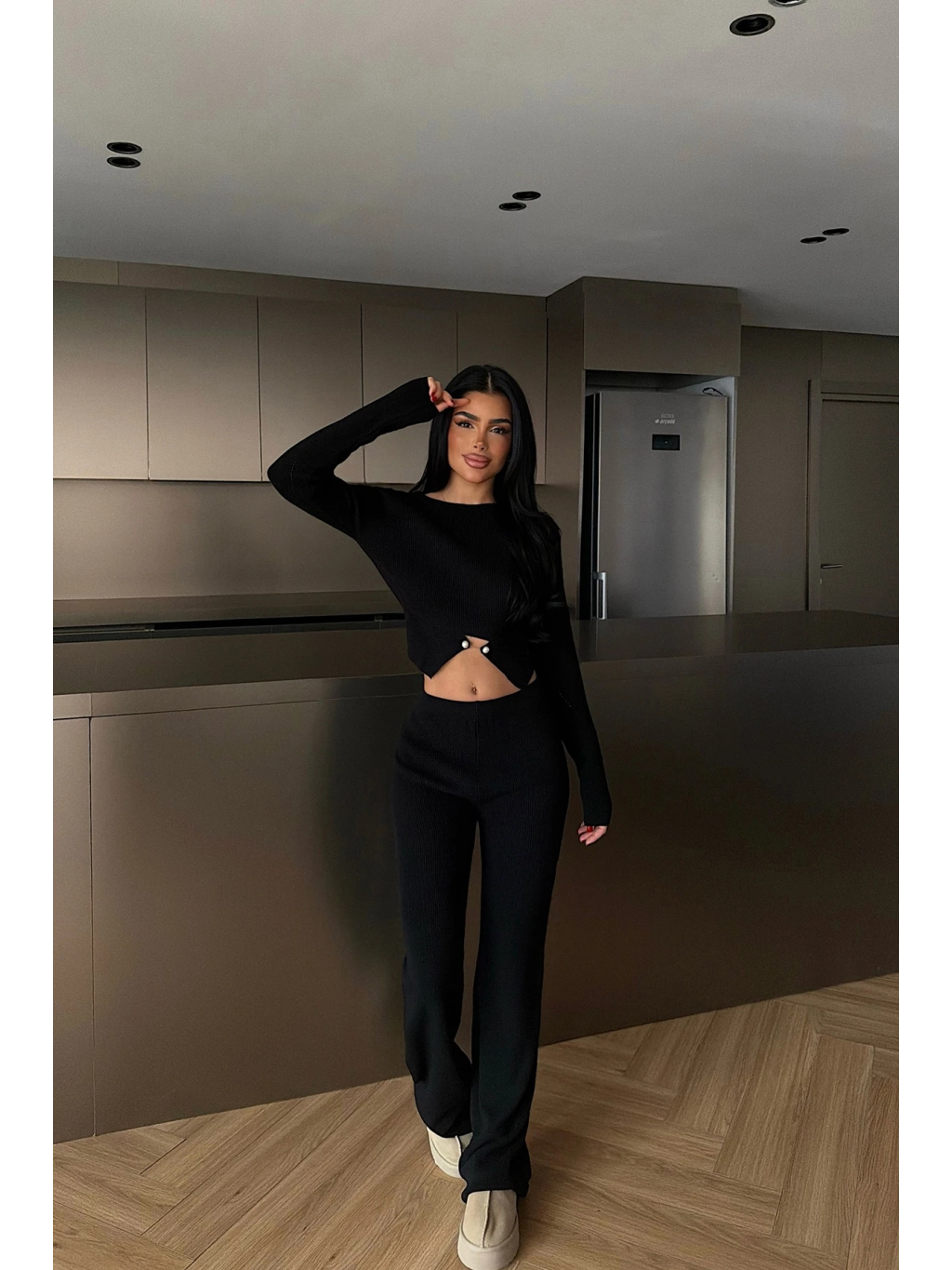 Černý pletený set s dlouhým topem a kalhotami, doplněný výrazným detailem zapínání v pase.