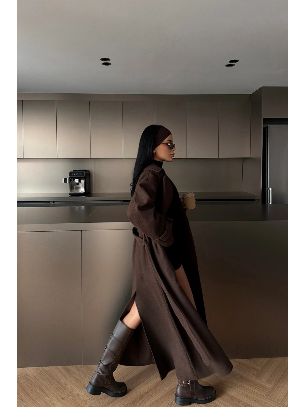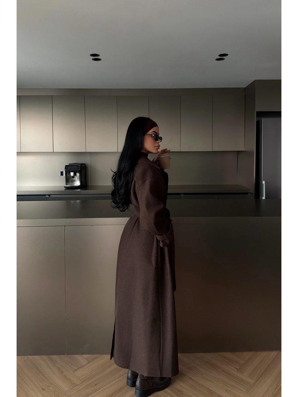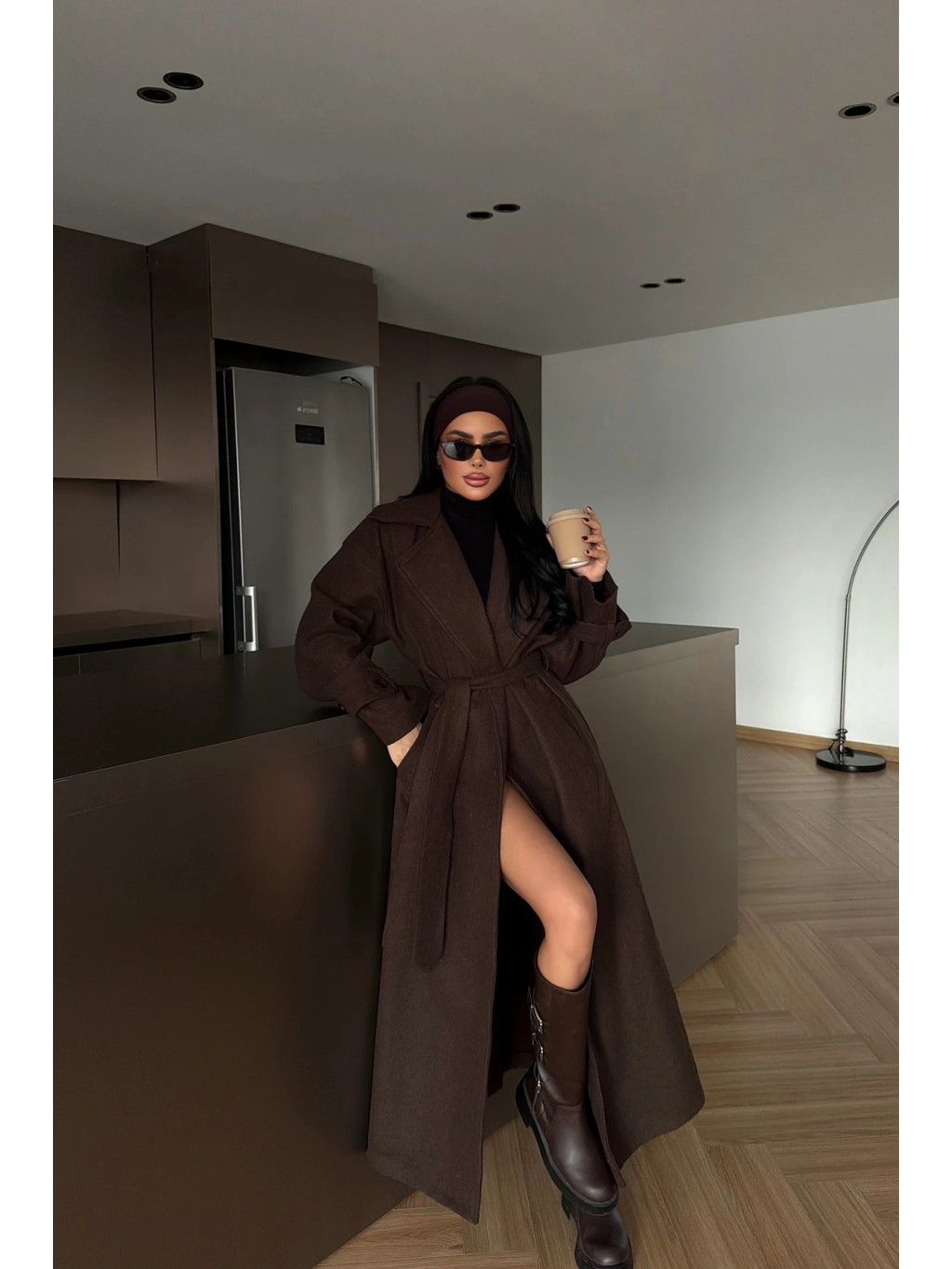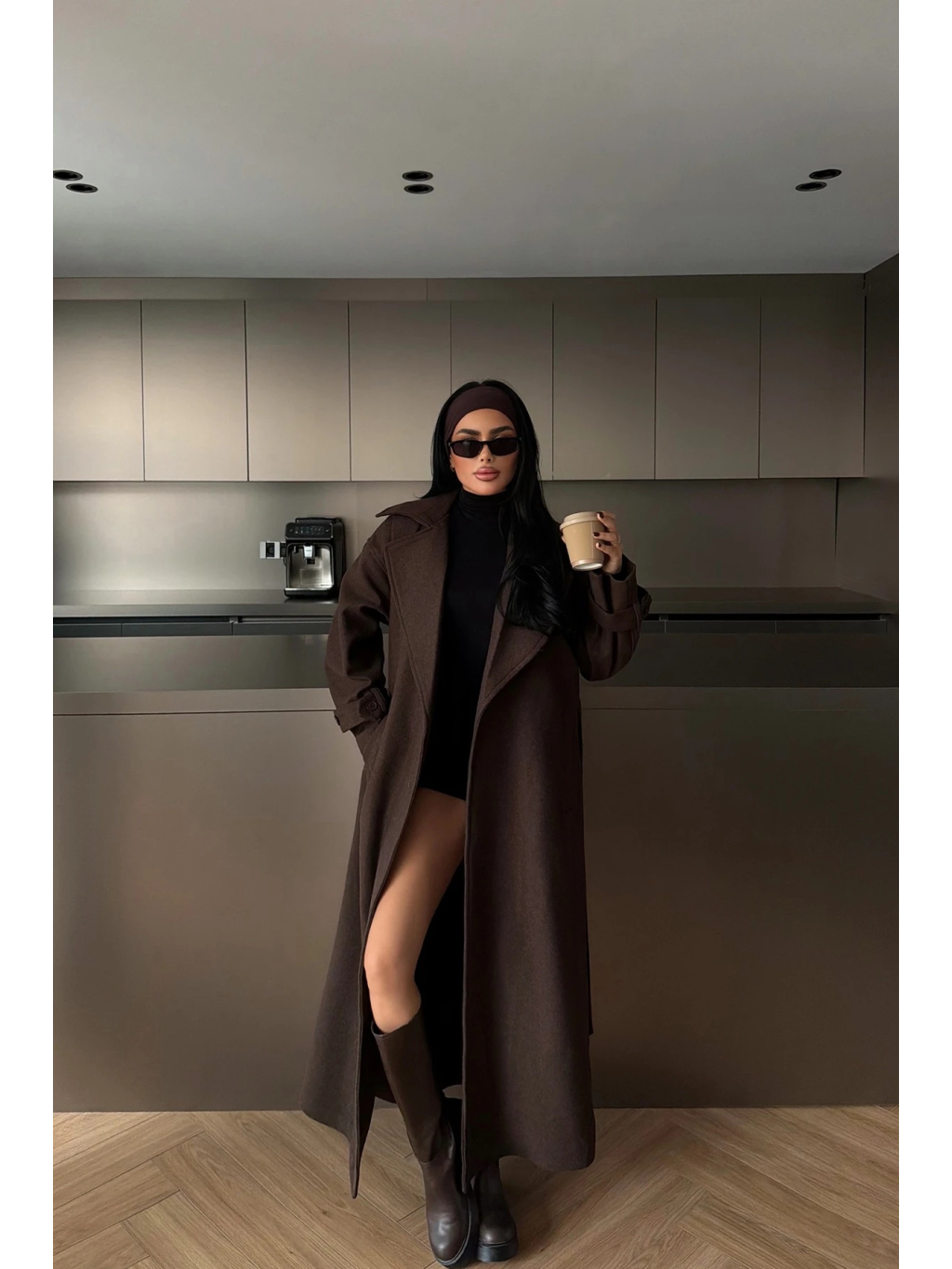 Materiál je příjemně pružný a pohodlný na nošení, kabát má pásek ve stejné barvě pro stažení v pase a praktické kapsy. Tmavě hnědý odstín se snadno kombinuje s černou, béžovou, krémovou i denimem a vypadá skvěle s kozačkami i teniskami.