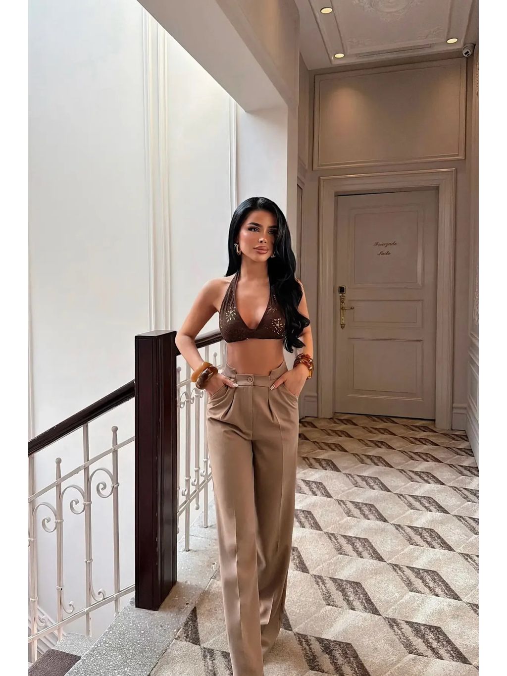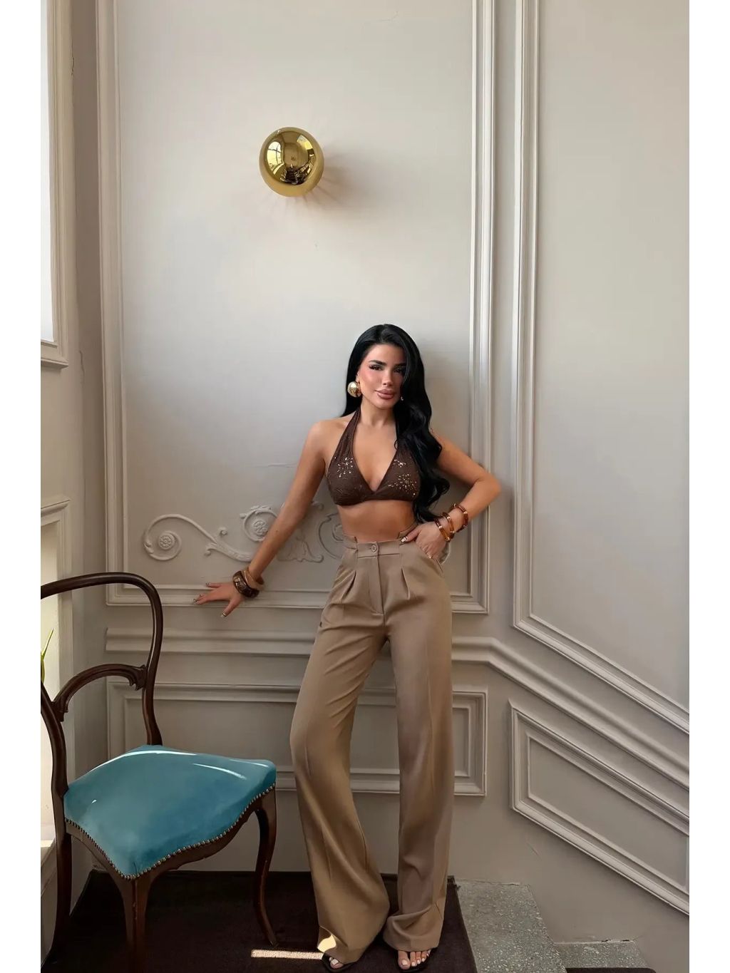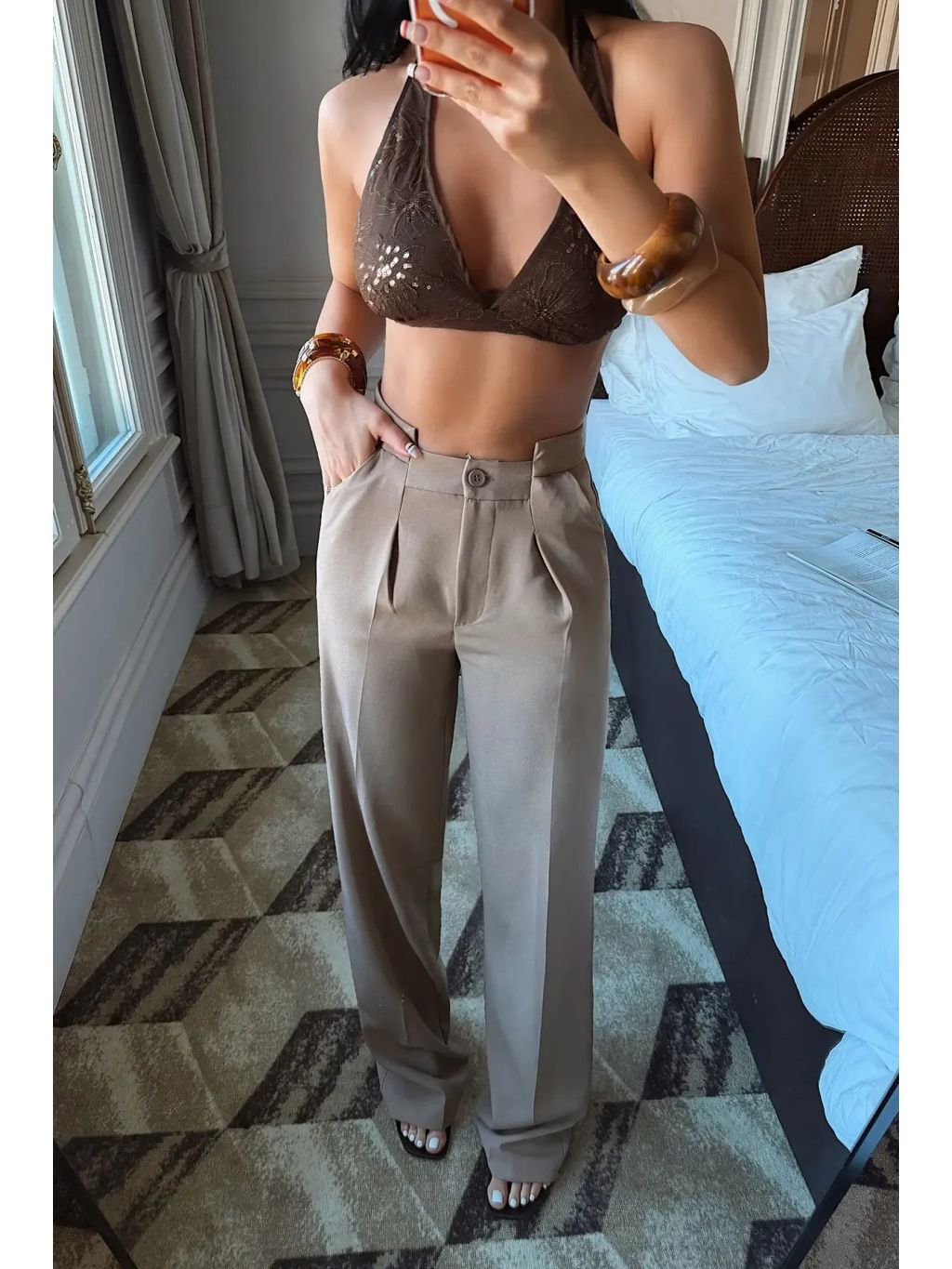 Hnědé elegantní kalhoty s vysokým pasem a širokými nohavicemi – čistý a sofistikovaný základ outfitu.