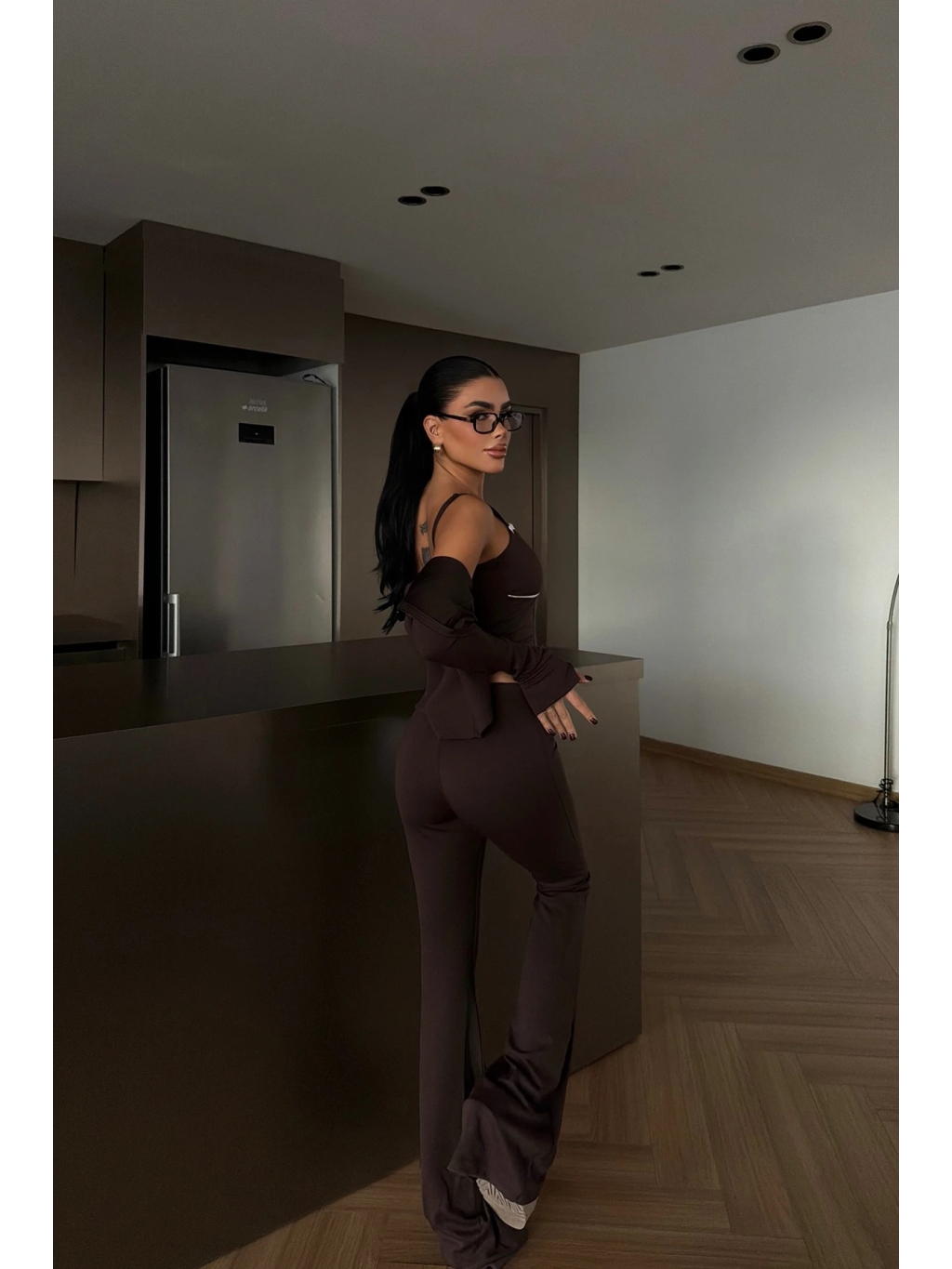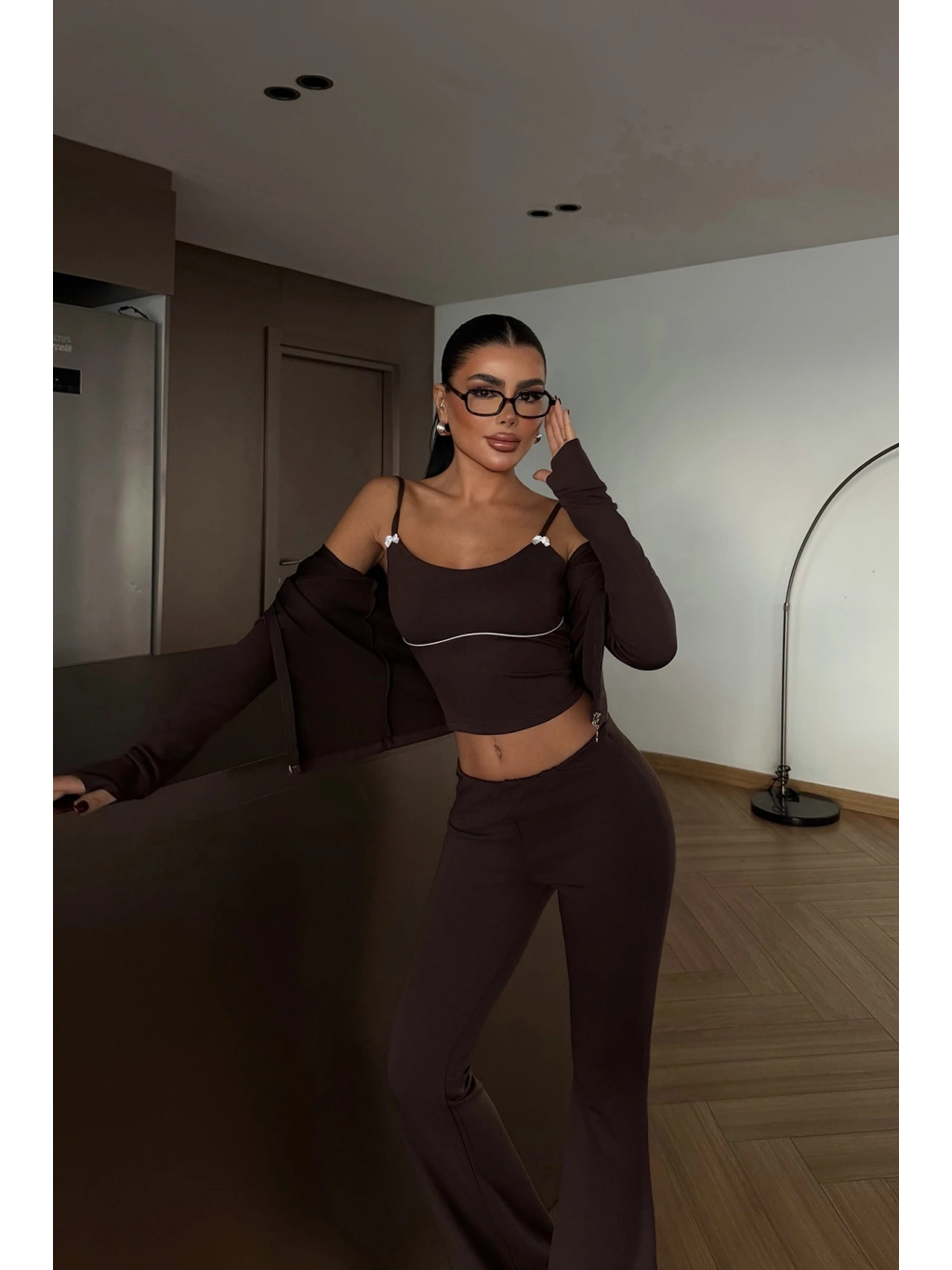Stylový dvoudílný set v hnědé barvě je ideální volbou pro každodenní nošení i výrazný městský outfit. Set se skládá z crop topu na ramínka, krátké rozepínací mikiny s dlouhým rukávem a kalhot s vysokým pasem a rovnými nohavicemi. Celek působí elegantně, čistě a velmi ženským dojmem.