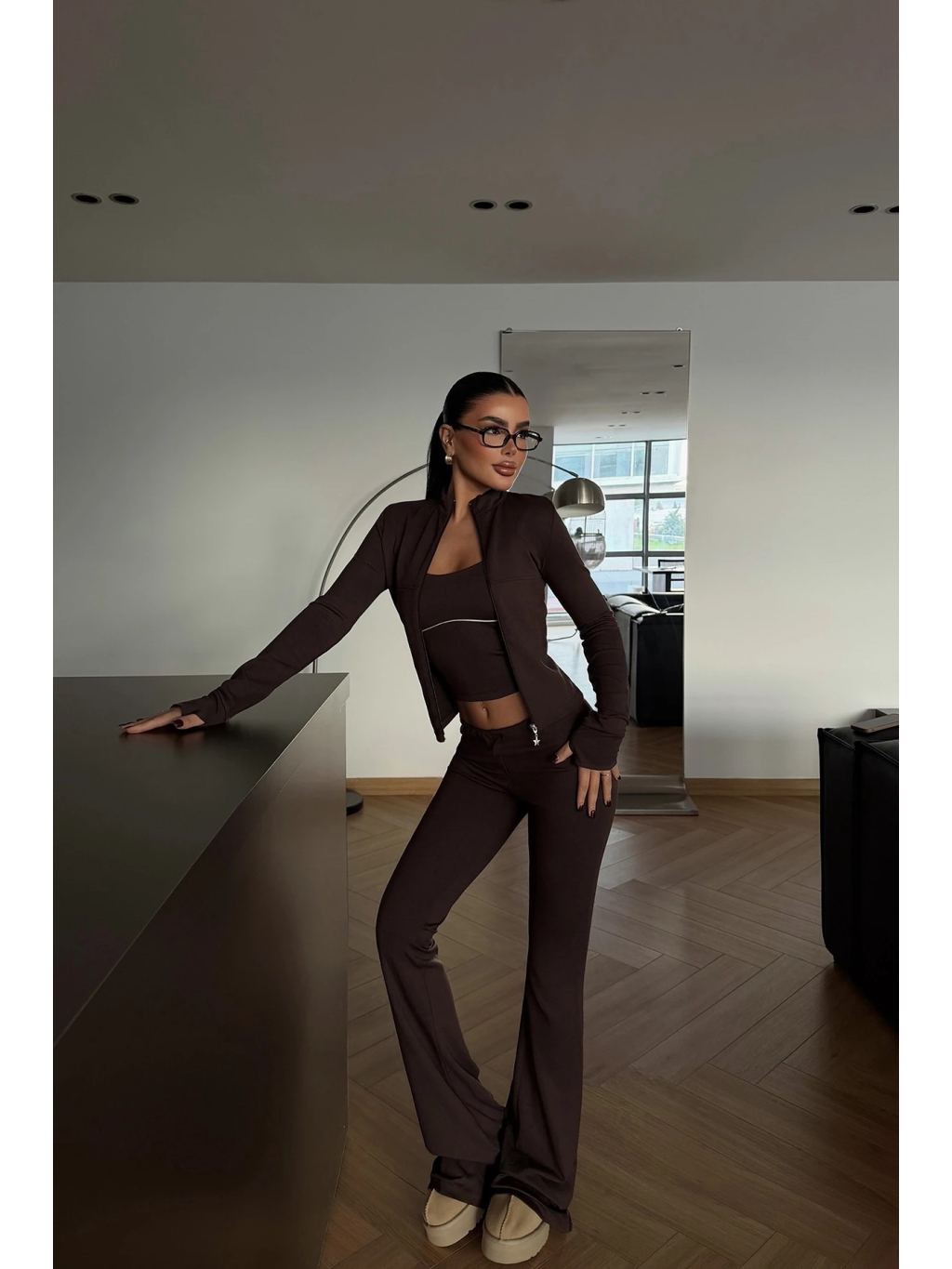 Hnědý dámský crop top set s rozepínací mikinou a kalhotami s rovnými nohavicemi v moderním minimalistickém stylu.