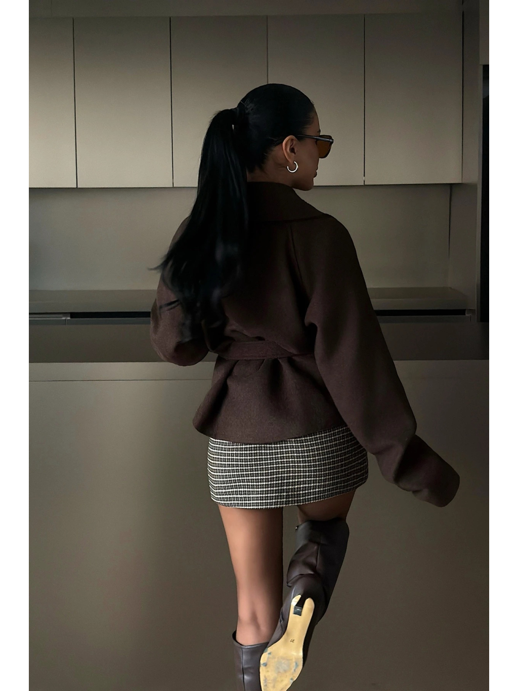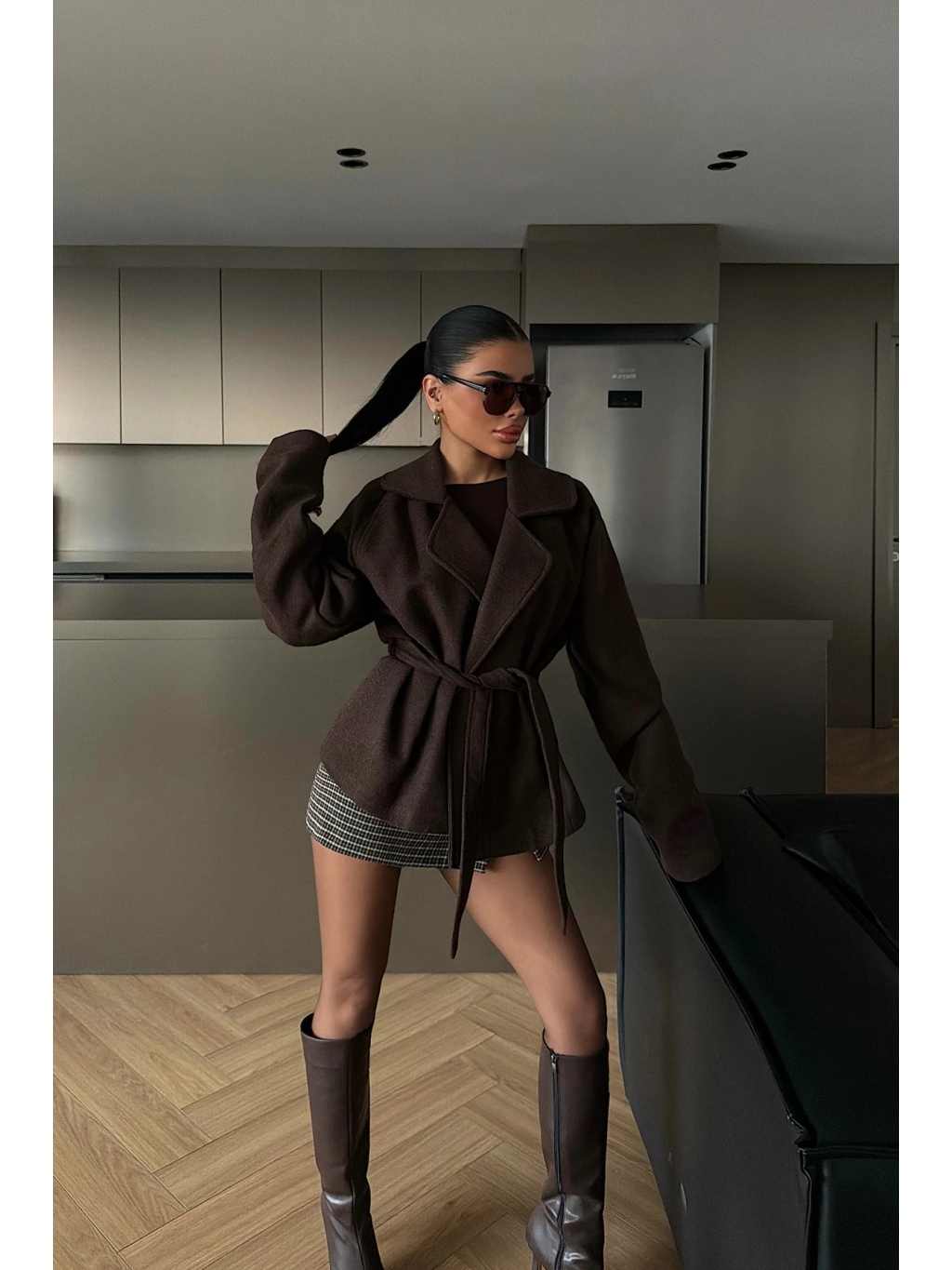 Krátký kabát Tenoris v hnědé barvě přináší sofistikovaný vzhled s nádechem přirozené elegance. Zavinovací střih s páskem krásně zvýrazňuje pas a dodává outfitu ženskou siluetu.
