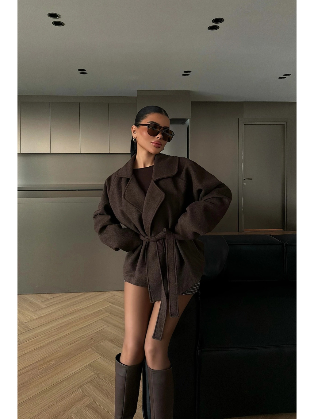 Stylový hnědý krátký kabát s páskem v pase, ideální pro teplé a elegantní kombinace.