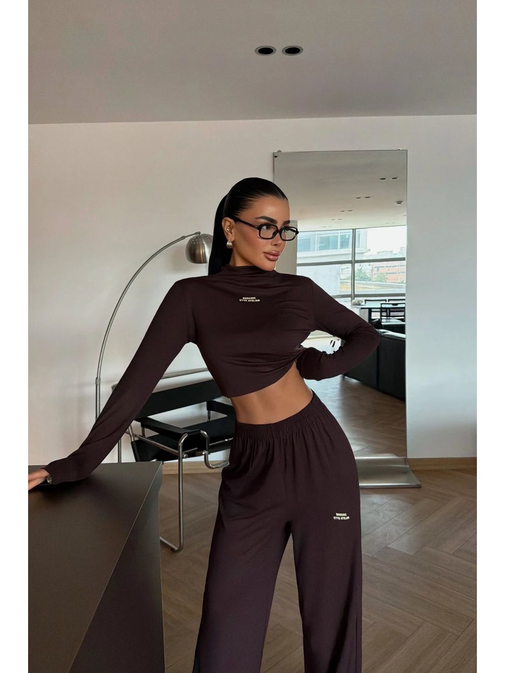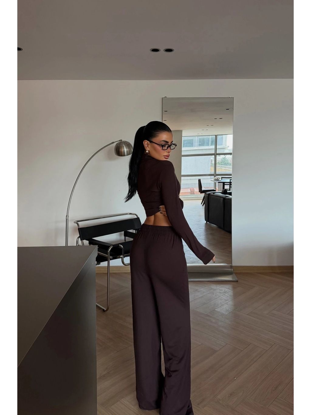 Tento hnědý set Revees kombinuje čistý design s maximálním komfortem. Kratší top s dlouhým rukávem a jemným stojáčkem vytváří moderní siluetu, zatímco volné kalhoty s elastickým pasem zajišťují pohodlné nošení po celý den. Lehký a pružný materiál se příjemně přizpůsobí postavě a je ideální jak na volný čas, tak na stylový městský look.
