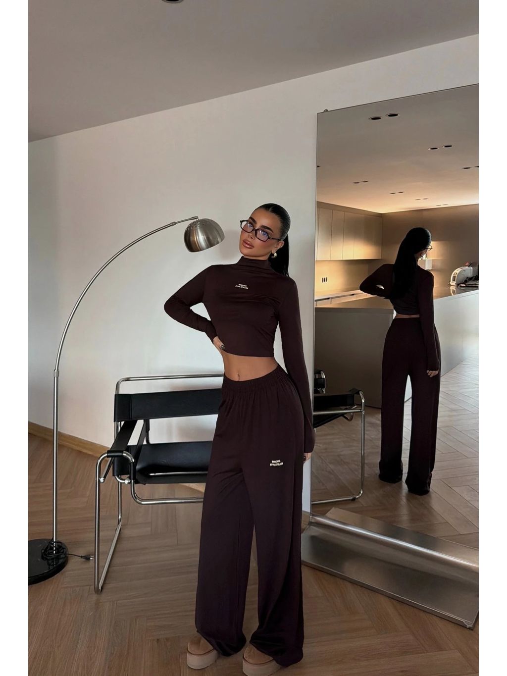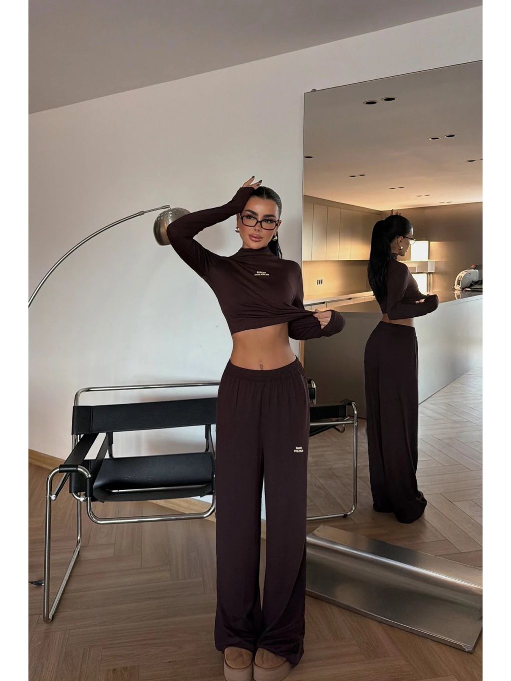 Hnědý minimalistický set s dlouhým topem a volnými kalhotami pro pohodlný a moderní outfit.
