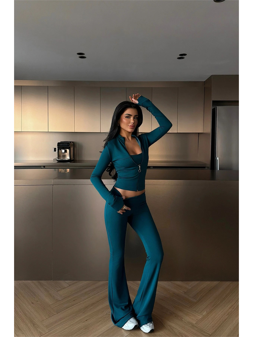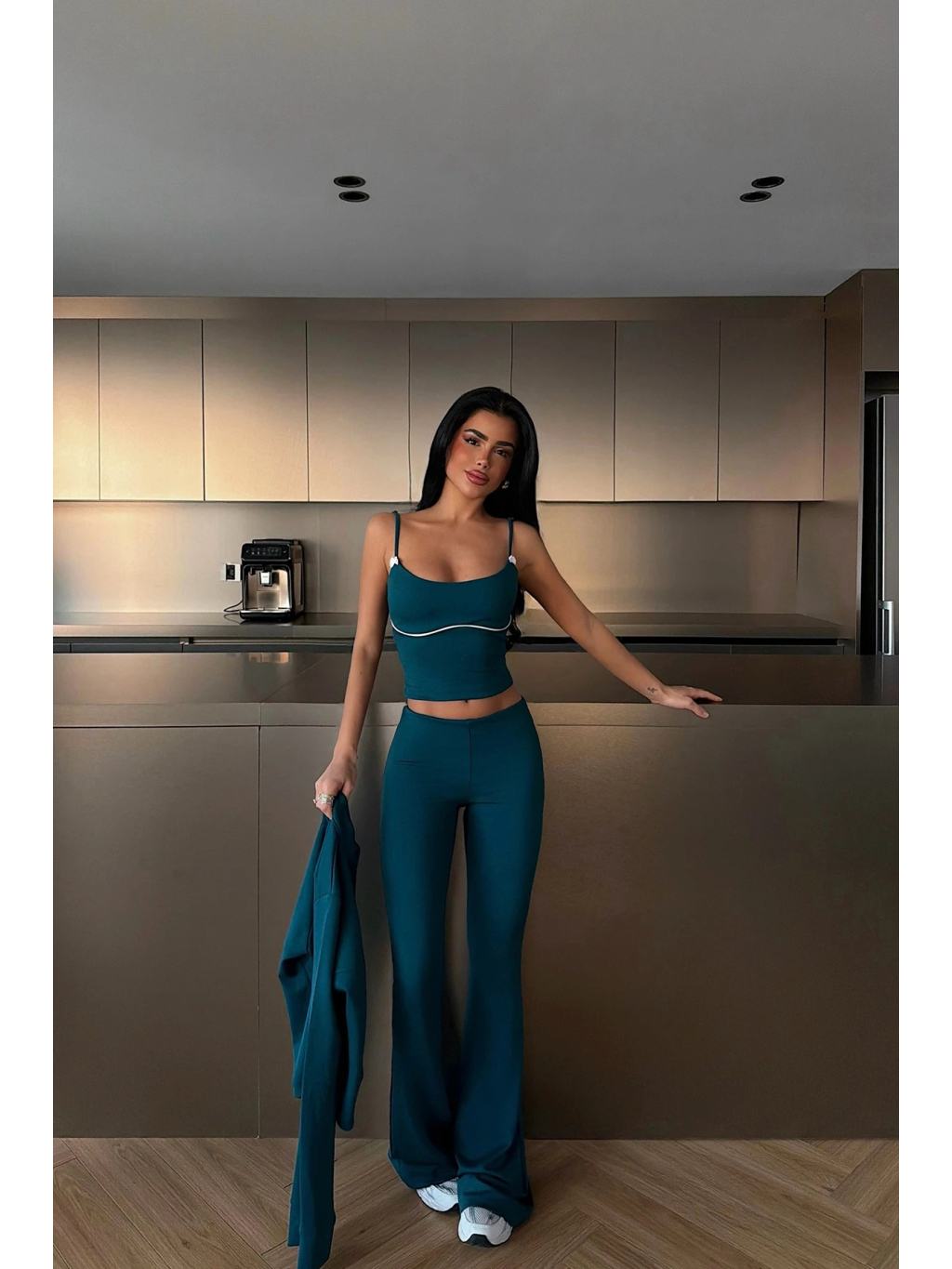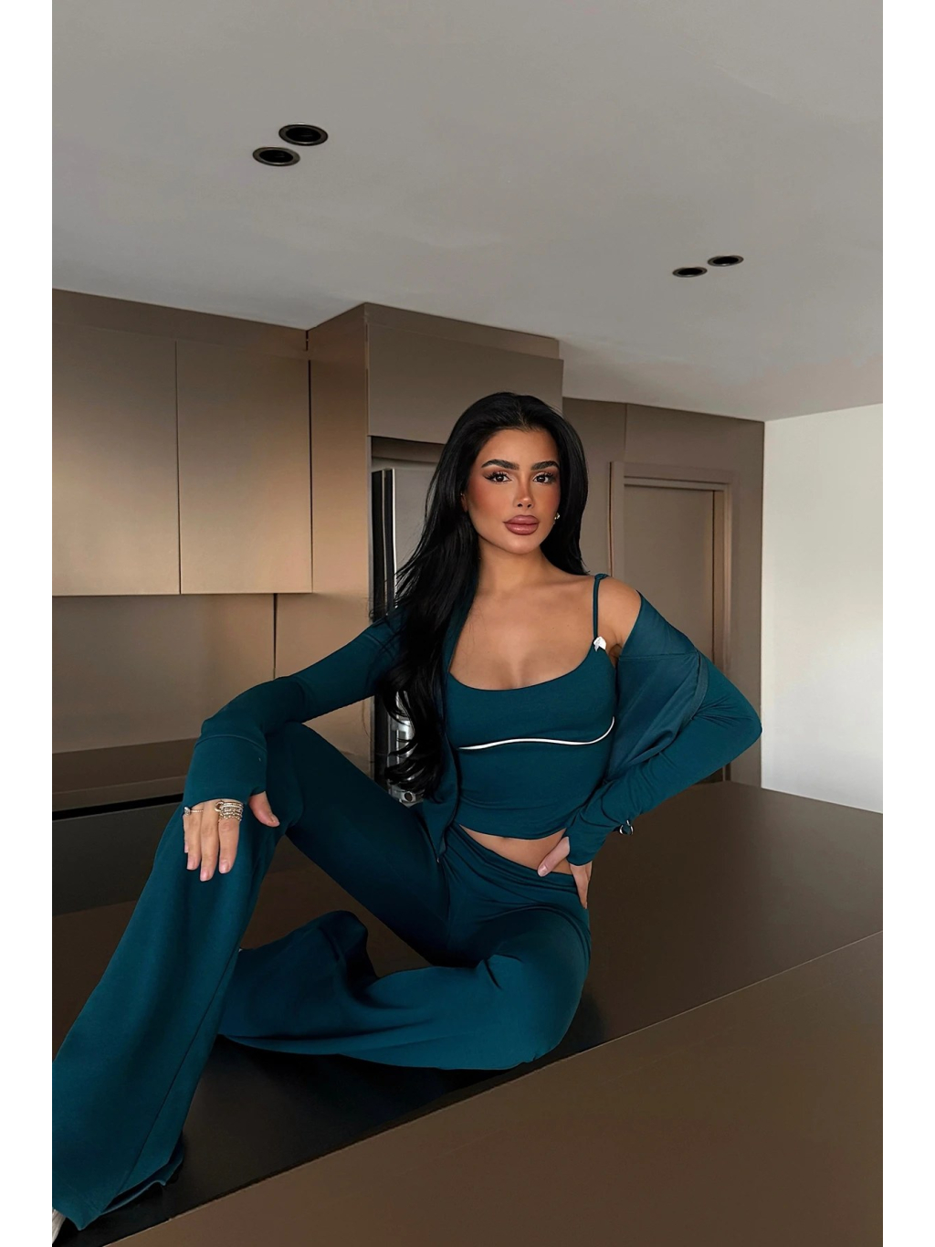 Tento petrolejový set je ideální volbou pro ženy, které chtějí spojit minimalismus, pohodlí a současný fashion look. Set se skládá ze tří dílů – krátkého crop topu s jemně tvarovaným střihem, lehkého rozepínacího topu s dlouhým rukávem a dlouhých kalhot s rovnou nohavicí, které opticky prodlužují postavu.