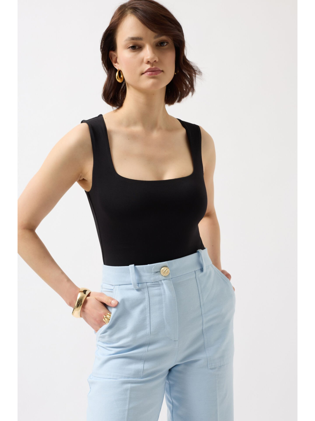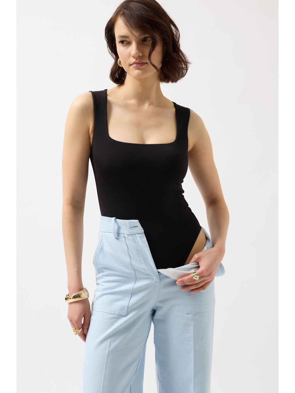 Elegantní černý body s hranatým výstřihem – nadčasový základ pro každý šatník.
