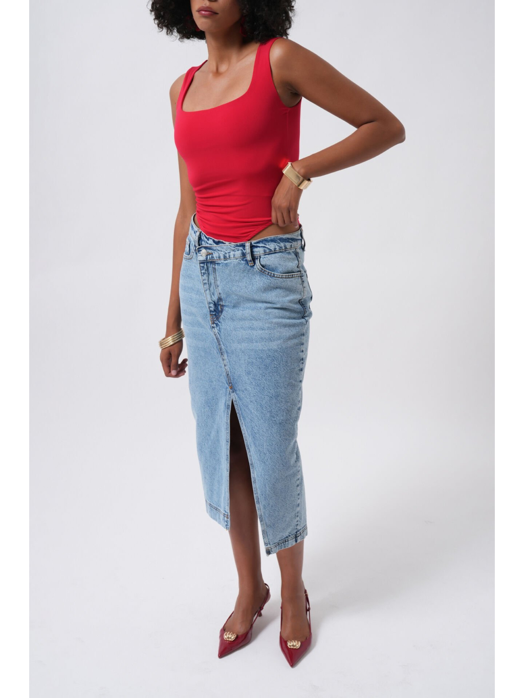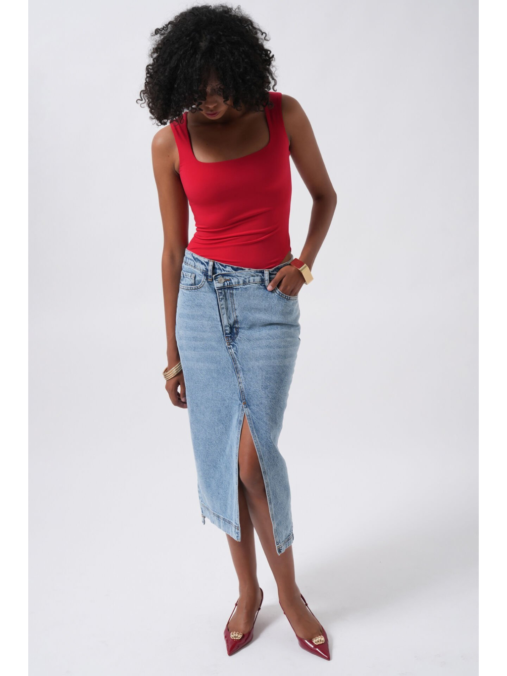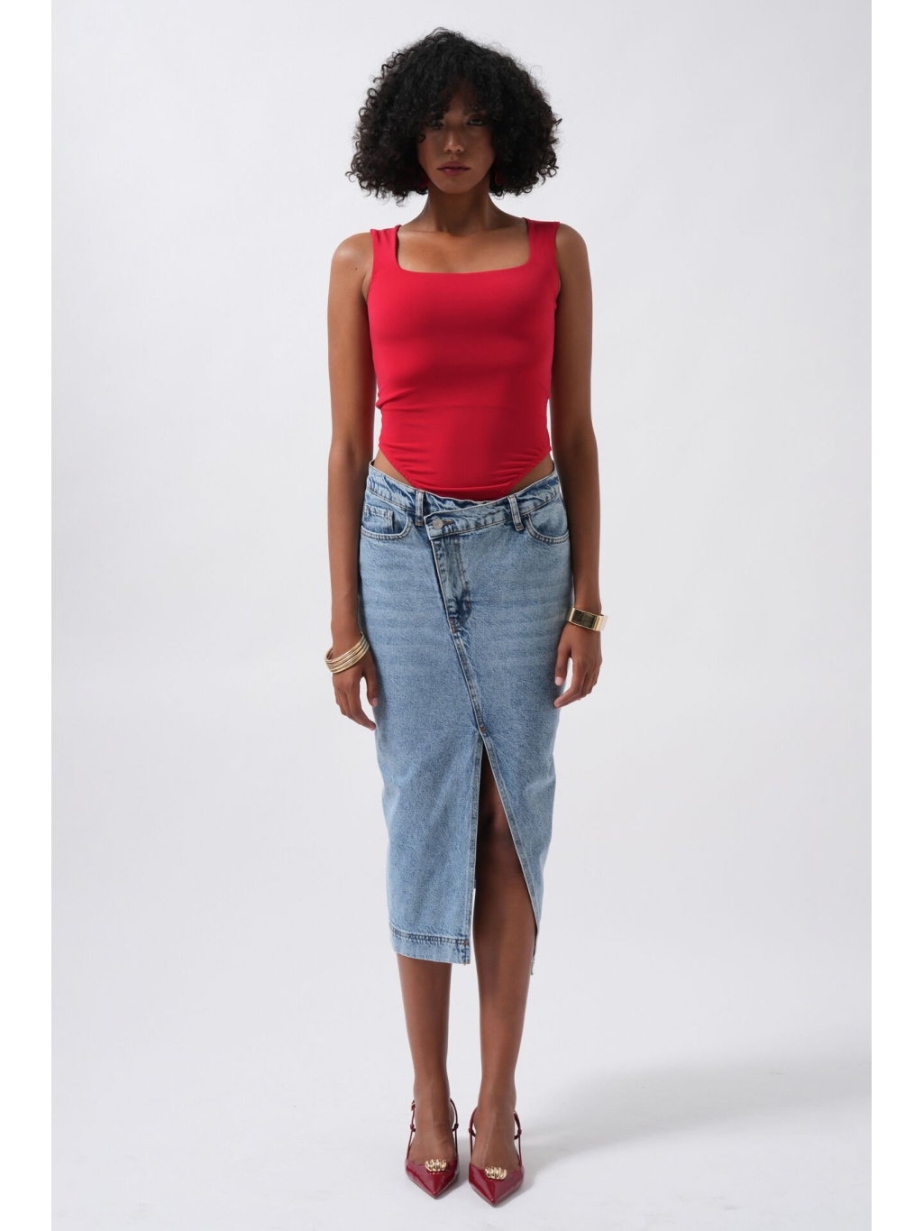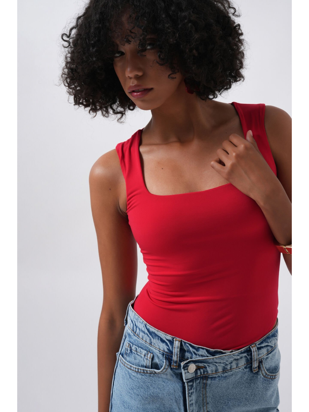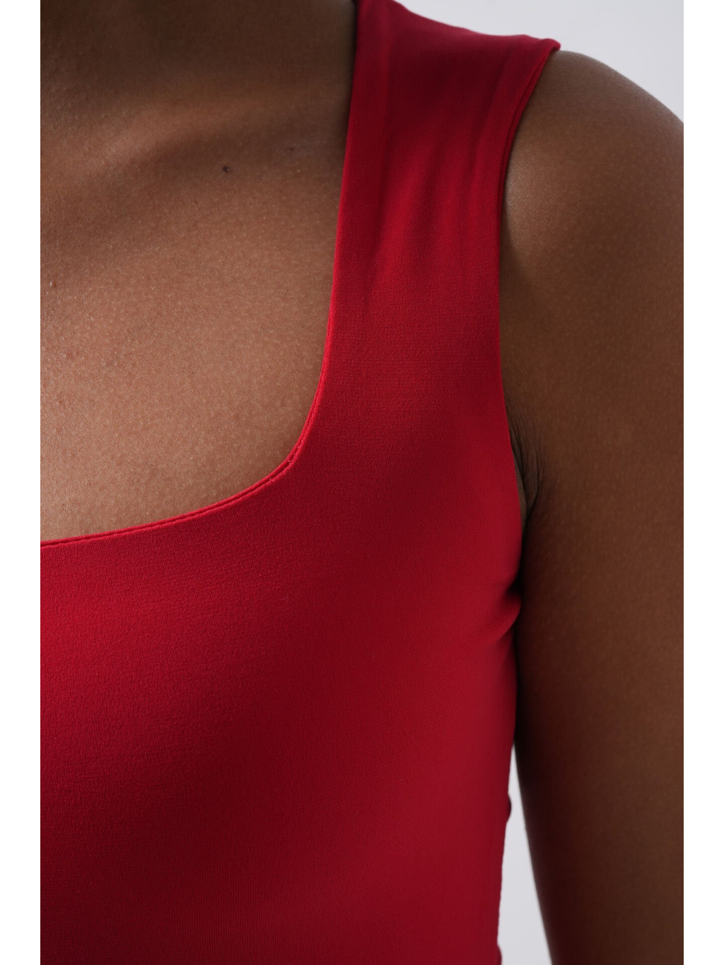 Červený přiléhavý body s hranatým výstřihem a širokými ramínky – smyslný a pohodlný kousek s dvojitou podšívkou.