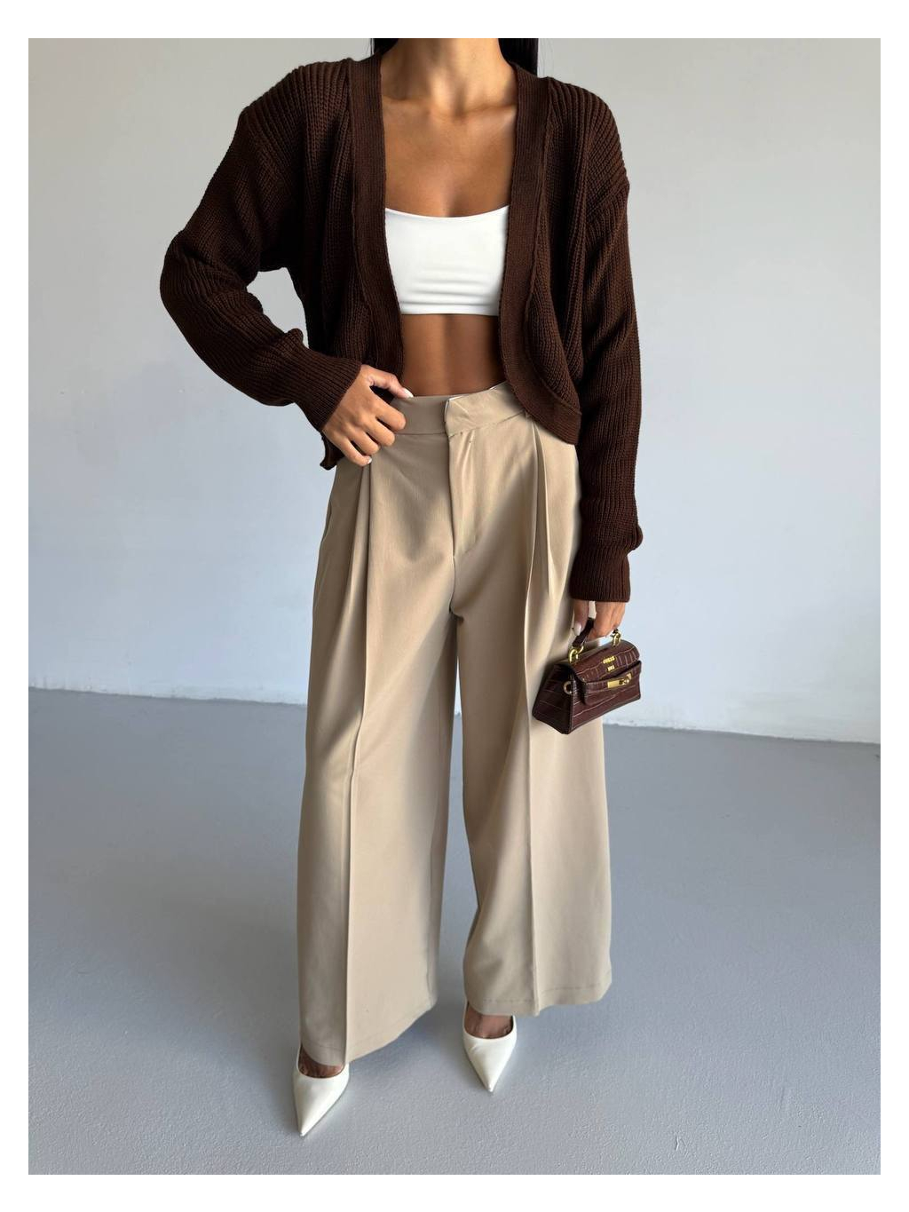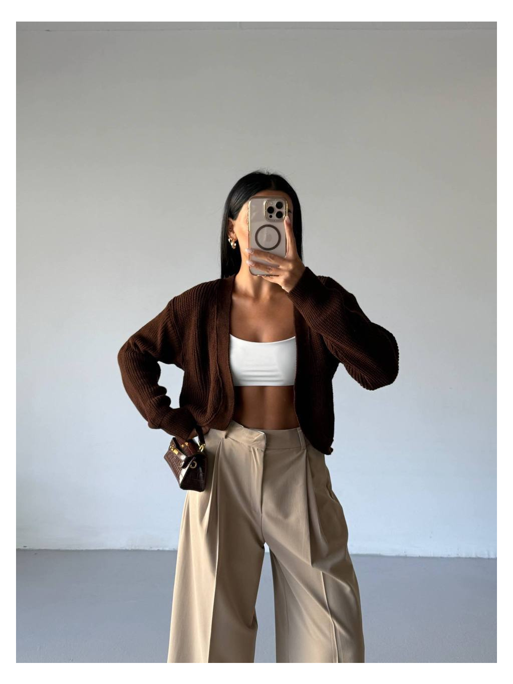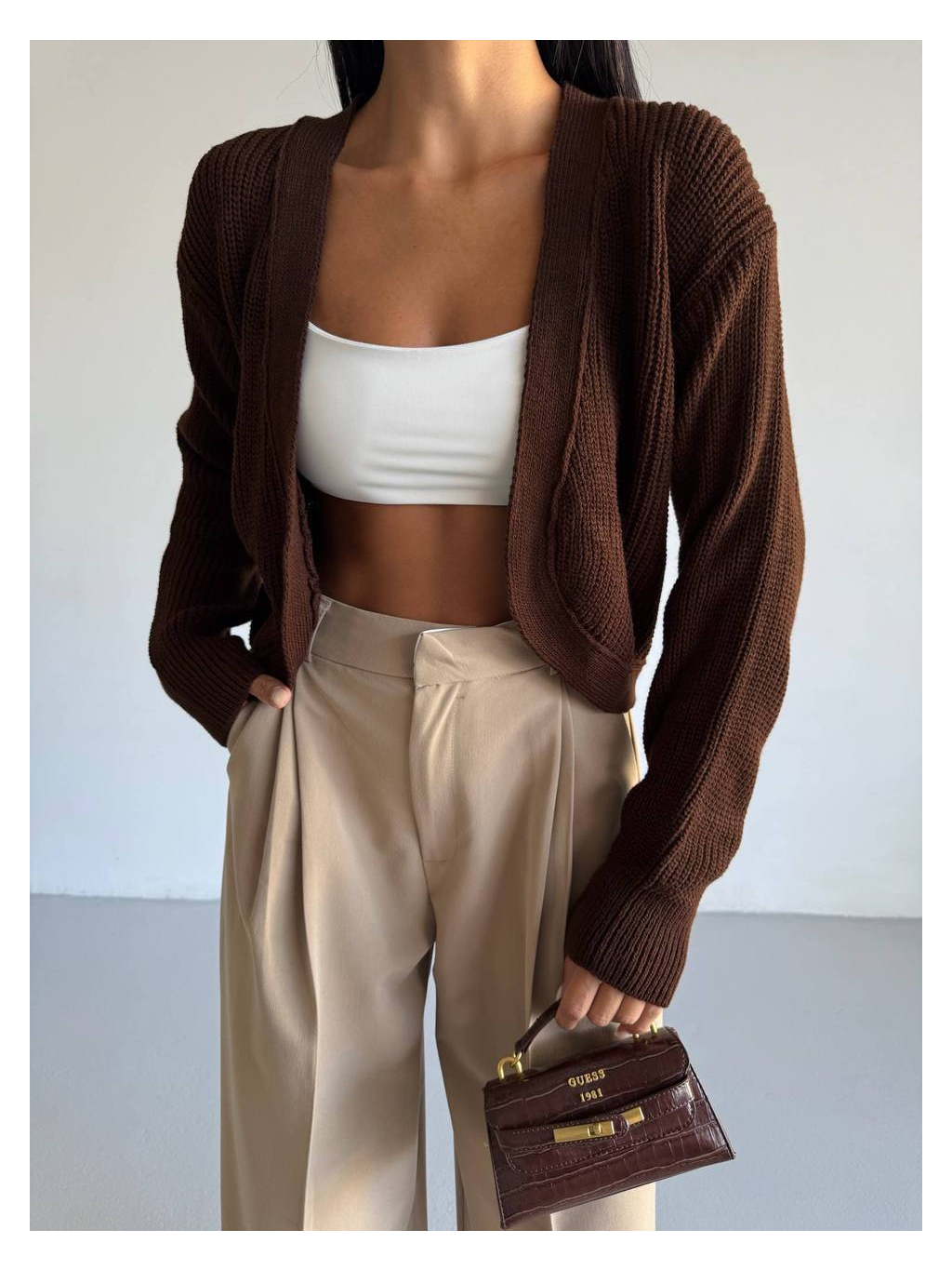 Hnědý cropped kardigan z měkké pleteniny s dlouhými rukávy a volnějším spadlým střihem.