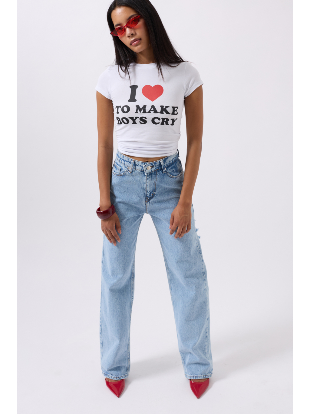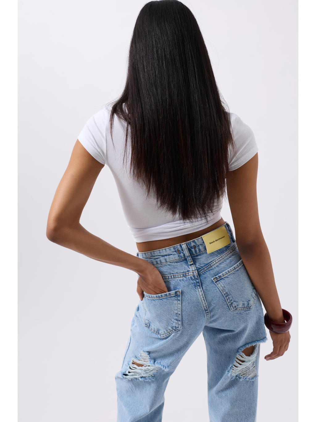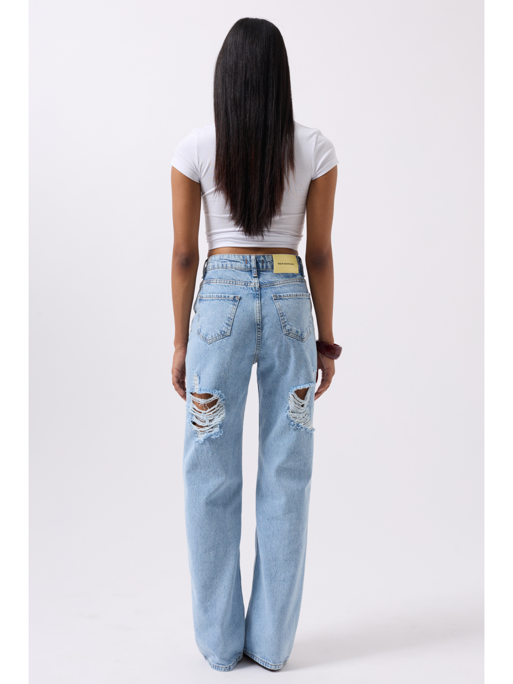 Rovné světle modré džíny s výraznými trhanci na zadní straně – stylový streetwear s rebelským nádechem.