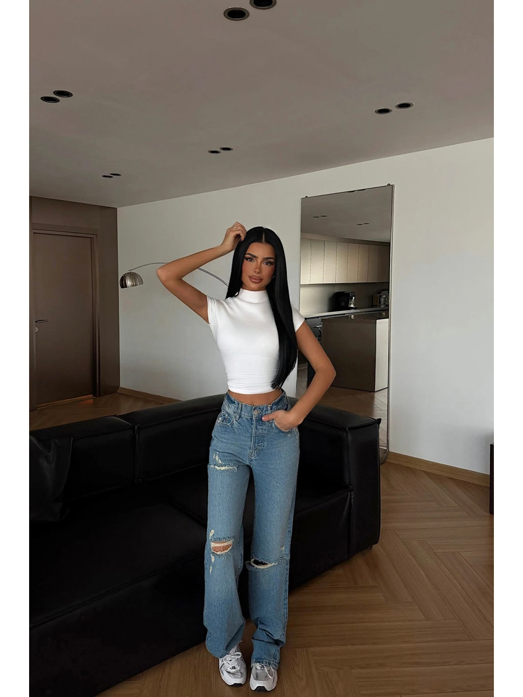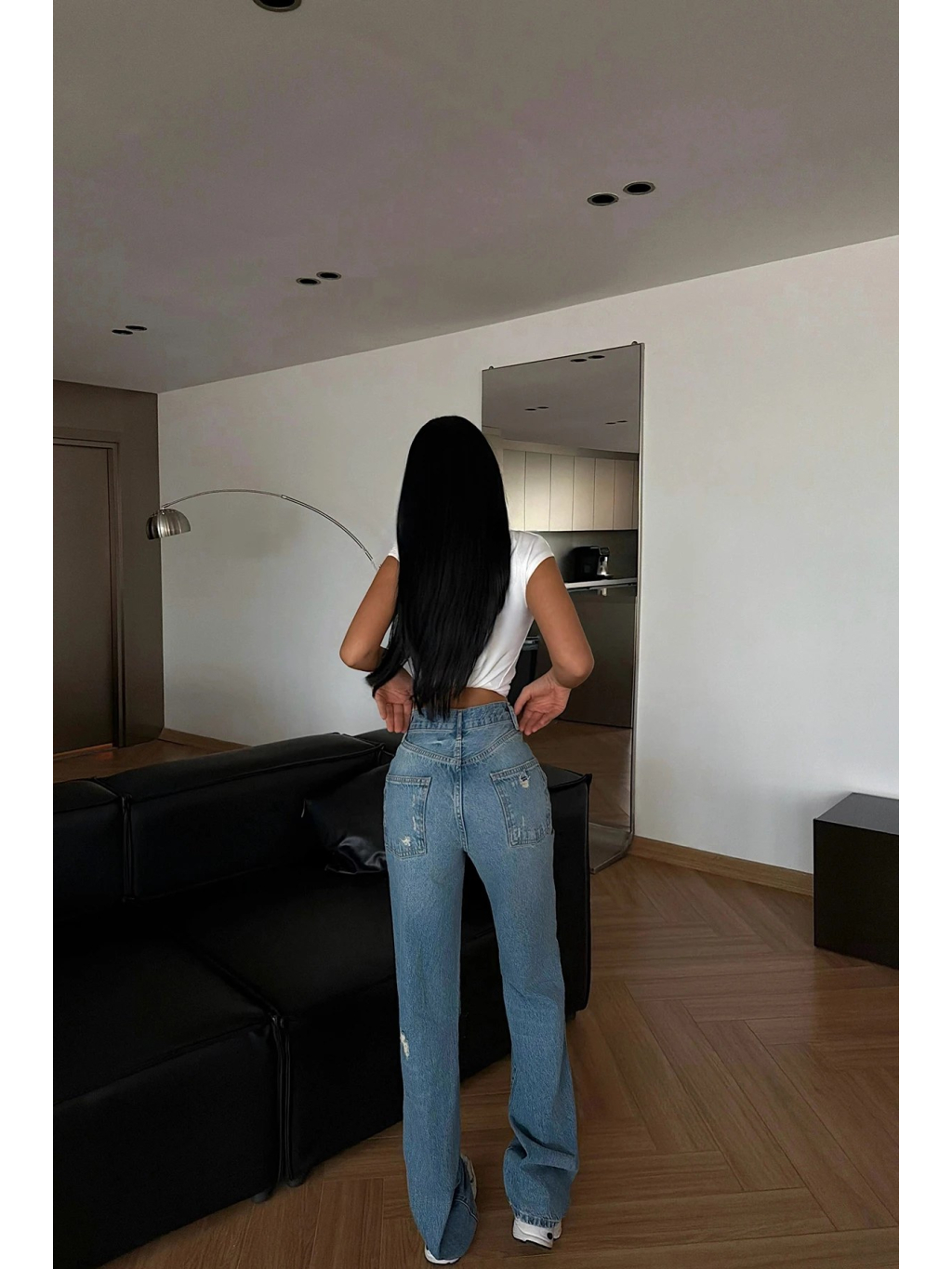Modré džíny s vysokým pasem a výrazným trháním – moderní streetový kousek s charakterem.