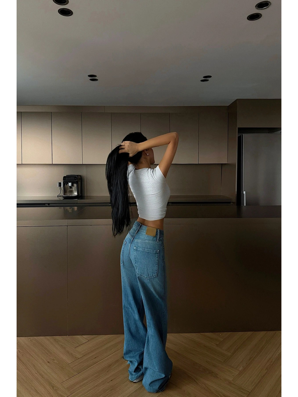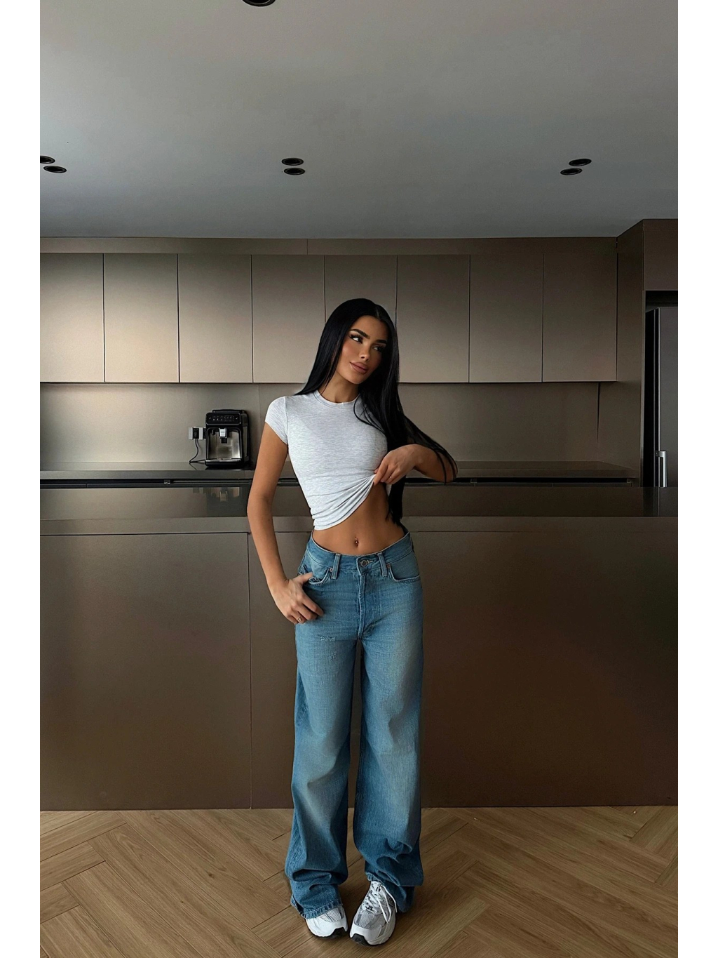 Modré džíny se středně vysokým pasem a širokými nohavicemi – ležérní základ pro každý den.