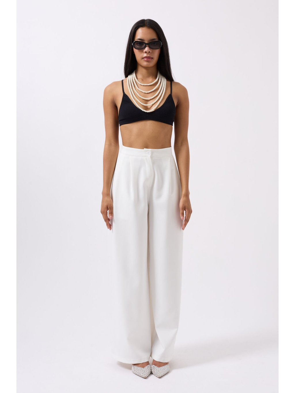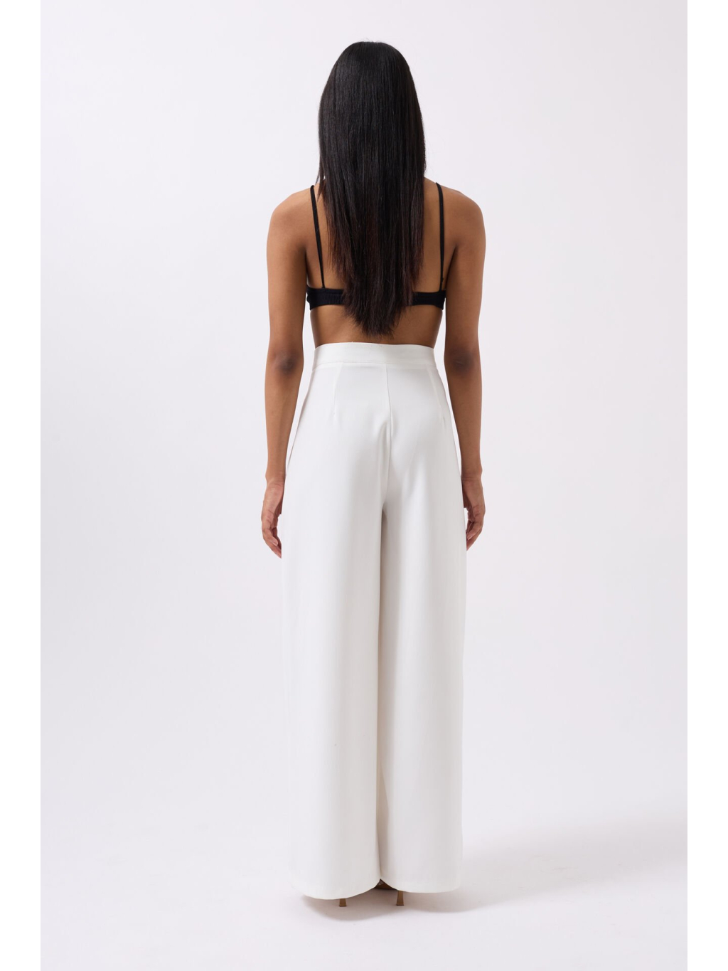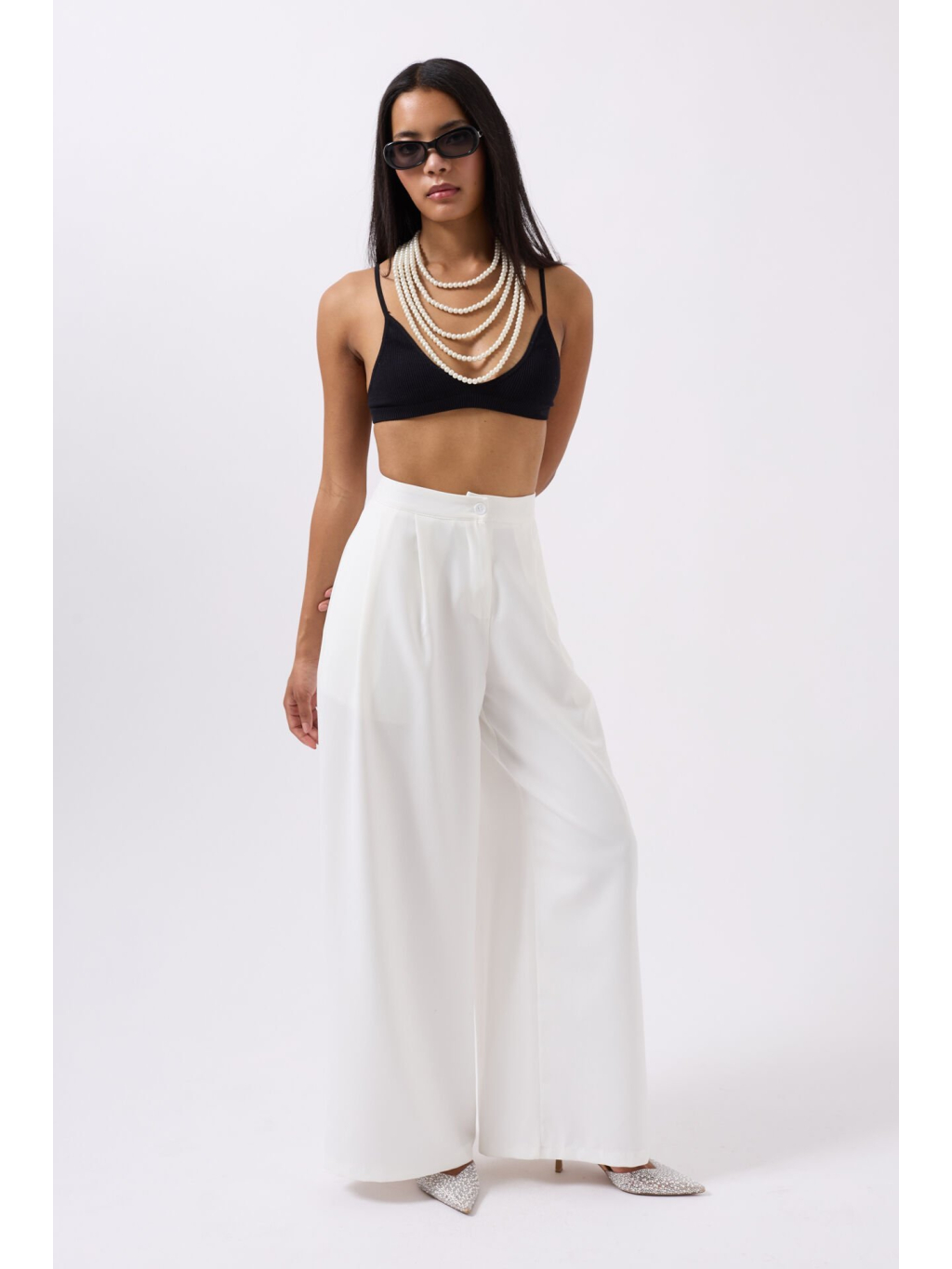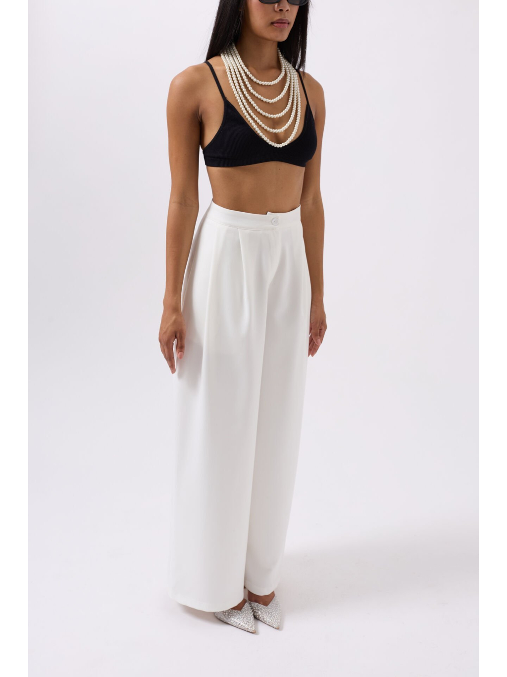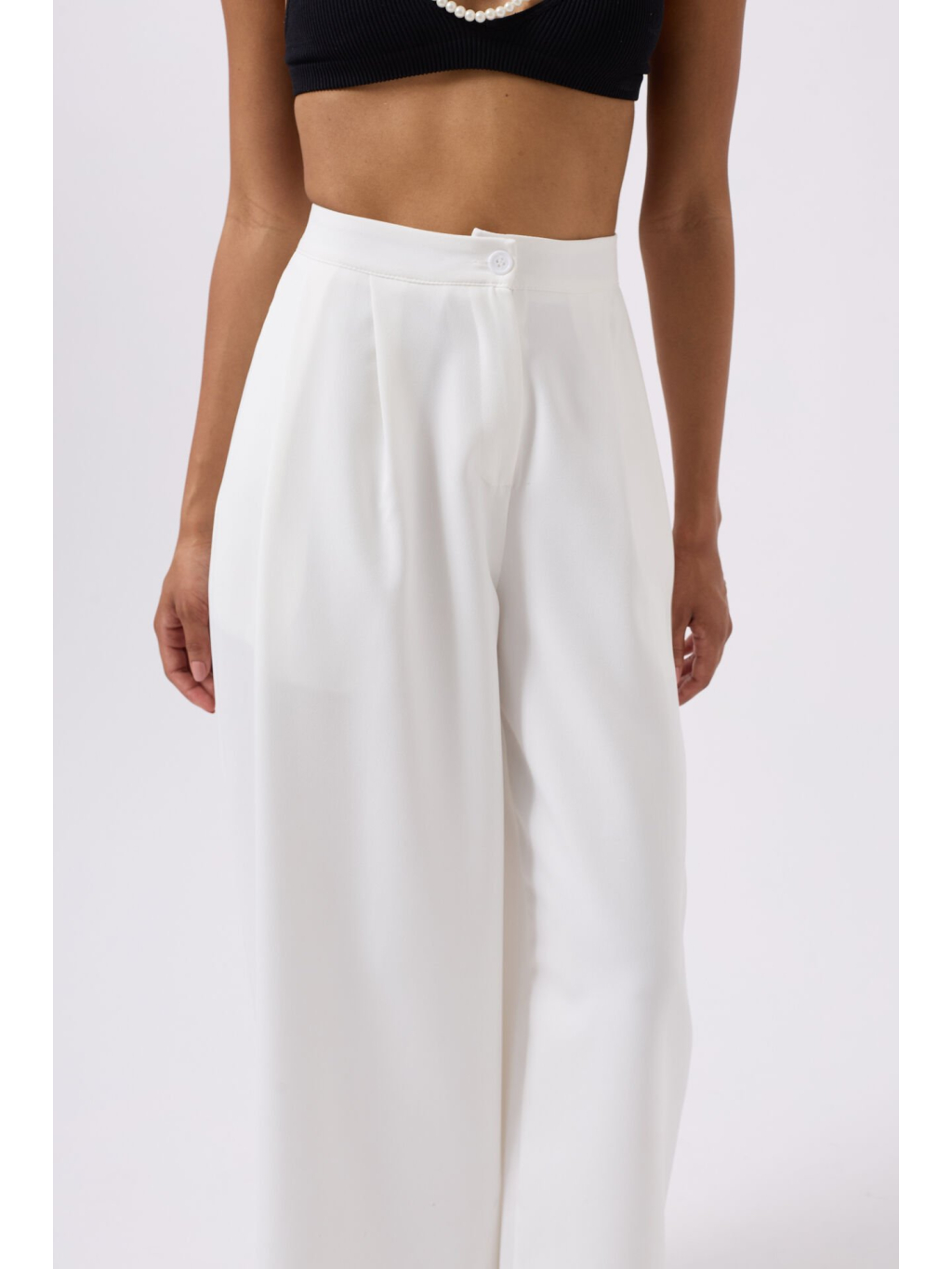 Lehké palazzo kalhoty v bílé barvě s vysokým pasem a zapínáním na knoflík – minimalistická volba pro elegantní každodenní outfit.