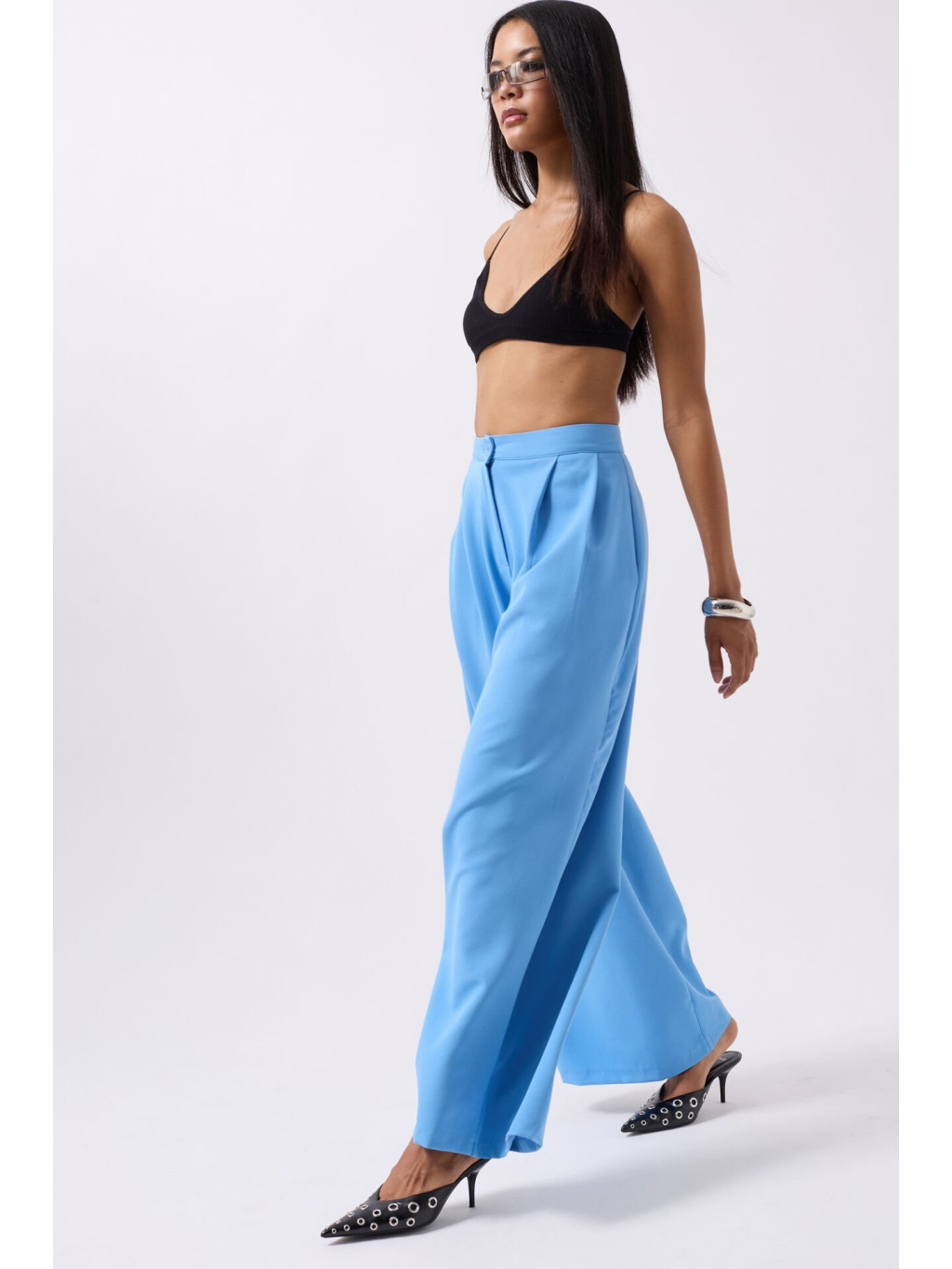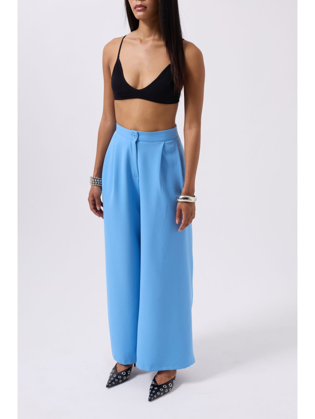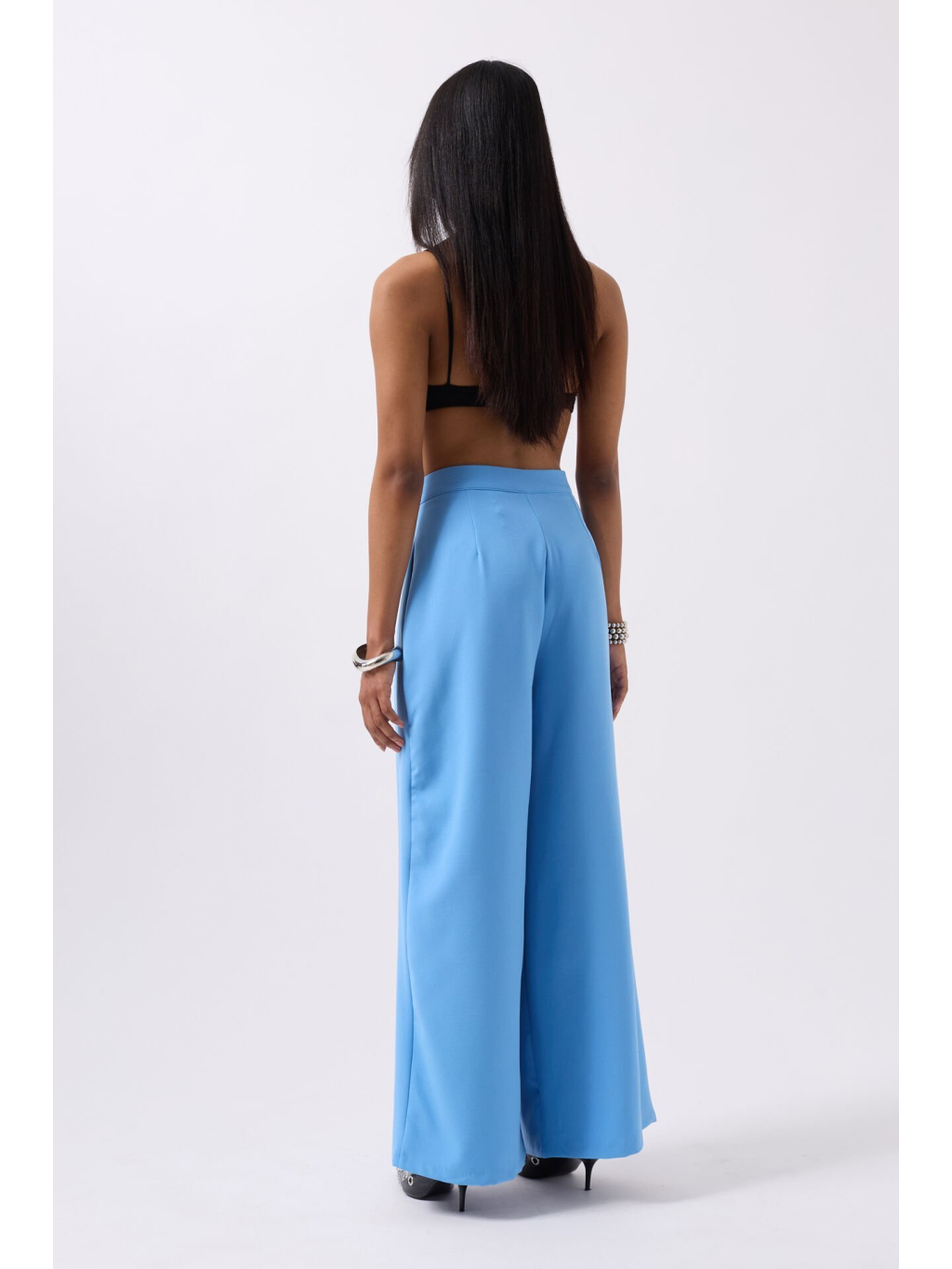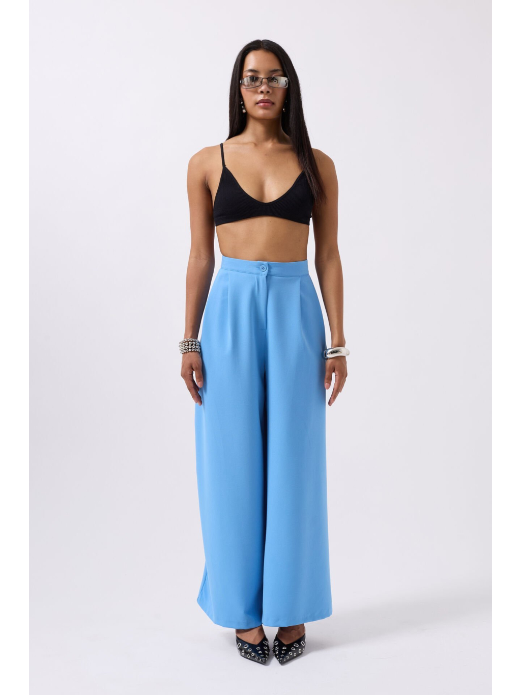 Dámské široké palazzo kalhoty v nebesky modré barvě s vysokým pasem a elegantním zapínáním na knoflík.