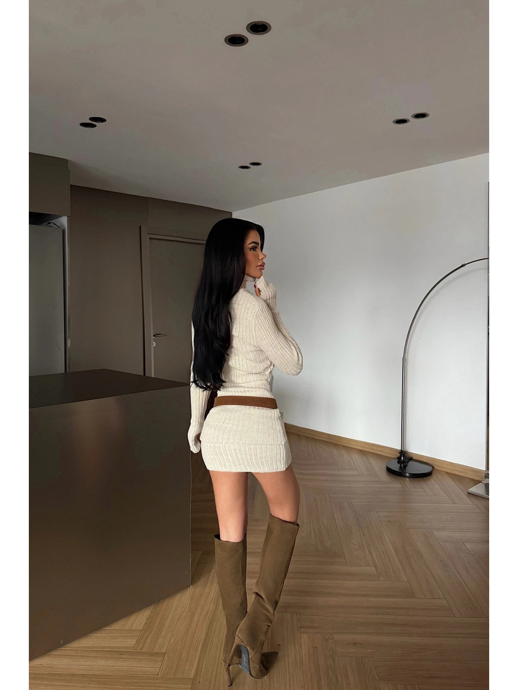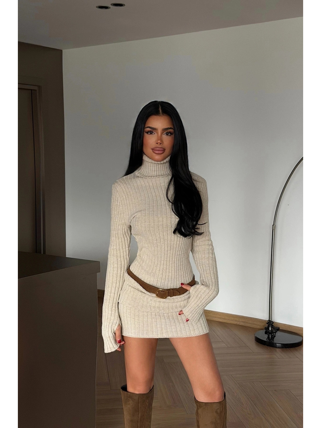 Tyto pletené šaty v barvě stone představují dokonalé spojení minimalistického stylu a ženské elegance. Přiléhavý střih s jemným žebrováním krásně kopíruje postavu a zvýrazňuje křivky, zatímco stojáček dodává modelu čistý a sofistikovaný vzhled.