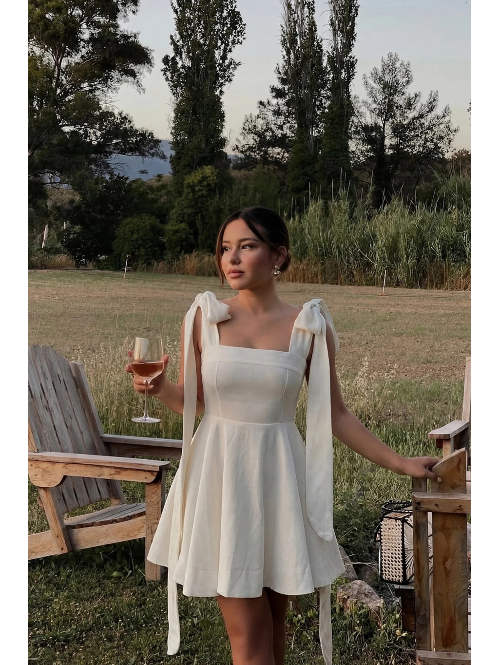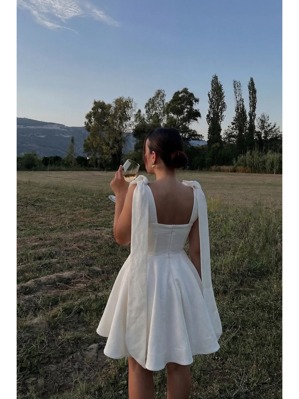 Romantické off-white šaty s vázáním na ramenou a lehce rozšířenou sukní pro jemně ženský vzhled.