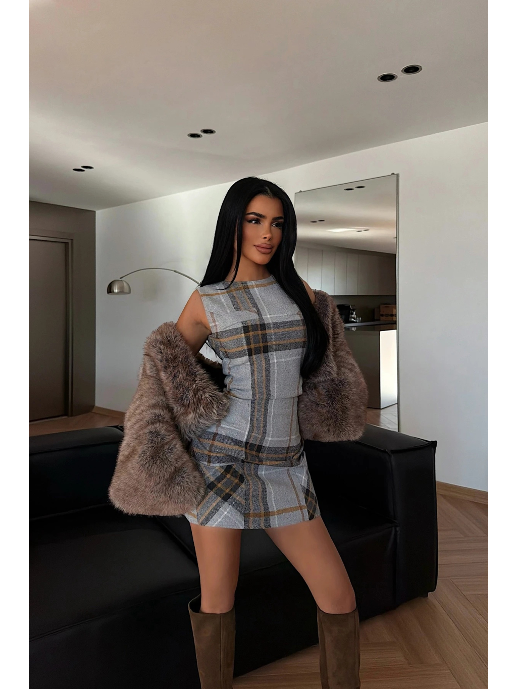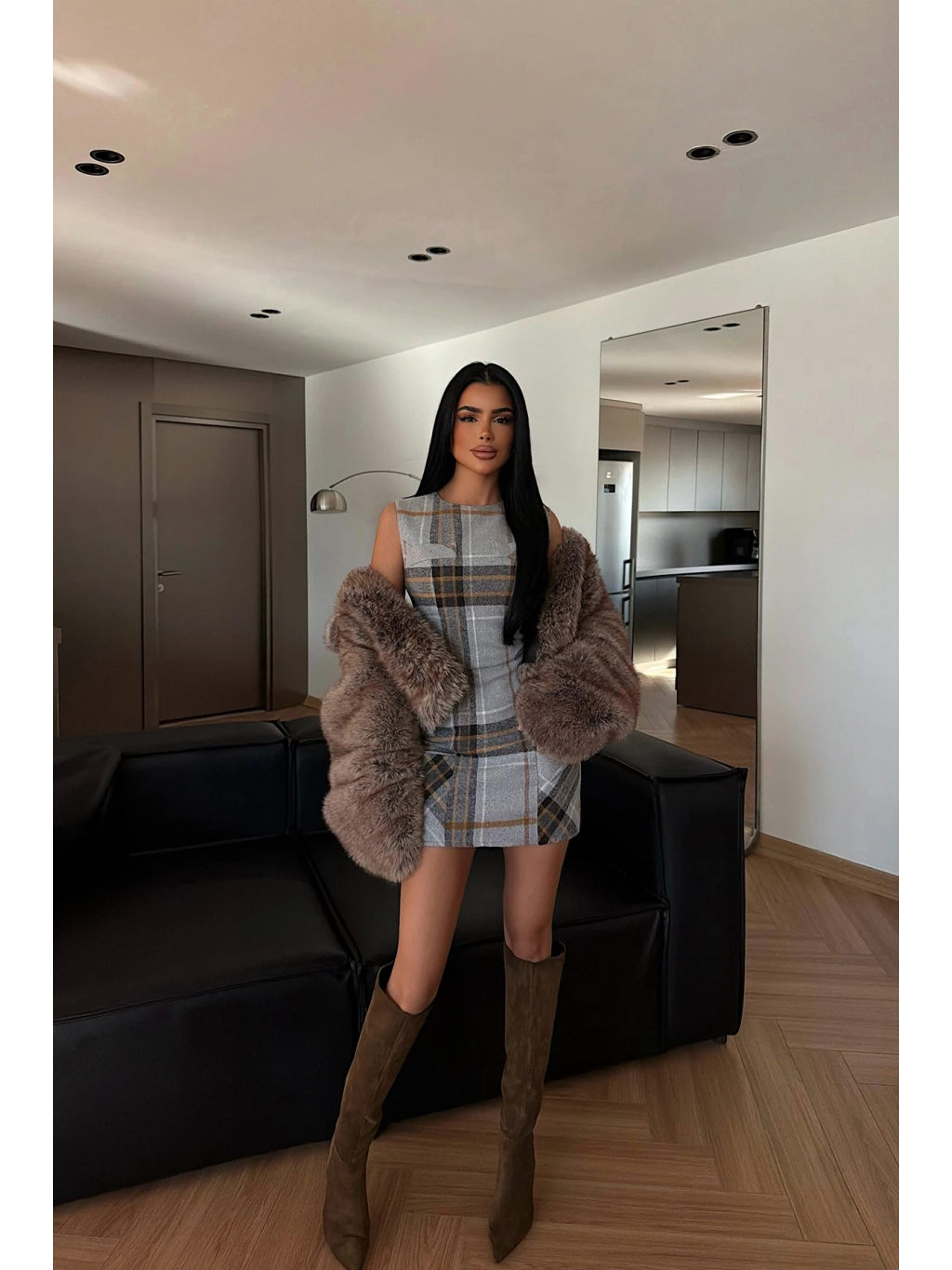 Tyto šedé kostkované mini šaty zaujmou minimalistickým, ale velmi ženským provedením. Přiléhavý střih bez rukávů krásně kopíruje siluetu a zvýrazňuje pas i křivky postavy, zatímco jemný kostkovaný vzor v šedých a béžových tónech působí elegantně a nadčasově.