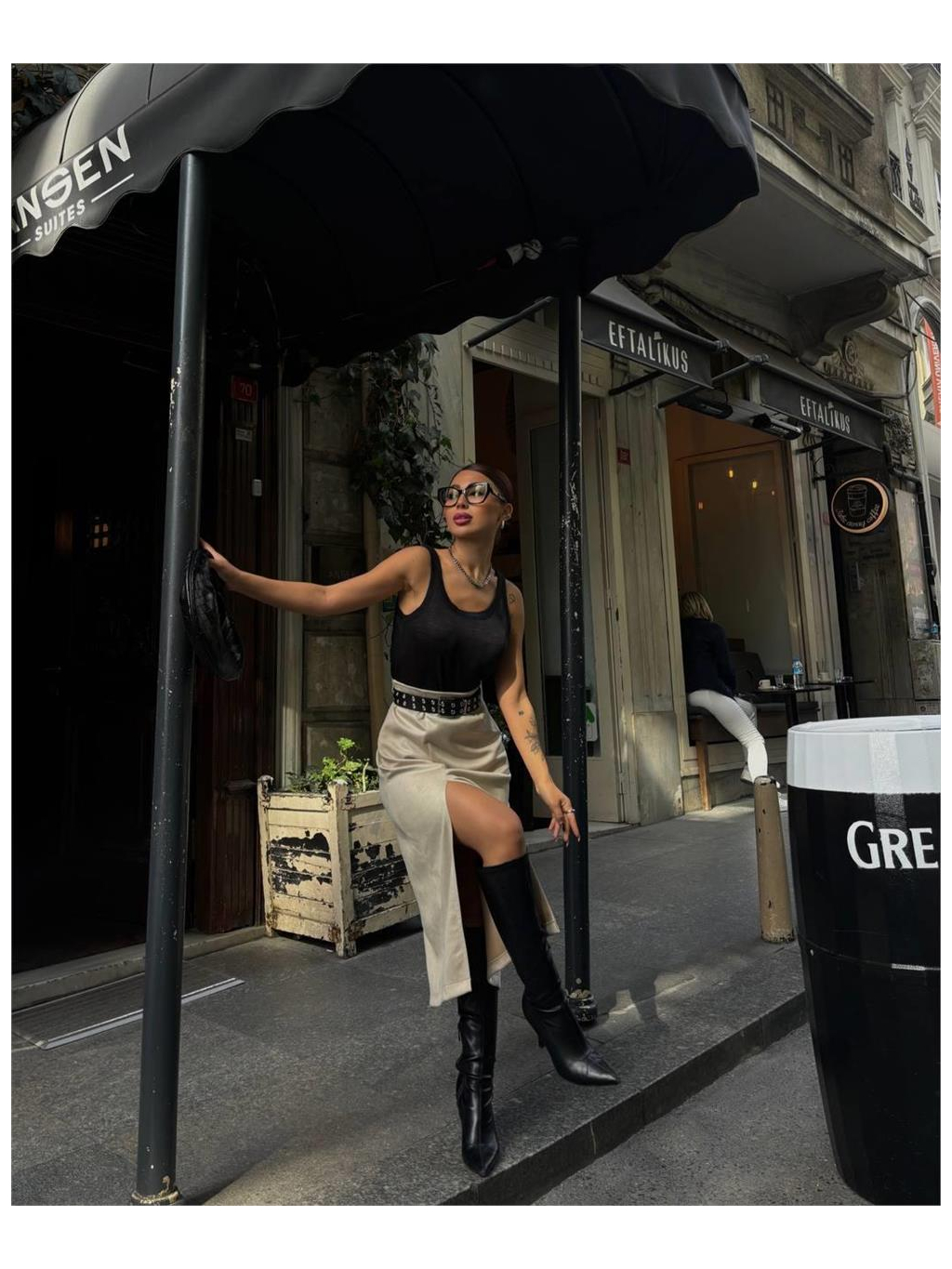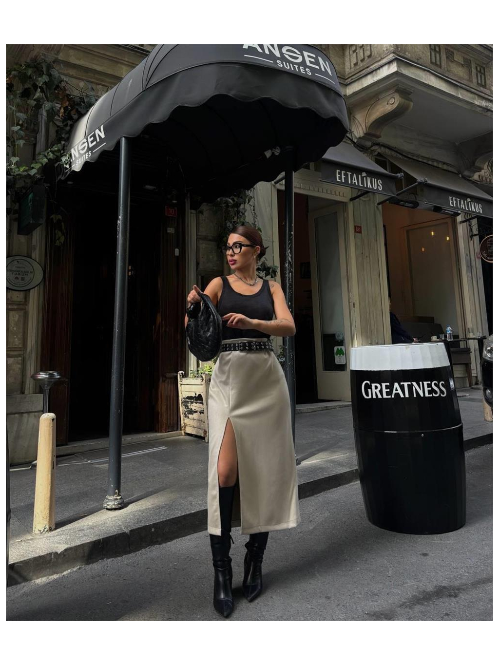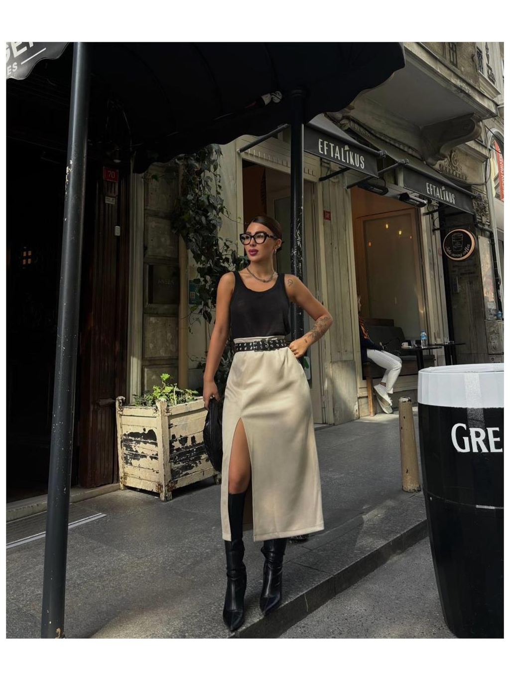 Tato béžová midi sukně s vysokým pasem a výrazným bočním rozparkem nabízí perfektní rovnováhu mezi elegancí a odvahou. Hladký, jemně lesklý materiál vytváří sofistikovaný vzhled, který se hodí pro večerní příležitosti i módní denní outfit.