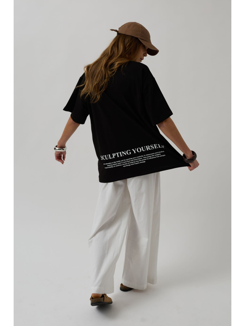 Černé oversized tričko s nápisem „Sculpting Yourself“ – minimalistický kousek s výrazným poselstvím.