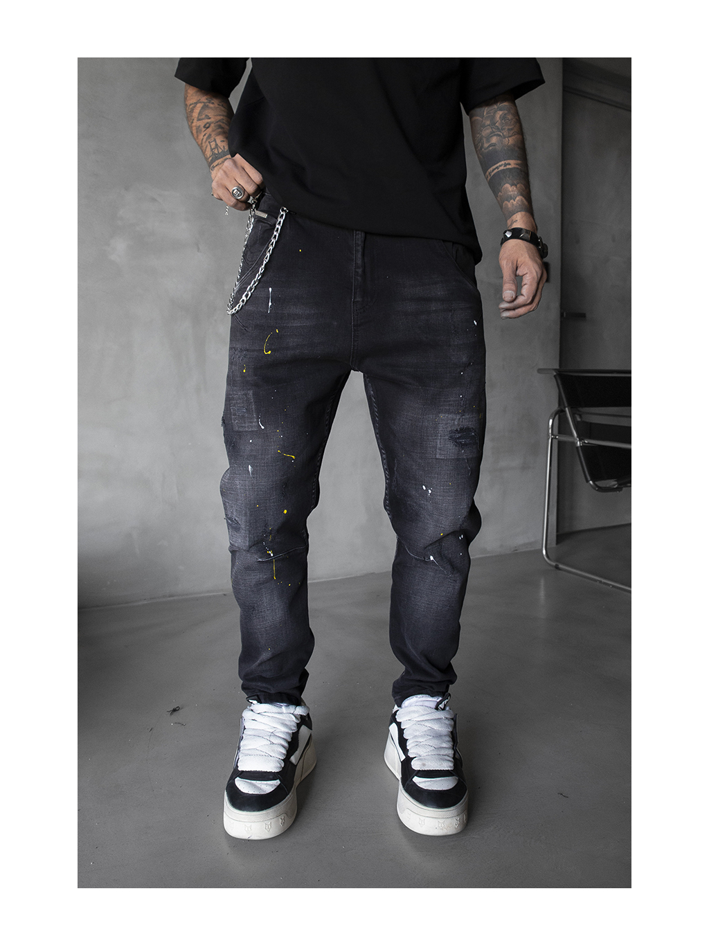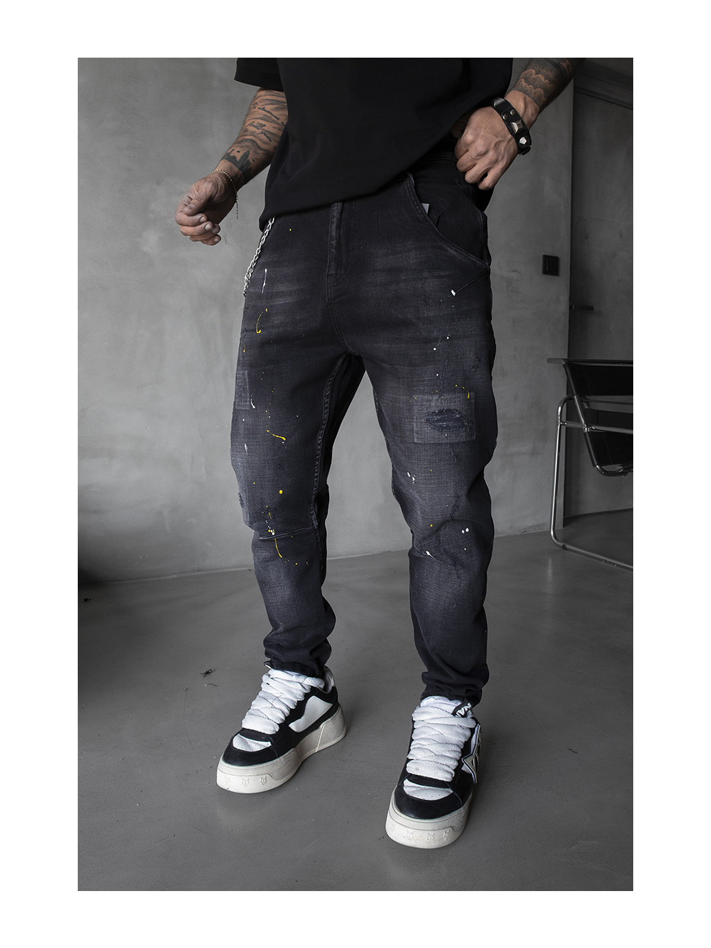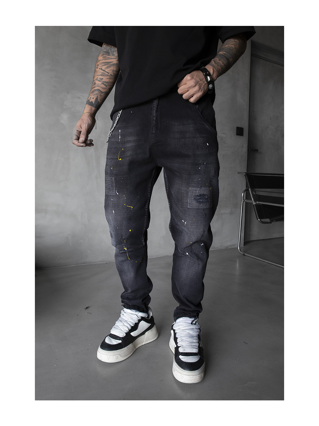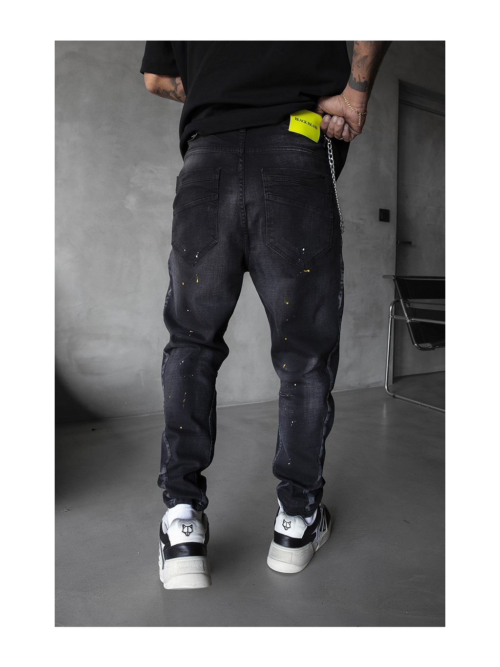 Černé loose fit džíny s kontrastními žlutými a bílými „paint splatter“ detaily – výrazný streetwear kousek s uměleckým nádechem.