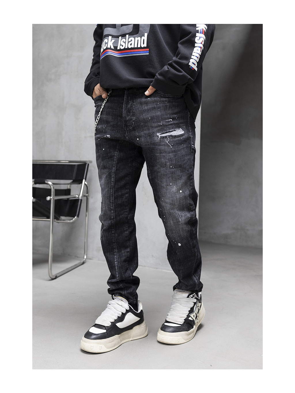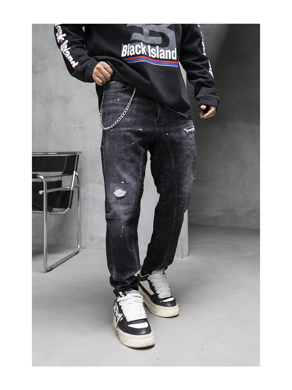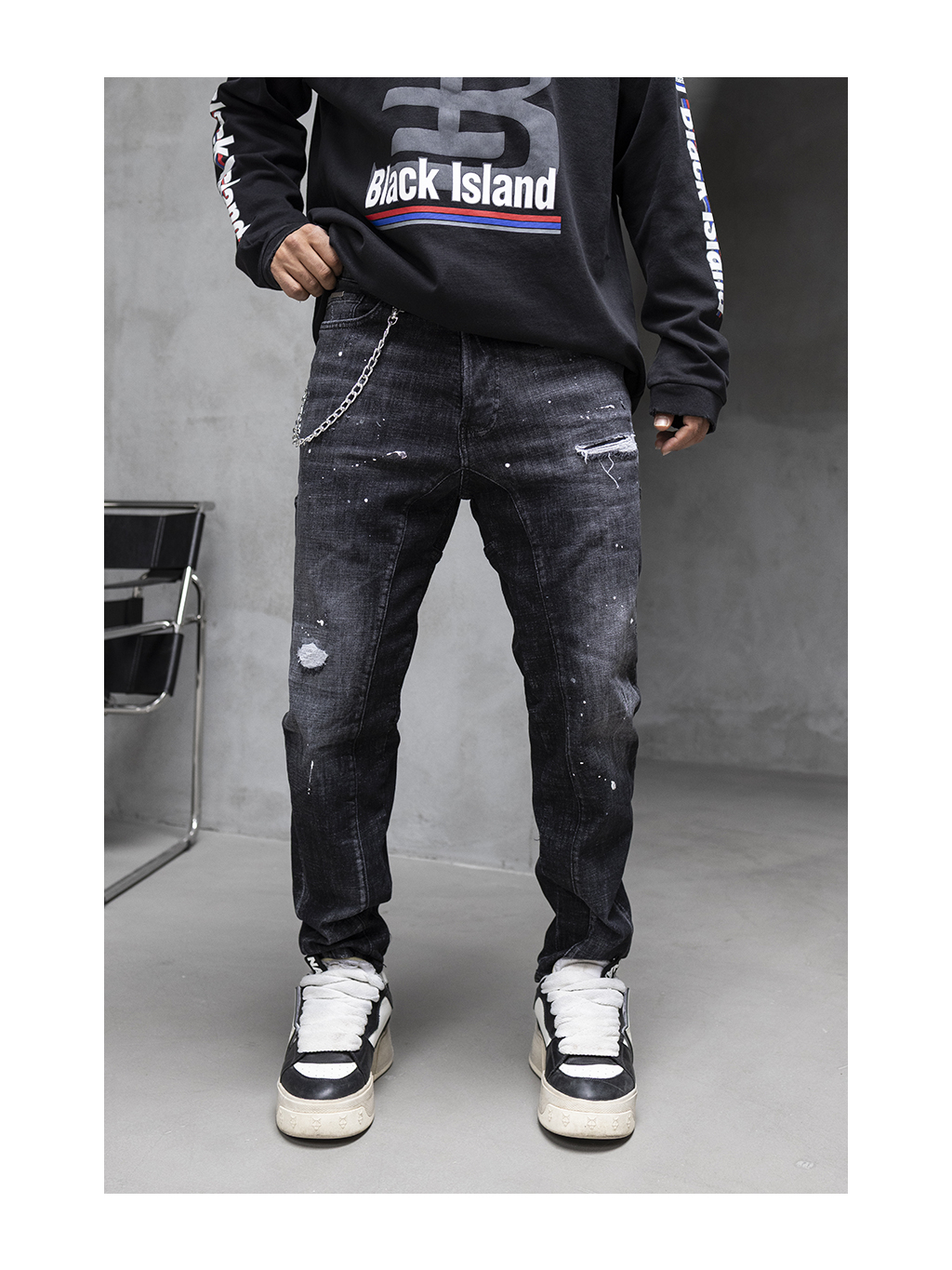Na kolenou se nacházejí stylové prodřeniny, doplněné o subtilní paint efekt, který dodává riflím originální charakter. Kovový boční řetízek, klasická 5kapsová konstrukce a zip s knoflíkem zdůrazňují street aestetiku značky Black Island.