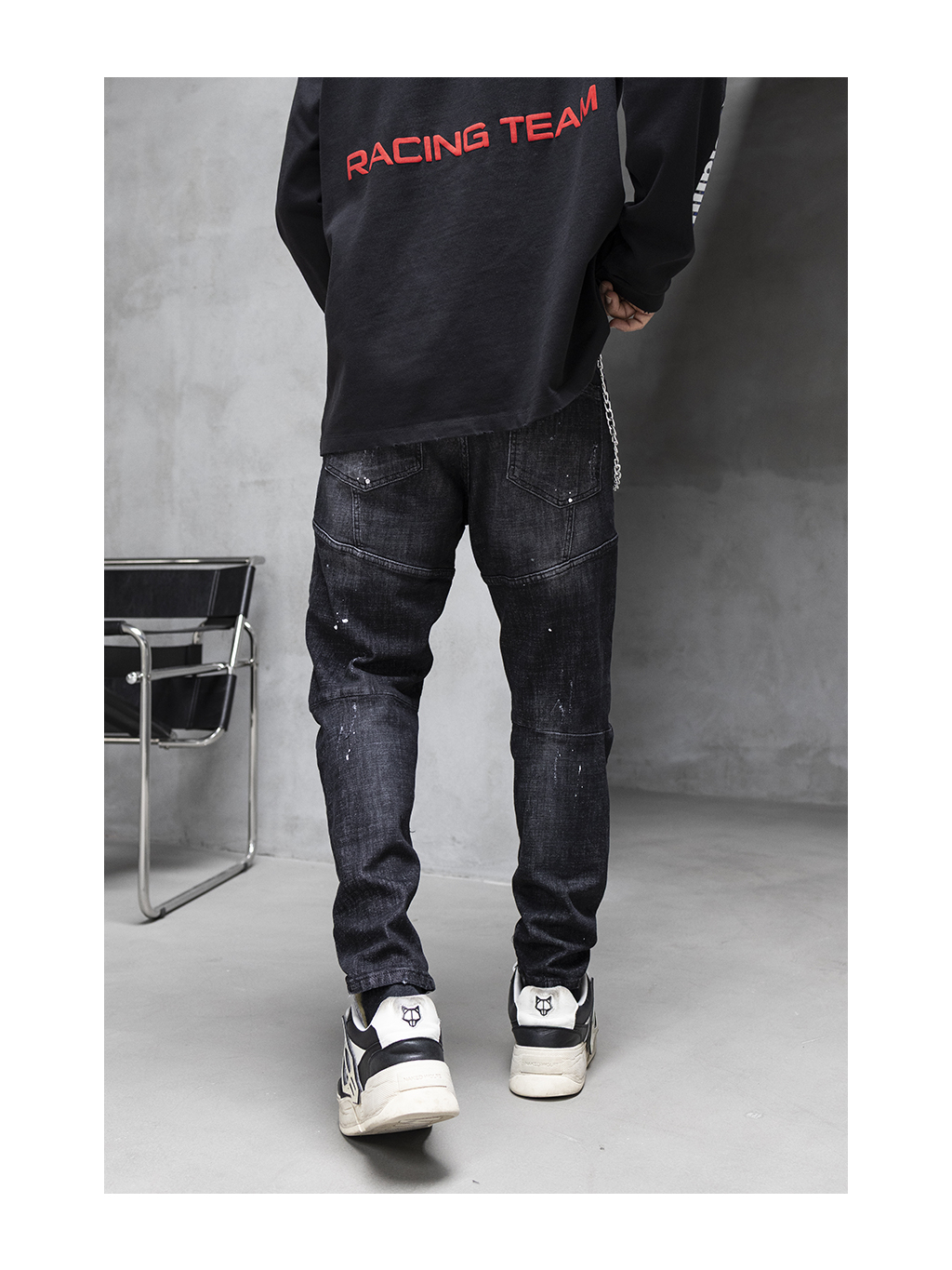 Pánské slim fit rifle v černém „washed“ provedení s výrazným distressingem a paint efektem pro odvážný streetwear styl.
