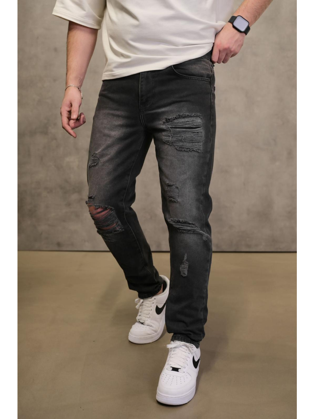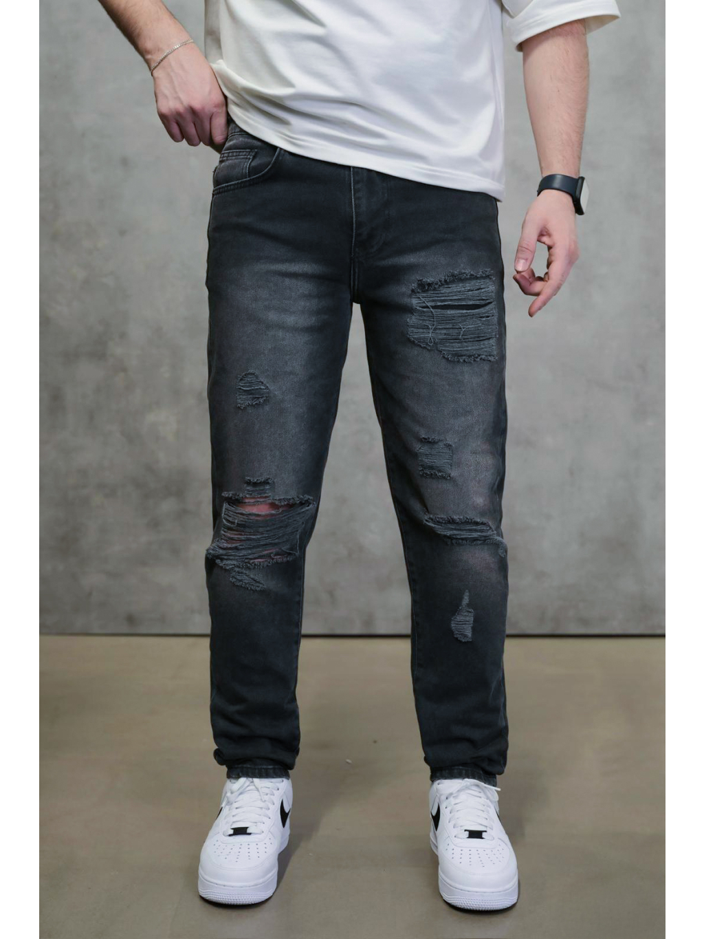Černé straight džíny s výrazným potrhaným efektem – moderní street styl v klasickém střihu.