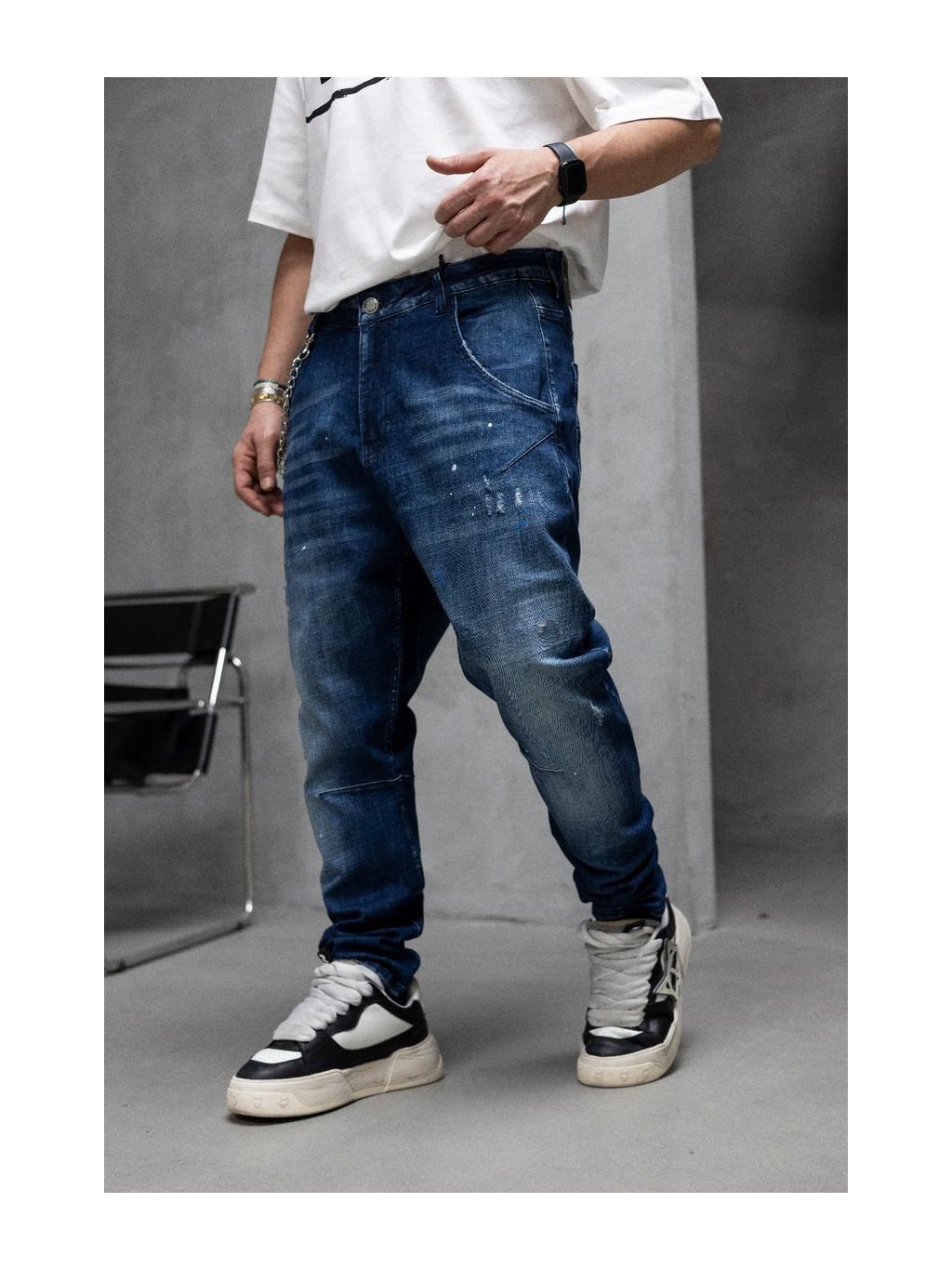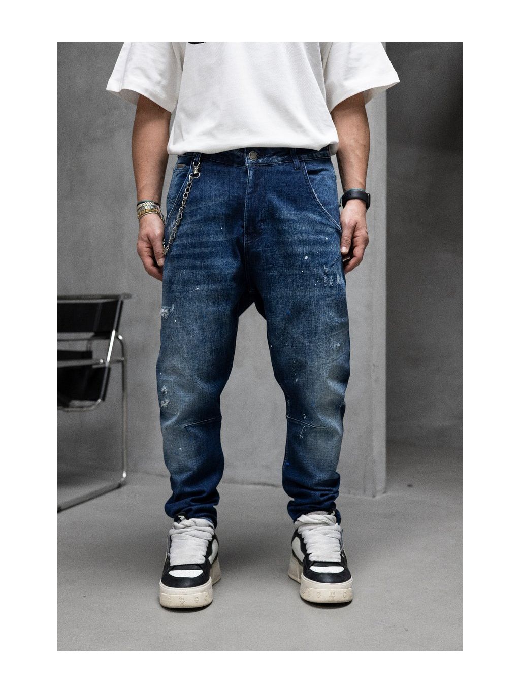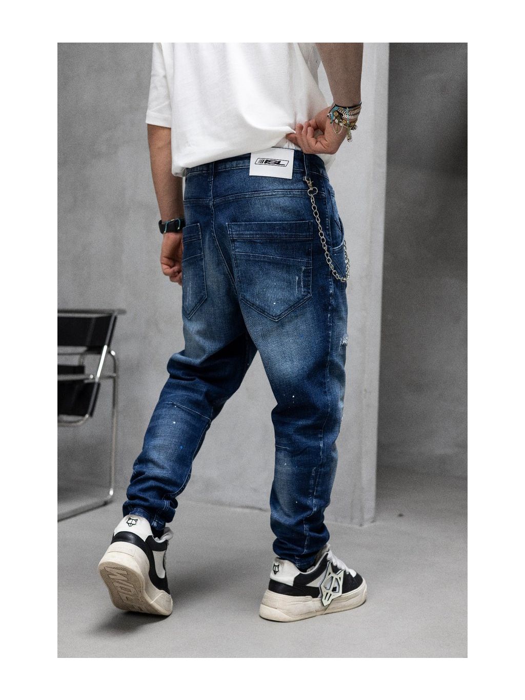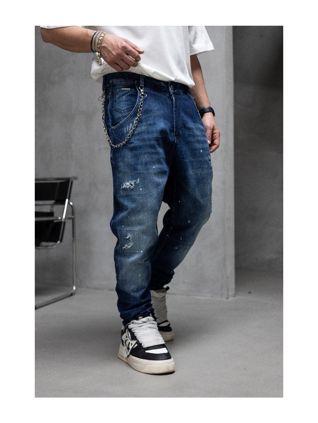 Rifle zaujmou svým jemným opráním a lehkými oděrkami, které dodávají autentický, lehce vintage vzhled. Styl doplňují výrazné detaily jako dekorativní řetízek a drobné paint-splatter efekty, které přidávají streetwear charakter a odlišují je od klasických riflí.