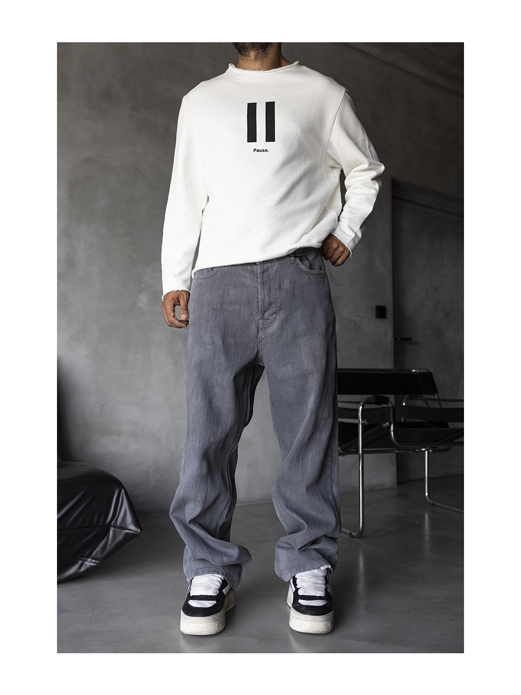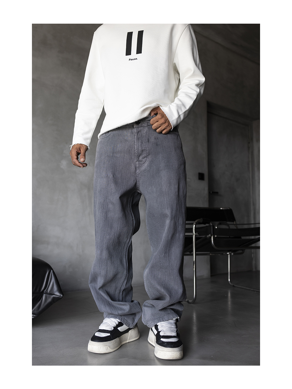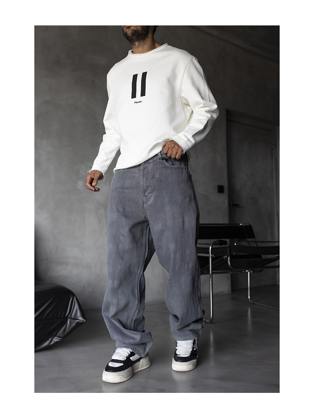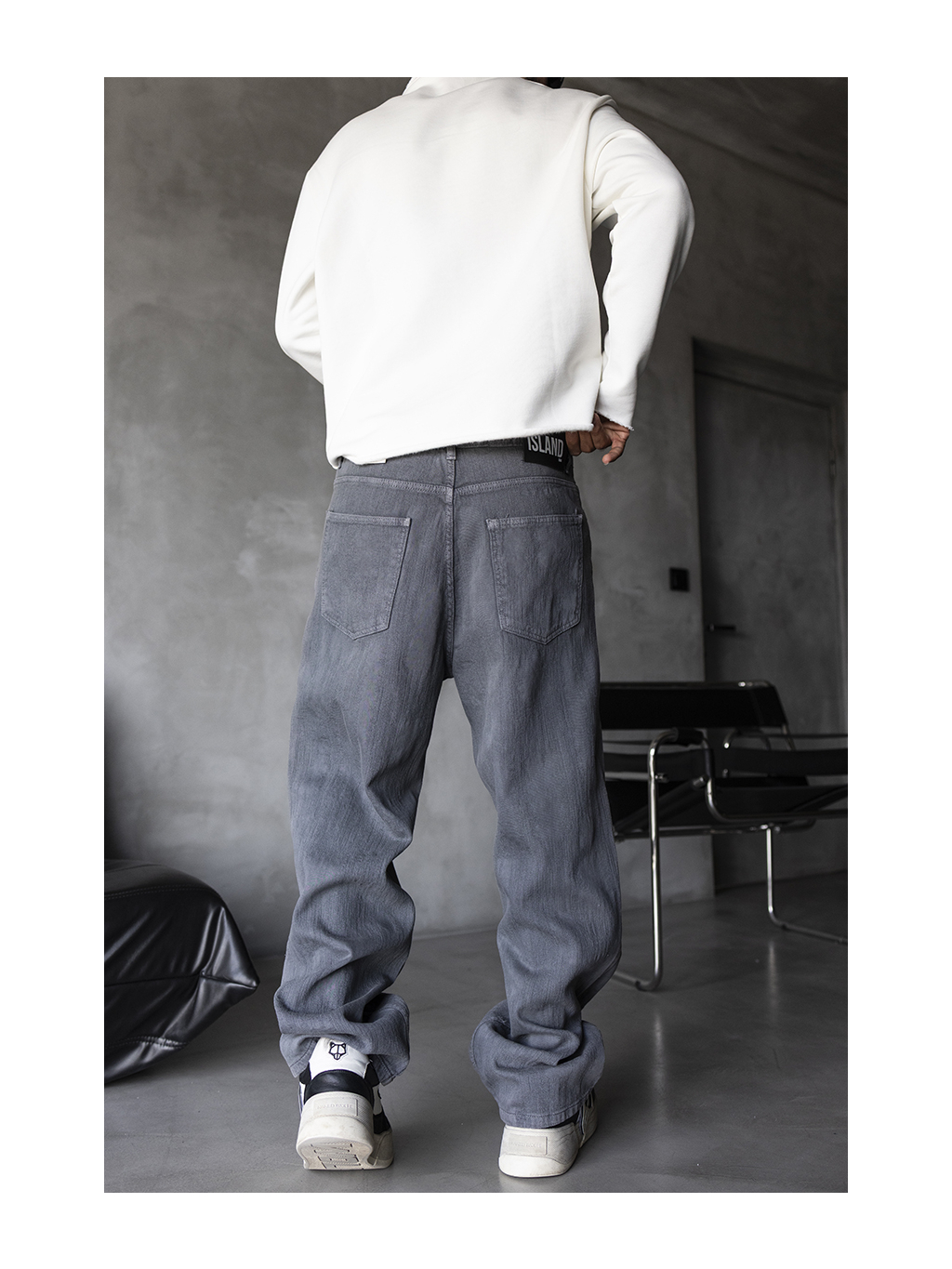 Volné baggy fit džíny ve světle šedém tónu s jemným sepráním – výrazný základ pro uvolněný městský styl.