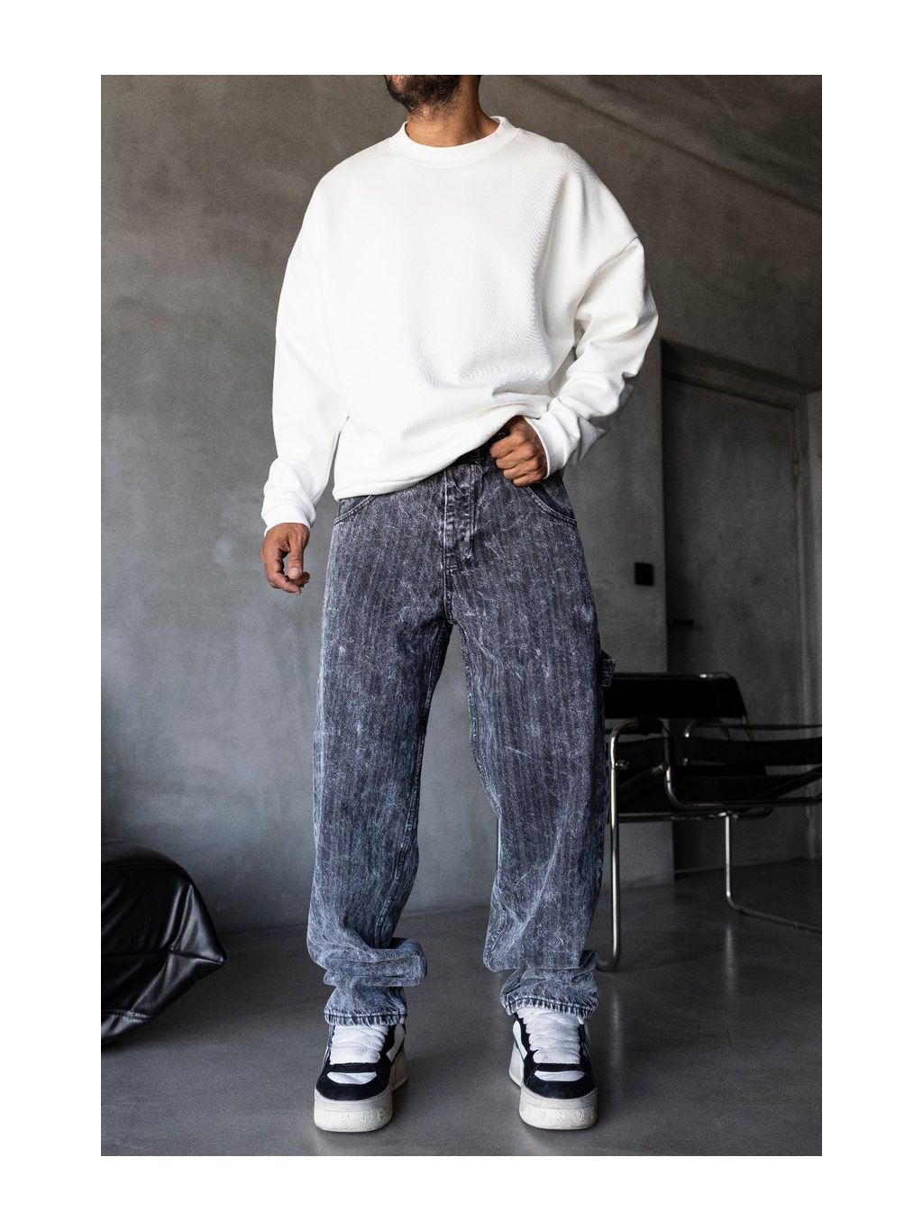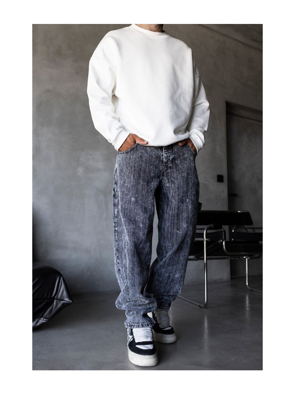 Šedé loose fit džíny s výrazným washed efektem pro moderní streetwear outfit.