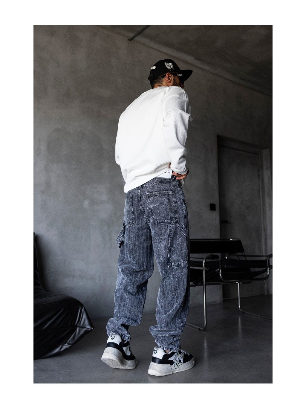 Džíny mají širší nohavice s přirozeným spadem, díky čemuž perfektně sedí ke sneakers i masivnější obuvi. Celkový vzhled doplňuje jemně opraný efekt, který zvýrazňuje strukturu materiálu a dodává riflím výraznější streetwear vibe.