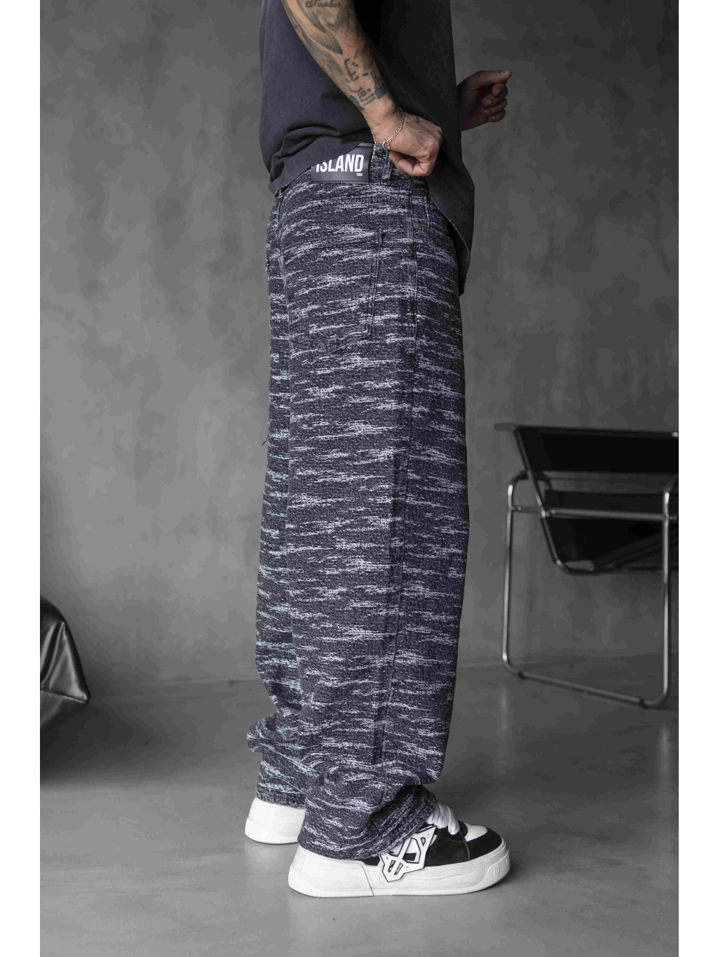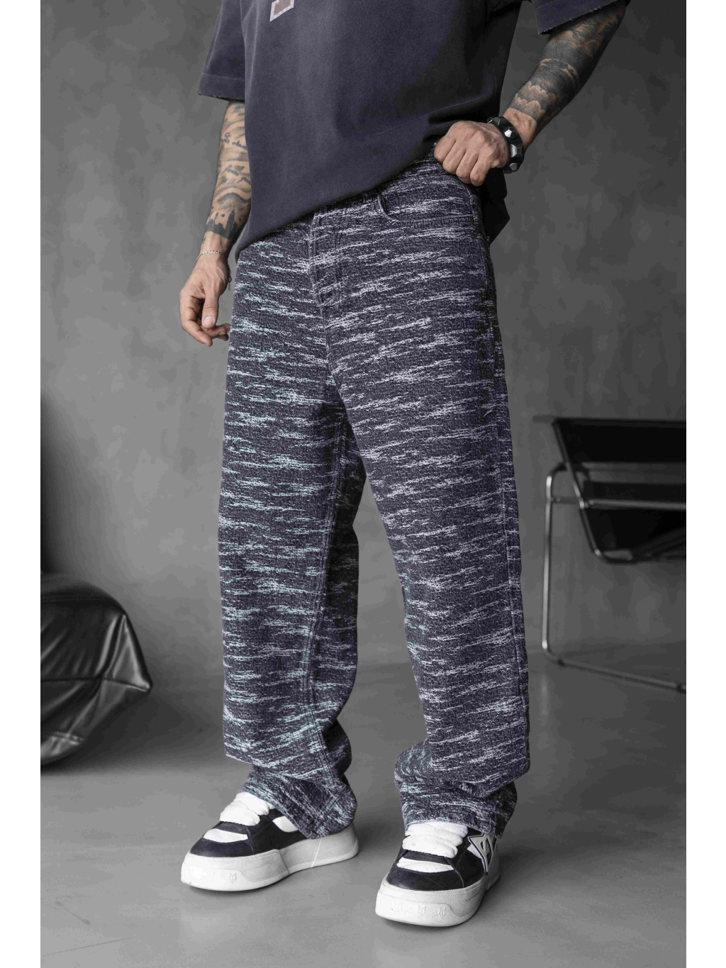 Tyto texturované loose fit džíny zaujmou svým jedinečným šedým melírem, ve kterém se prolínají tmavé až téměř černé tóny s jemnými bílými liniemi. Výsledkem je originální strukturovaný efekt, který dodává kalhotám charakter a posouvá je mimo klasický denimový styl.
