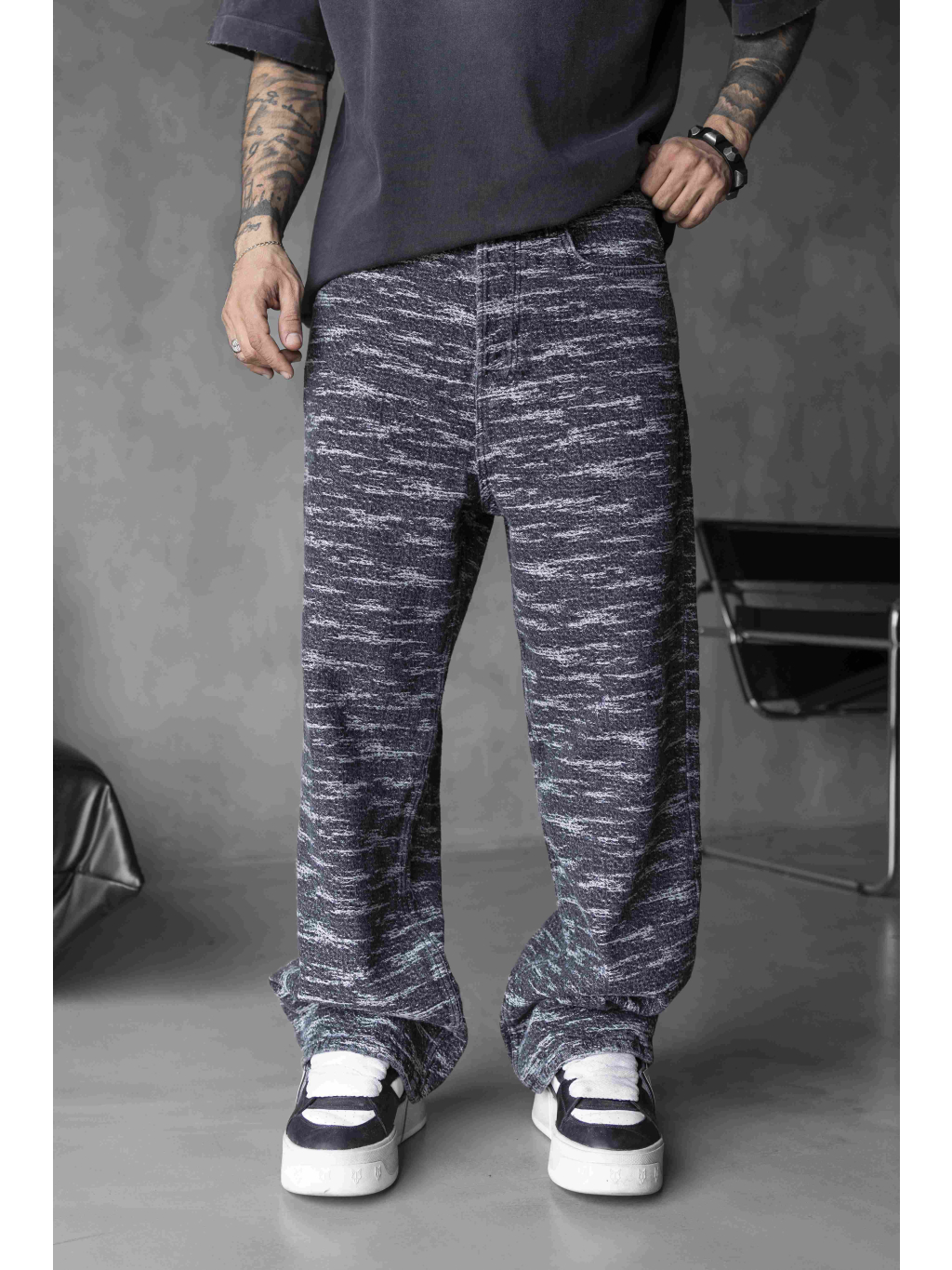 Pánské loose fit džíny v šedém melírovaném provedení s výraznou černobílou texturou.