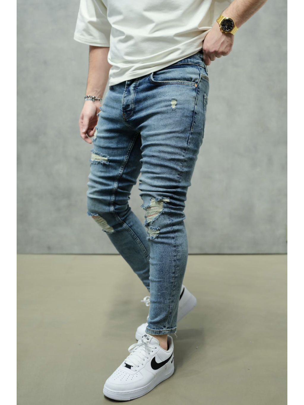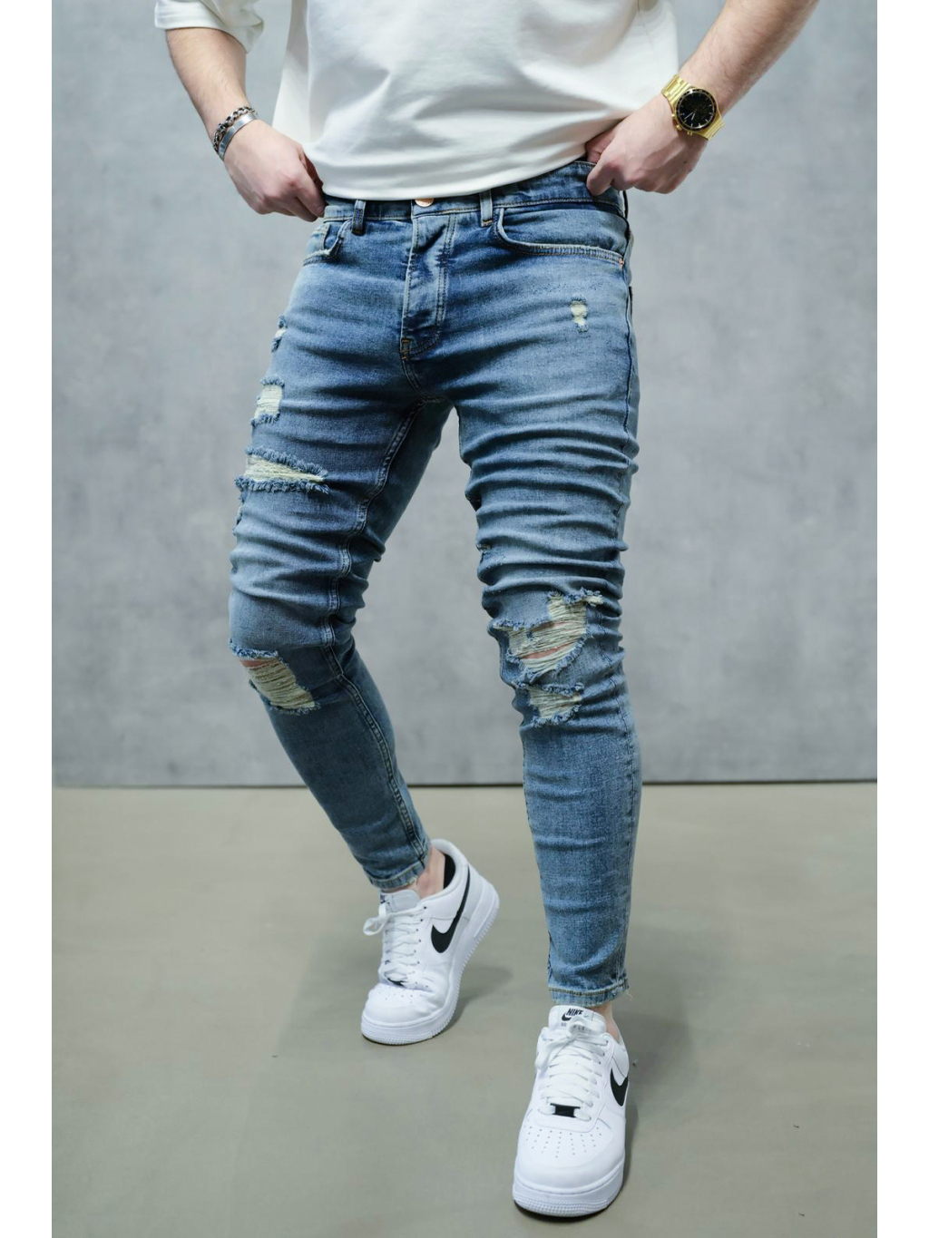Světle modré skinny fit rifle s výrazným trháním a opraným efektem pro moderní streetwear look.