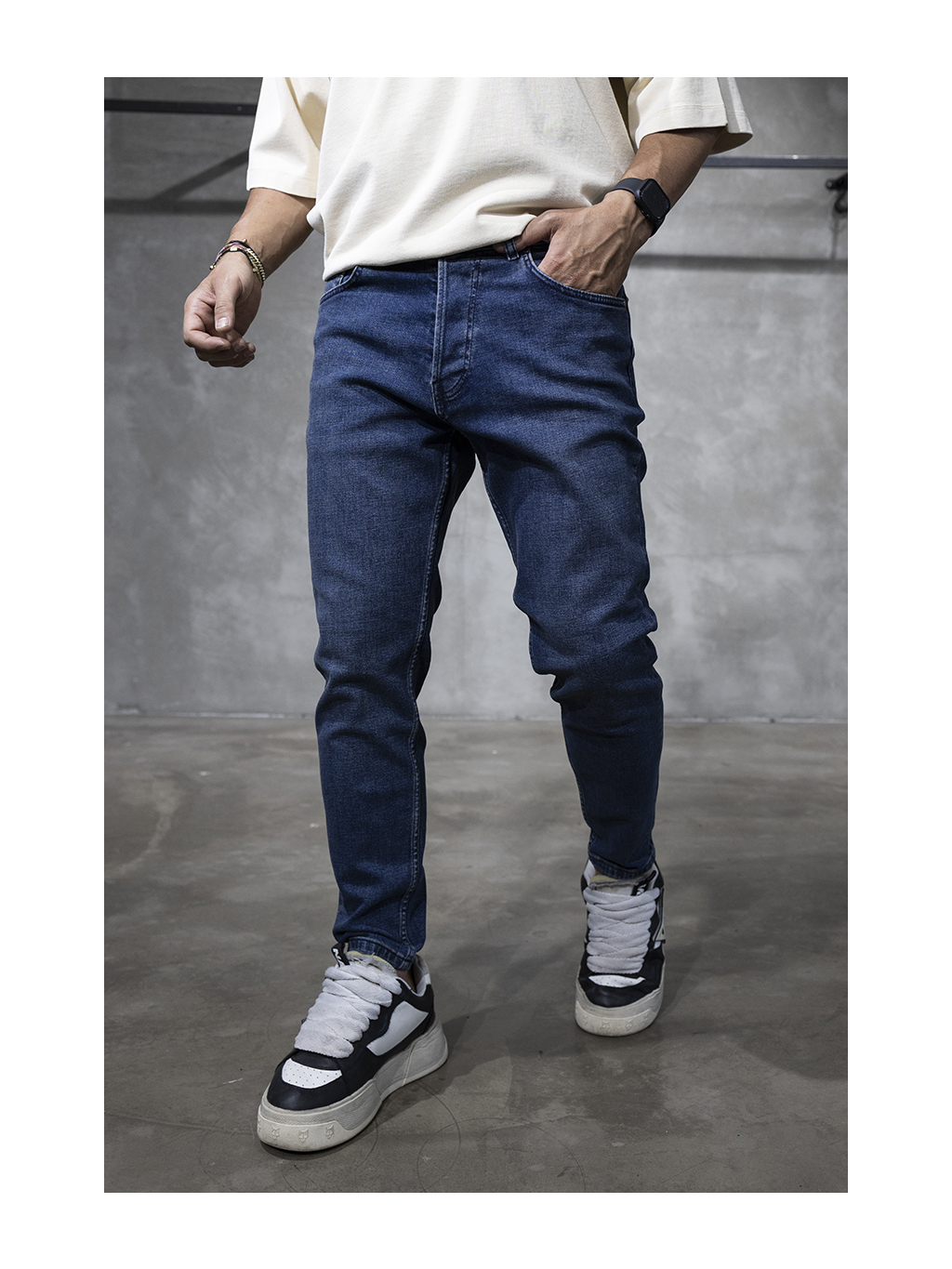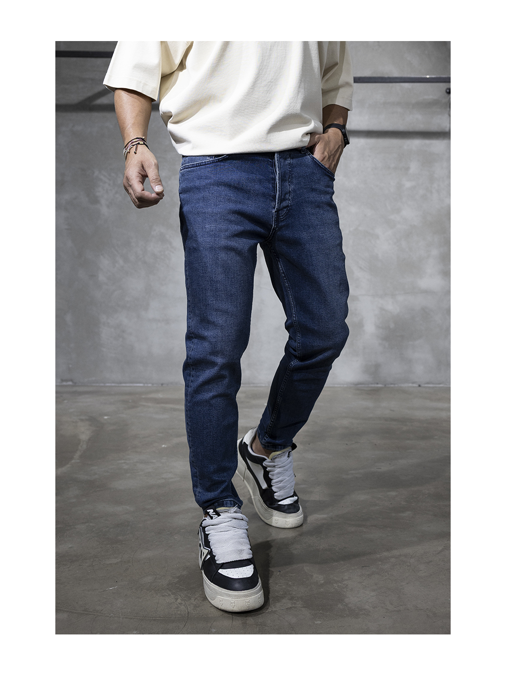 Tmavě modré loose fit džíny s decentním šisováním – moderní základ pro uvolněný, ale čistý městský styl.