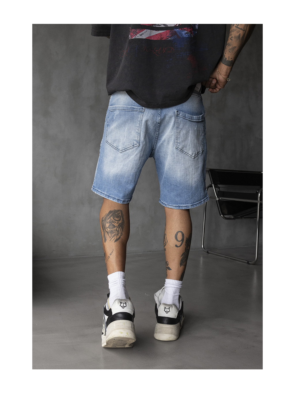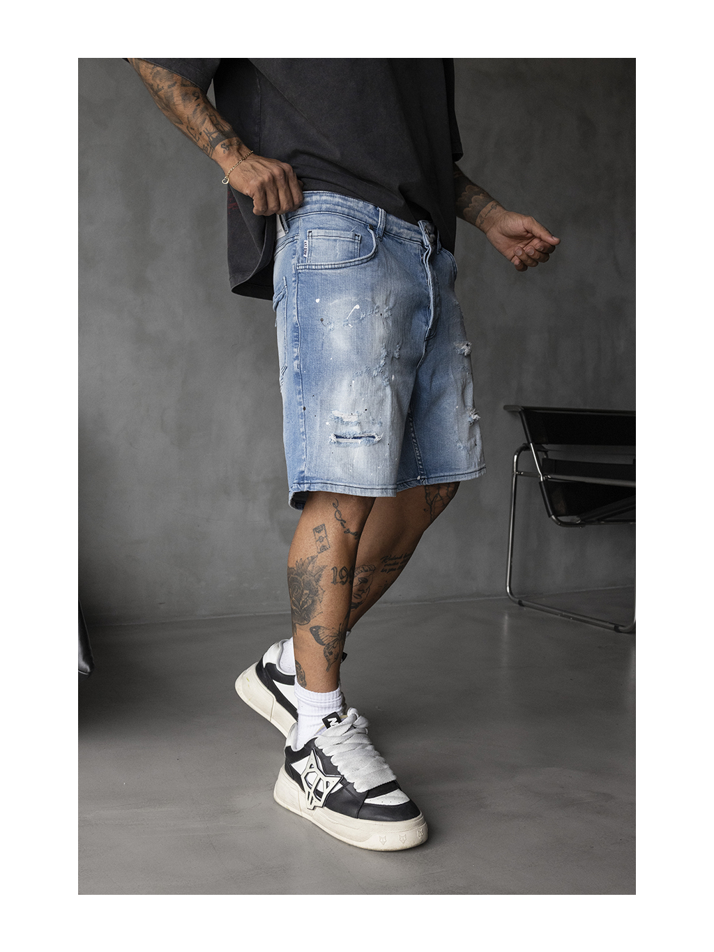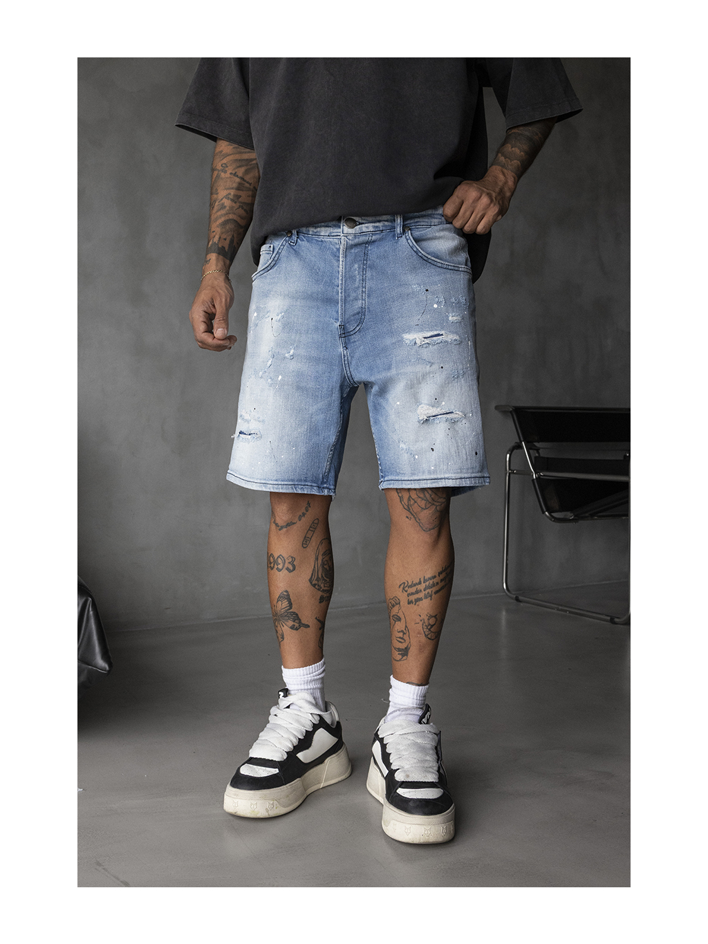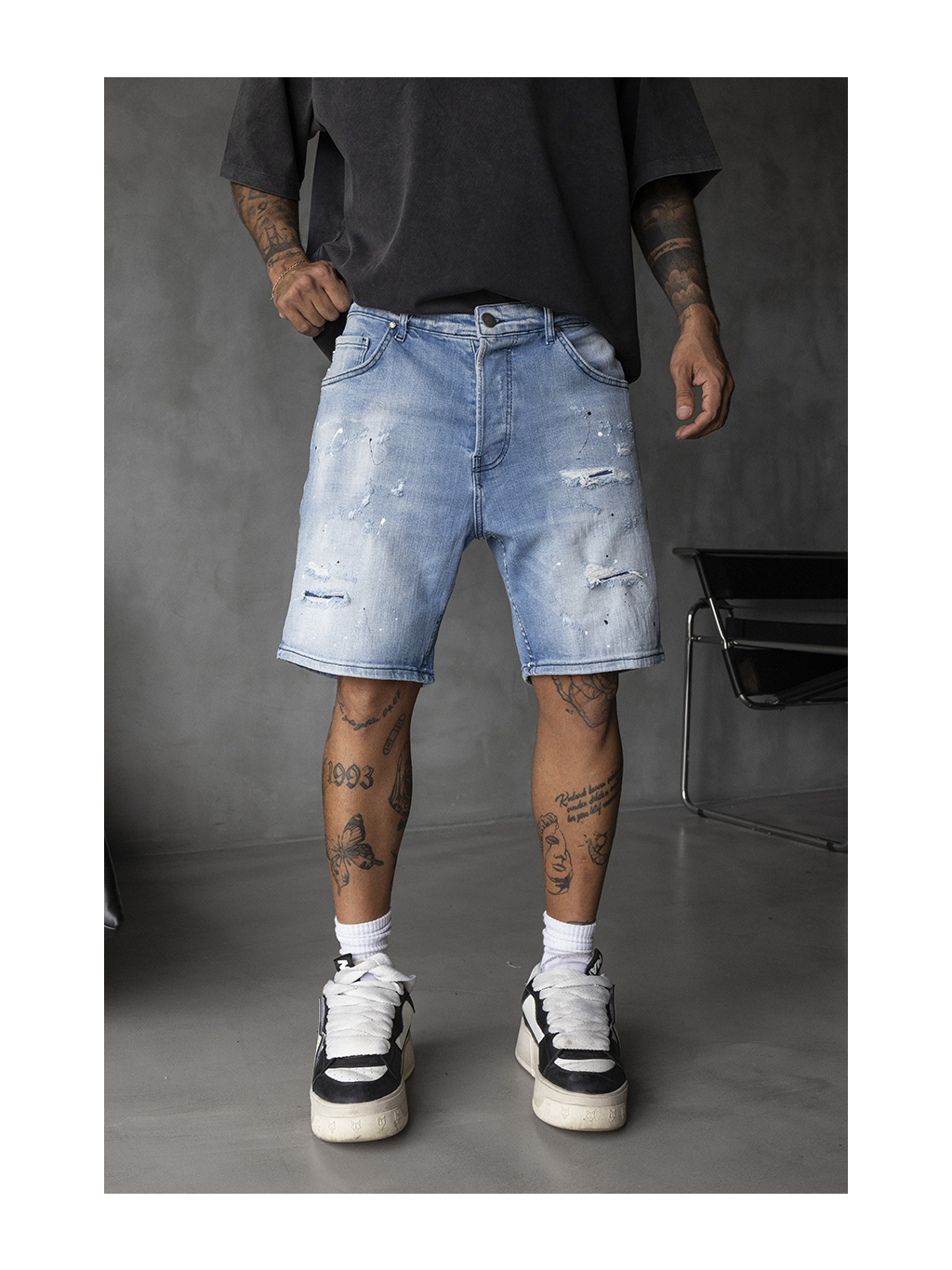Tyto džínové kraťasy ve světlém modrém odstínu jsou stvořené pro ty, kteří se nebojí ukázat svou individualitu. Výrazné trhání, odřeniny a náznaky barevných skvrn vytvářejí autentický „destroyed look“, který dodá každému outfitu správnou dávku rebelského stylu.