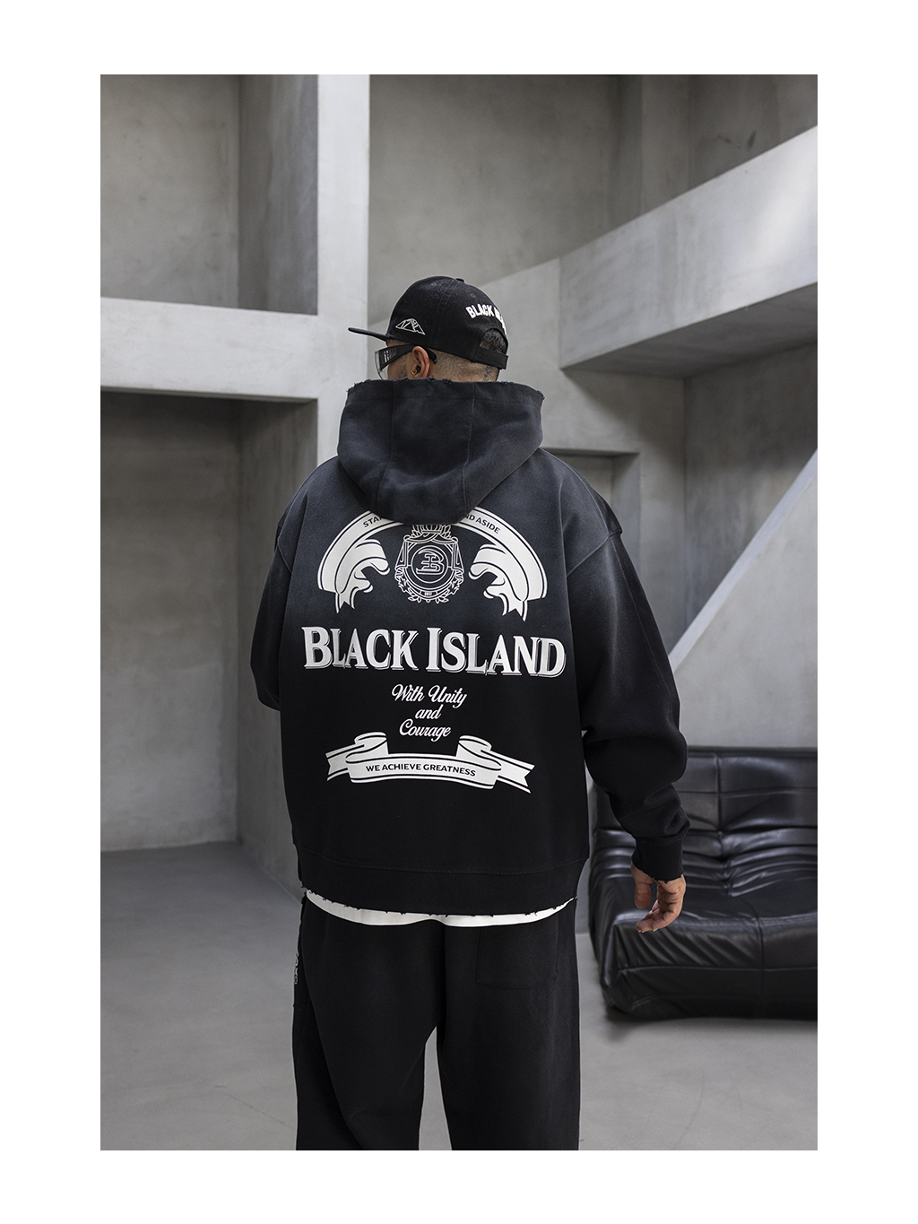 Tato mikina Black Island Unity přináší výrazný streetwear design v tmavém černém tónu s jemným ombré přechodem do šedé. Přední část je minimalistická s decentním logem ISL, zatímco zadní stranu zdobí velký grafický potisk s nápisem Black Island – With Unity and Courage. We Achieve Greatness, který podtrhuje její jedinečný charakter.