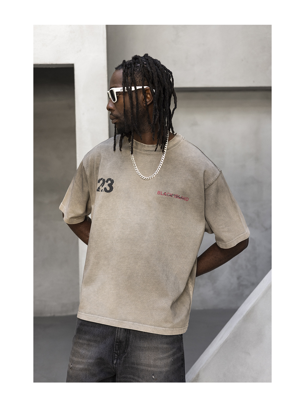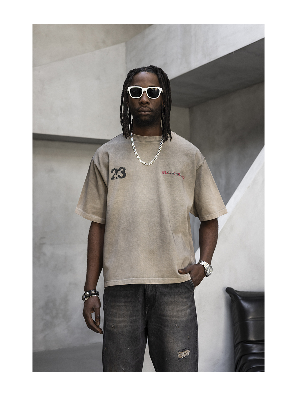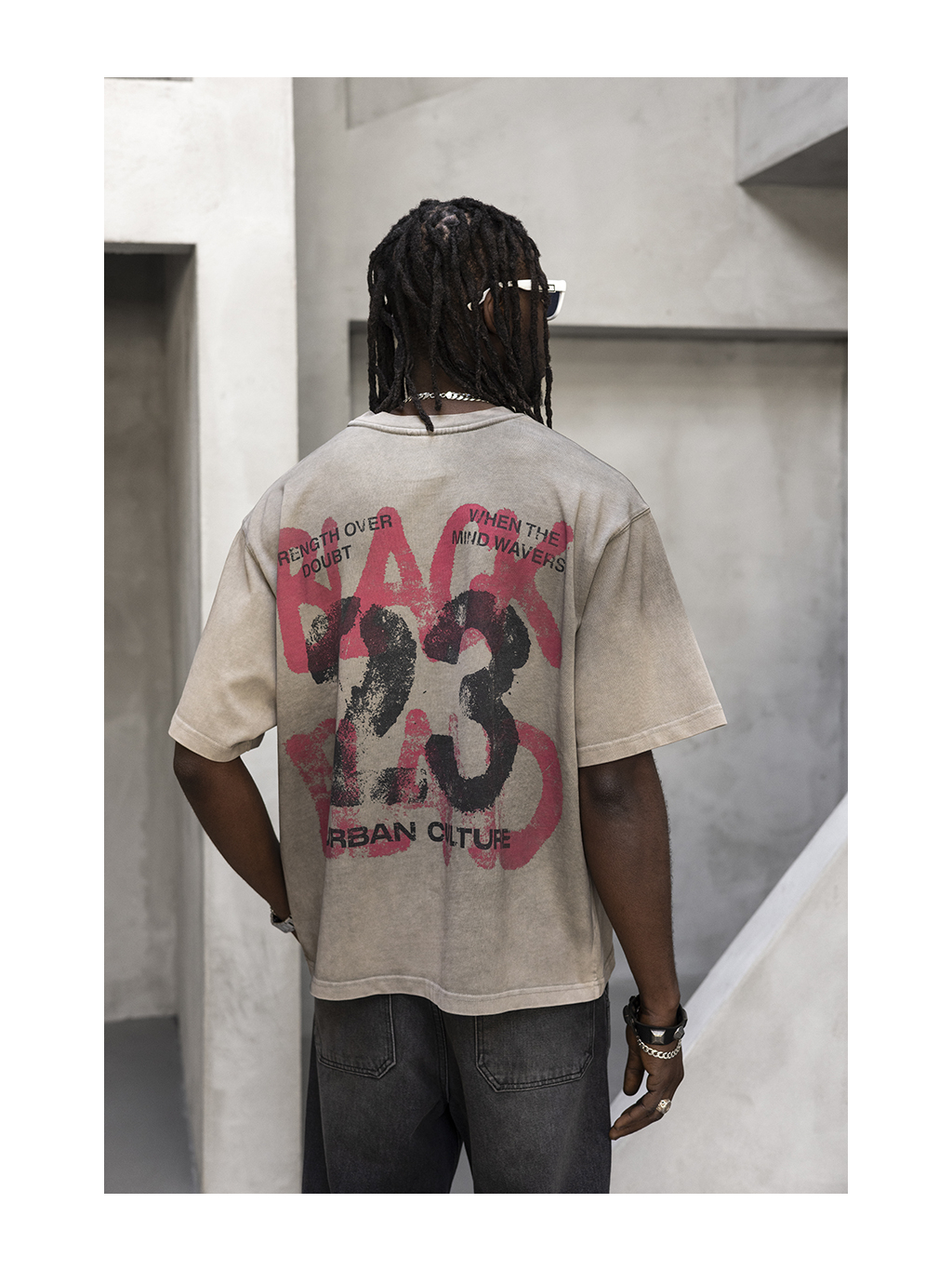 Přední strana je doplněna minimalistickými potisky, zatímco zadní část dominuje výrazná grafika „23“ s urban nápisem, která dodává tričku syrový a sebevědomý výraz. Washed úprava materiálu podtrhuje lehce vintage vzhled a zajišťuje, že každý kus působí originálně.