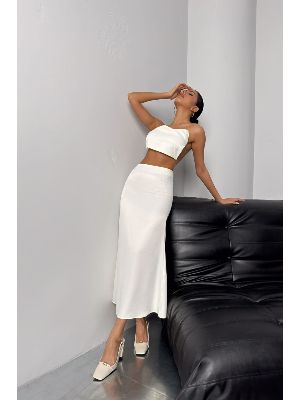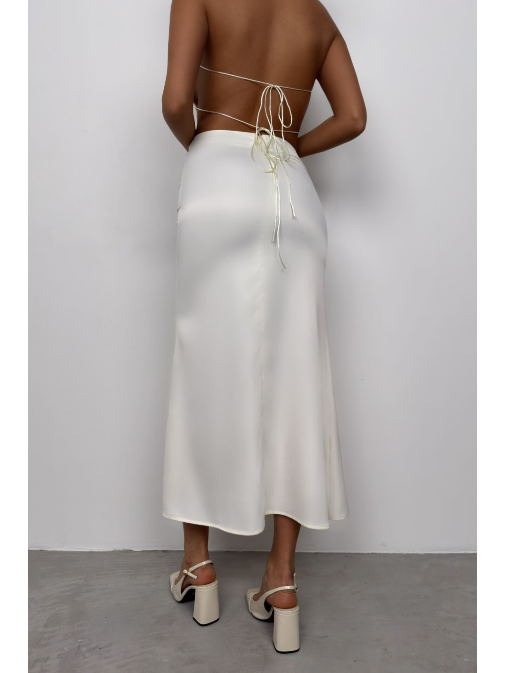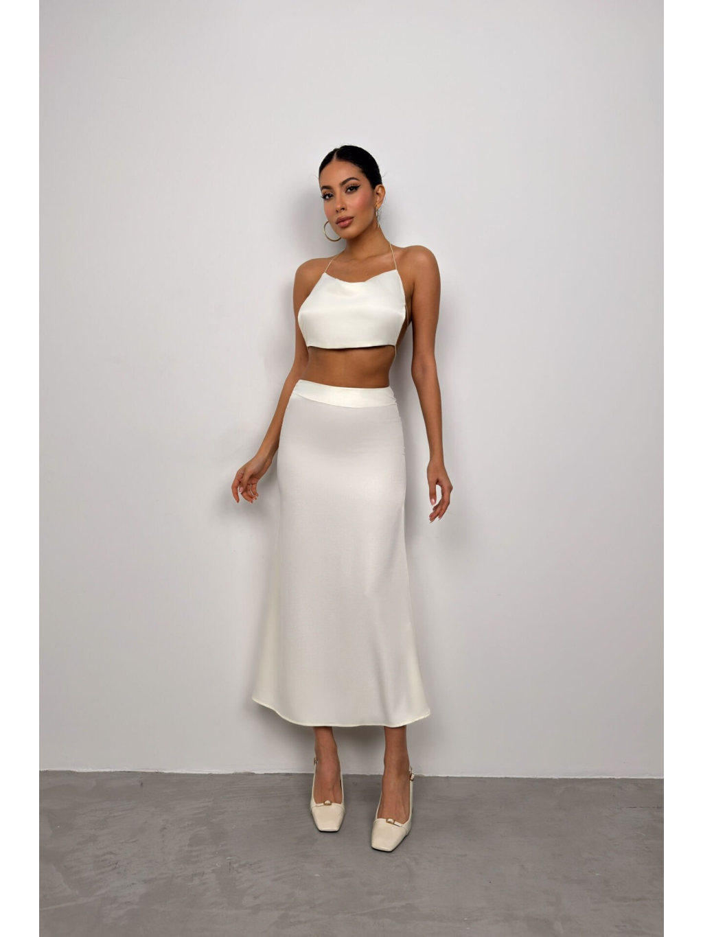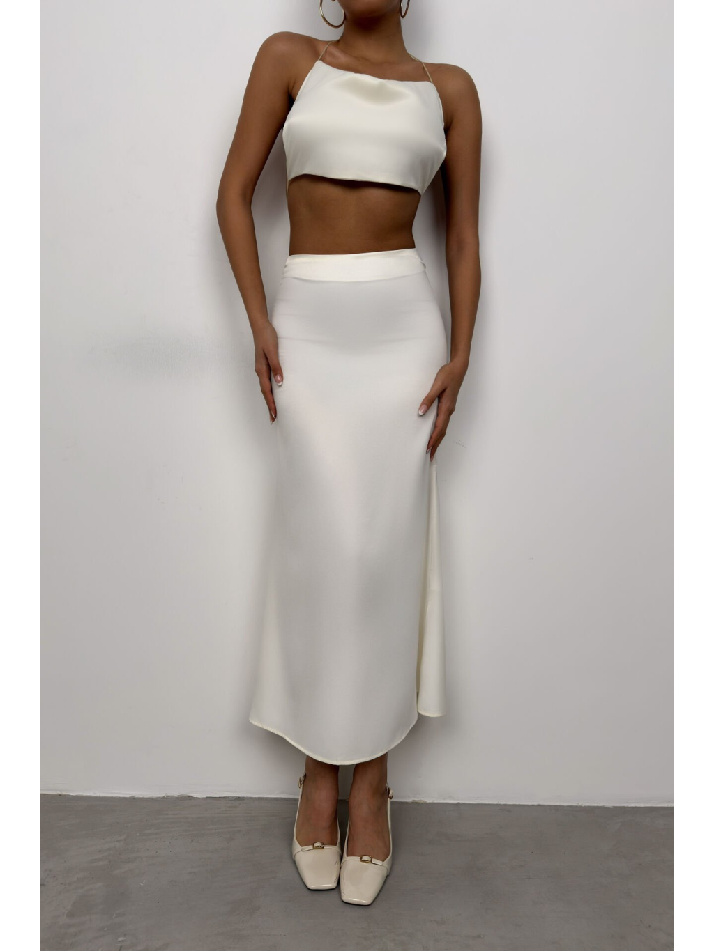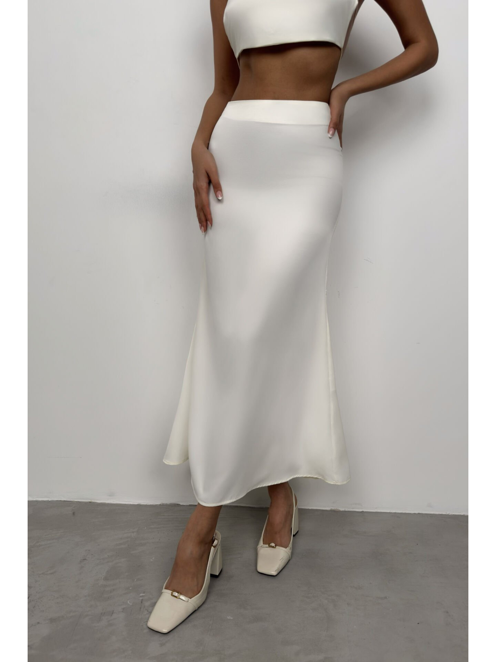 Elegantní saténová sukně v ekru barvě s vysokým pasem a splývavým střihem.