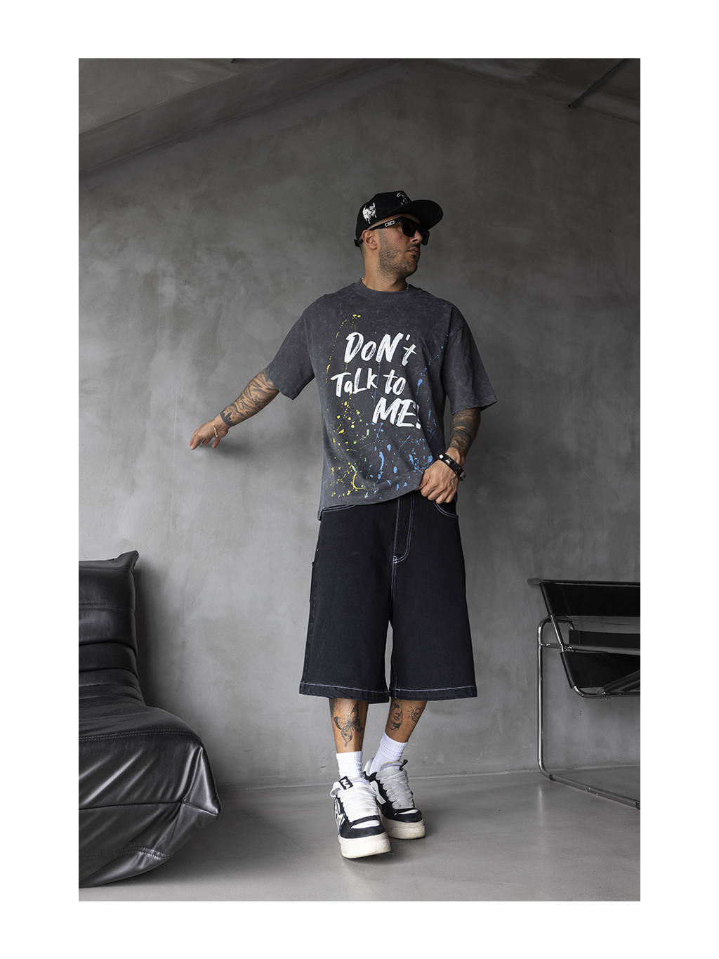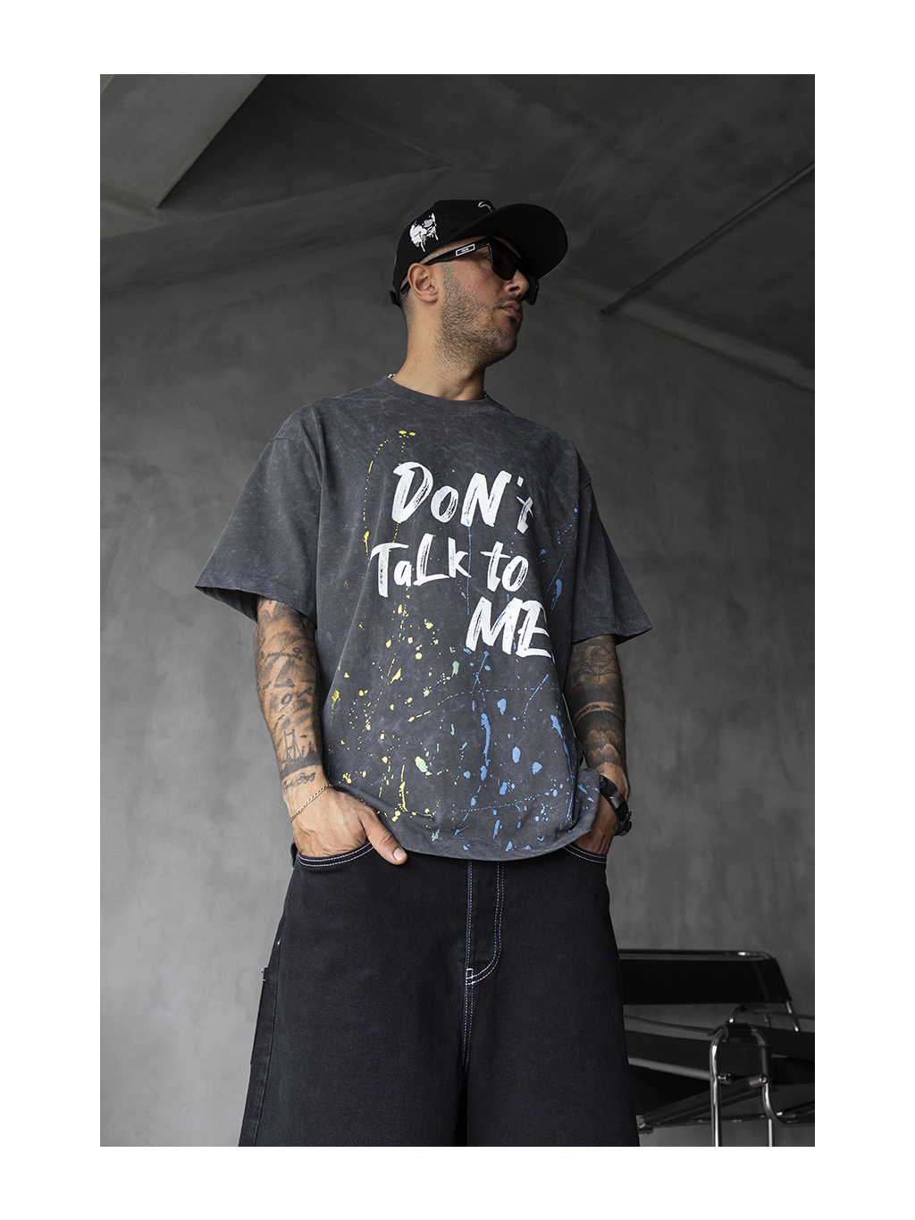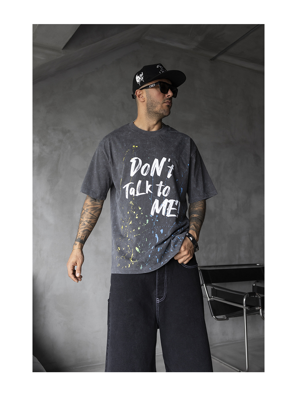 Toto pánské tričko zaujme na první pohled díky výmluvnému nápisu "Don't talk to me!" a kontrastním barevným cákancům ve žluté, modré a zelené barvě. Antracitový základ s vintage efektem dodává celému designu rebelský a stylově opotřebovaný vzhled.